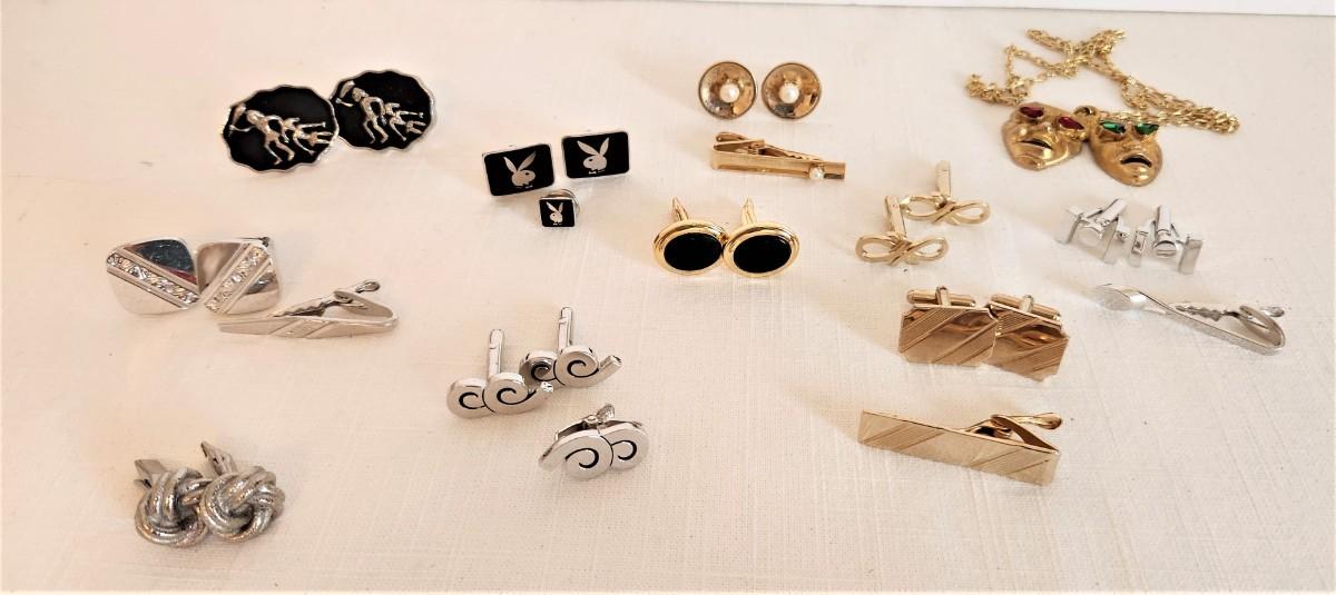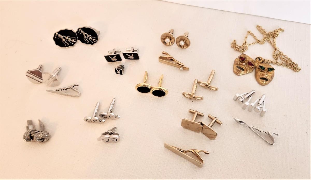 Ten pairs of vintage cufflinks - some have tie bars, as show. Includes a pair of vintage PLAYBOY cufflinks with tie tack. All in good condition.