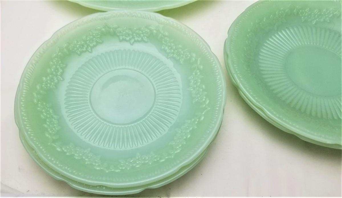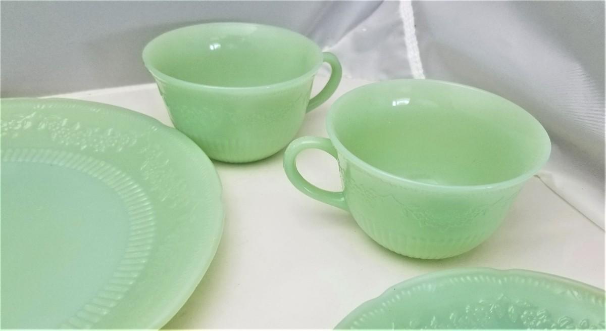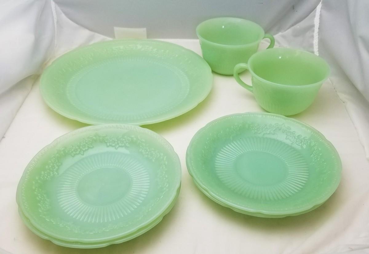 You get all you see here - grouping of vintage Jadite-type kitchenware. 1 plate (9" across), 2 cups/saucers, 2 single saucers. 7 pieces in all - all in good condition.