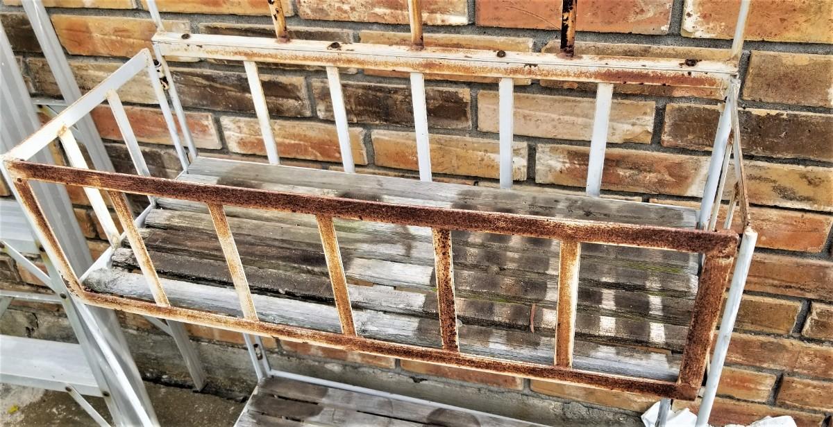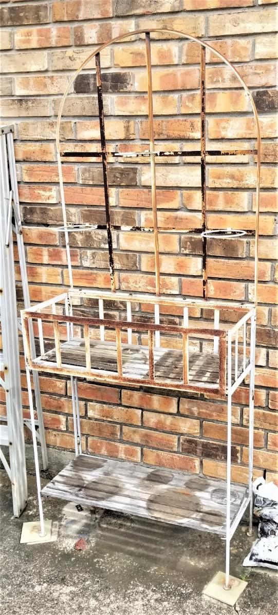 Vintage Metal Plant stand - nice and "chippy" - 29" across, 12" deep, about 68" tall. Will look great on your patio.