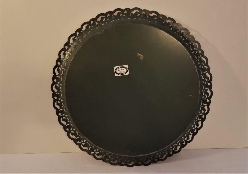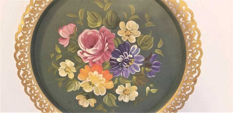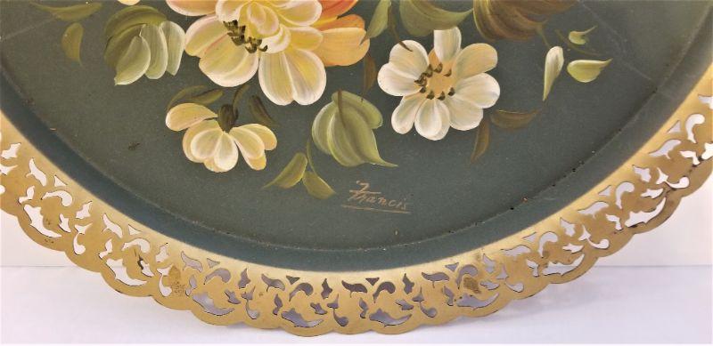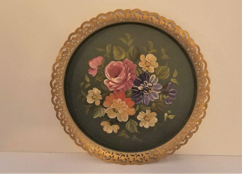 Nice vintage painted Tole tray - signed. Very popular in the 60's and '70's. Good vintage condition - 15" across.