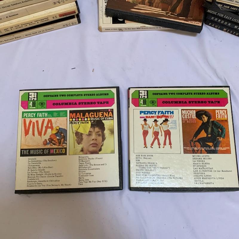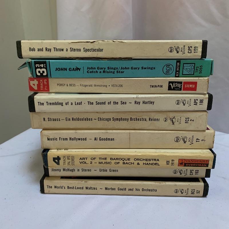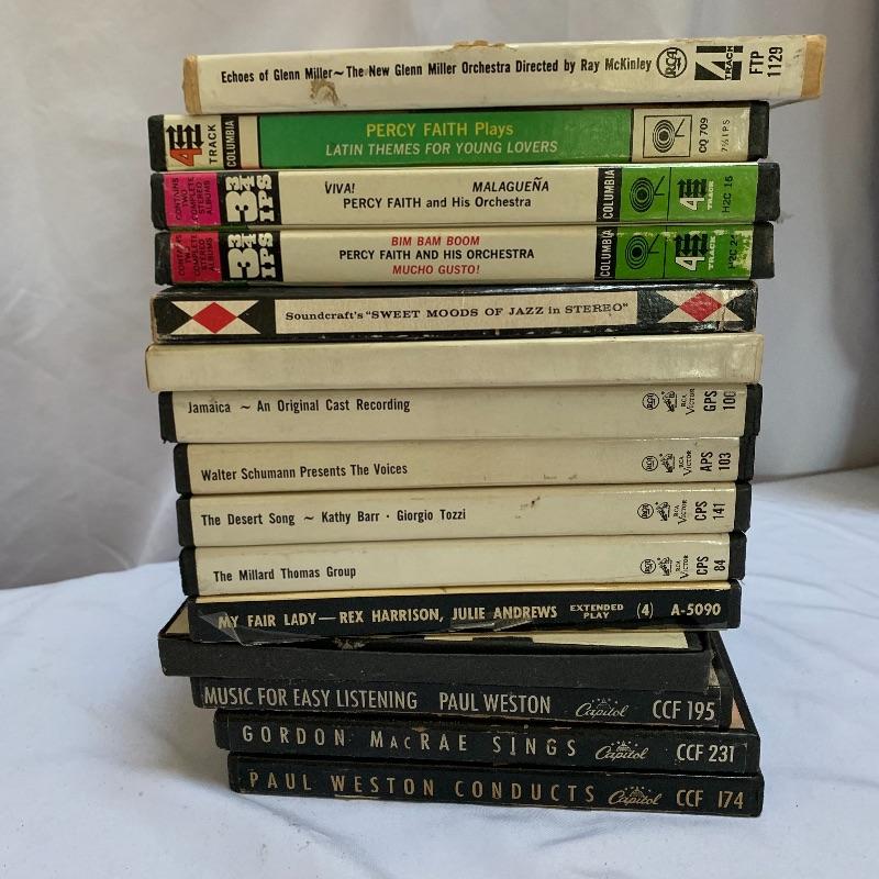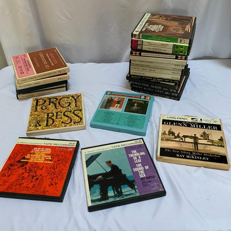 Travel back in time with vintage reel to reel recordings. This lot includes recordings by best selling artists such as Glean Miller, Percy Faith, and John Gary. There are a total of 24 reels, and good condition overall. Shipping available.