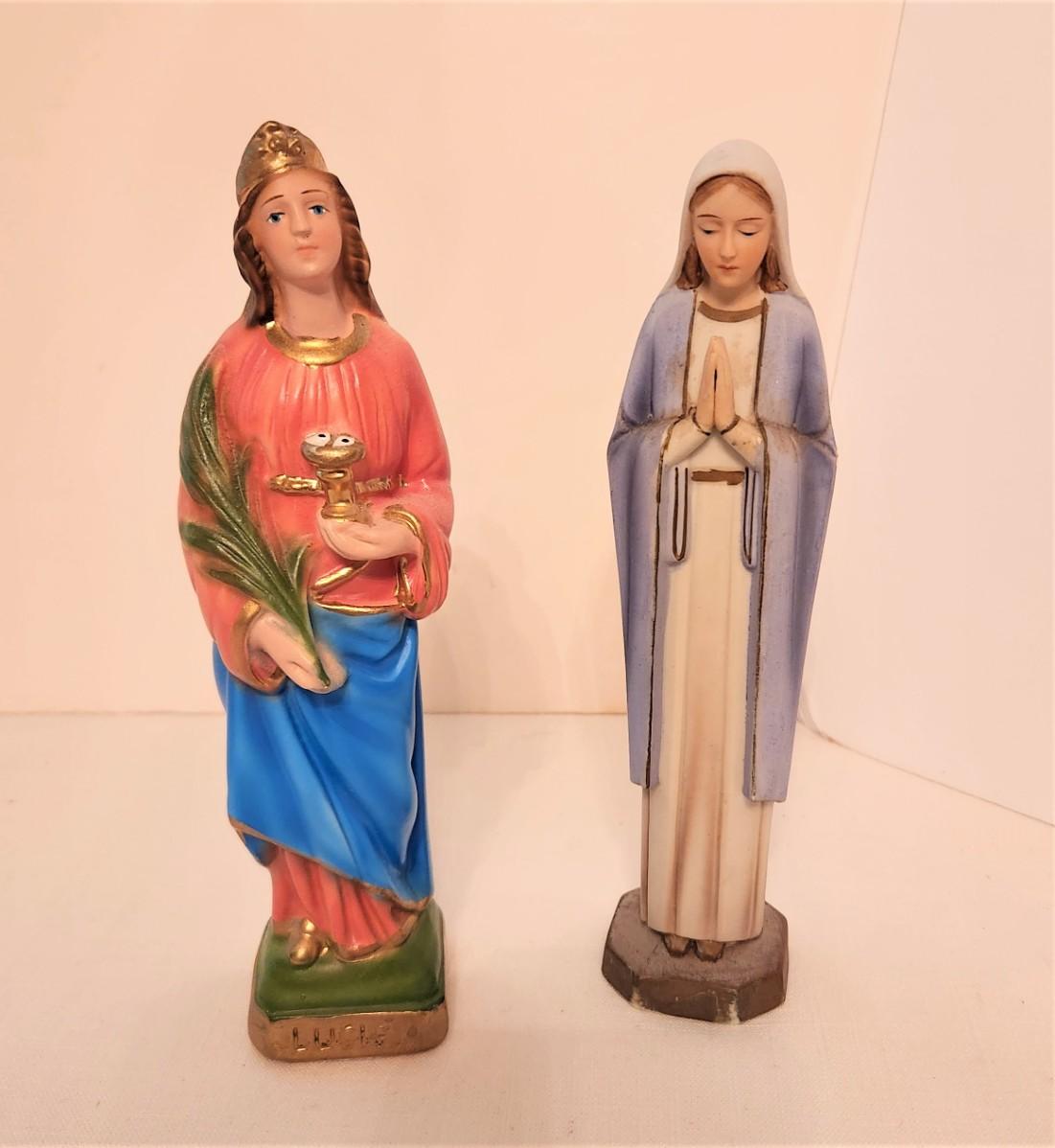 Lot of 2 vintage religious statues - St. Lucy is plaster and Virgin Mary bisque china. Both stand 8" tall, good condition.