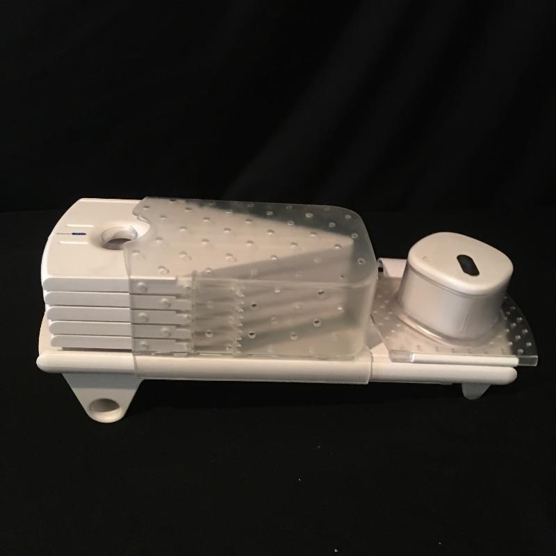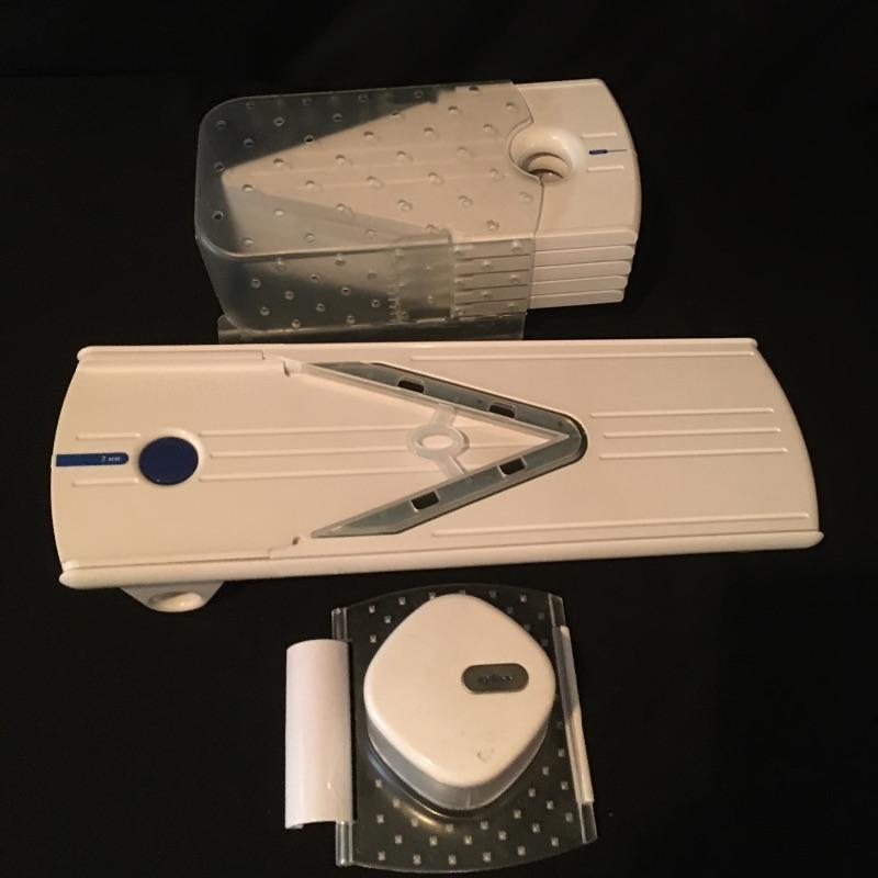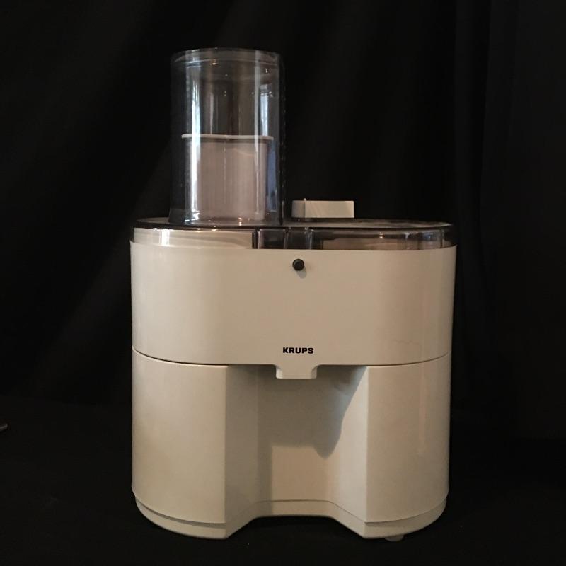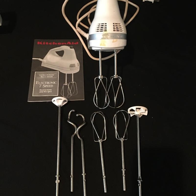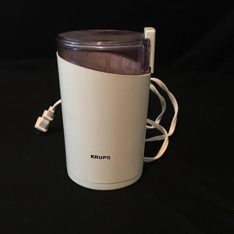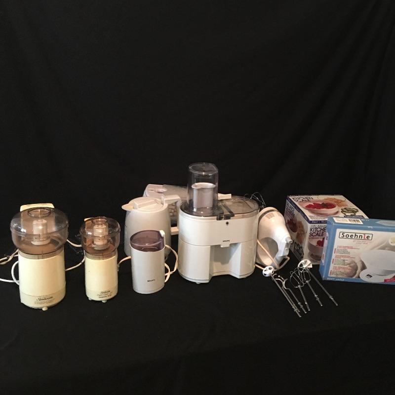 Appliance lot includes includes Krup food processor and coffee grinder, pair of Sunbeam choppers, KitchenAid mixer, Zyliss mandolin, pair of kitchen scales and thermal carafe. All of these will blend in well in your white kitchen