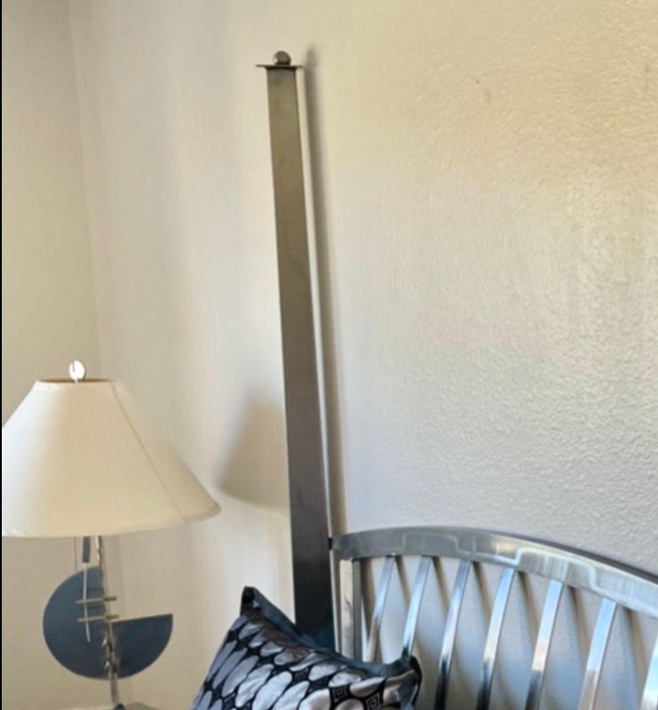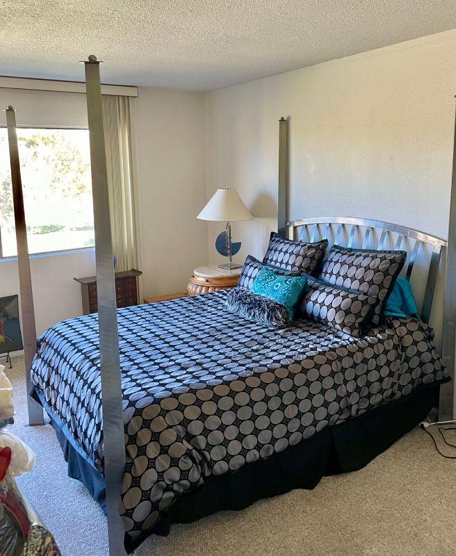 THIS LOT DOES NOT INCLUDE BEDDING OR MATTRESS SEEN IN THIS PICTURE. AUCTION IS FOR QUEEN SIZE METAL FOUR POST BED HEAD BOARD, FOOT BOARD AND FRAME ONLY