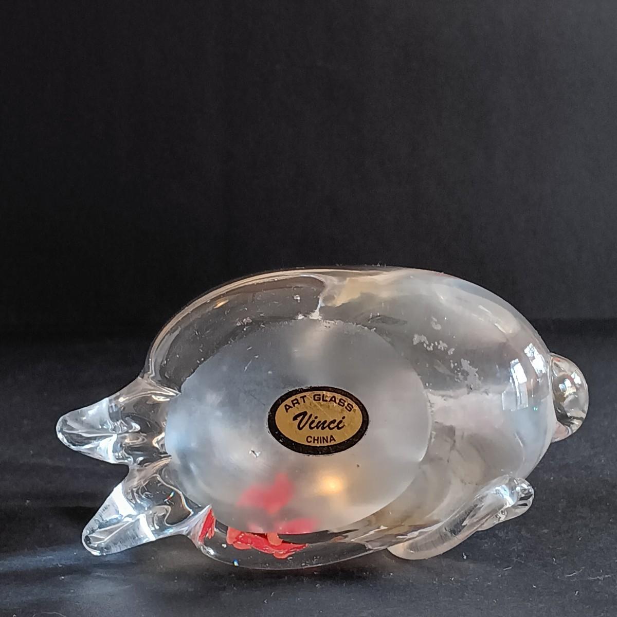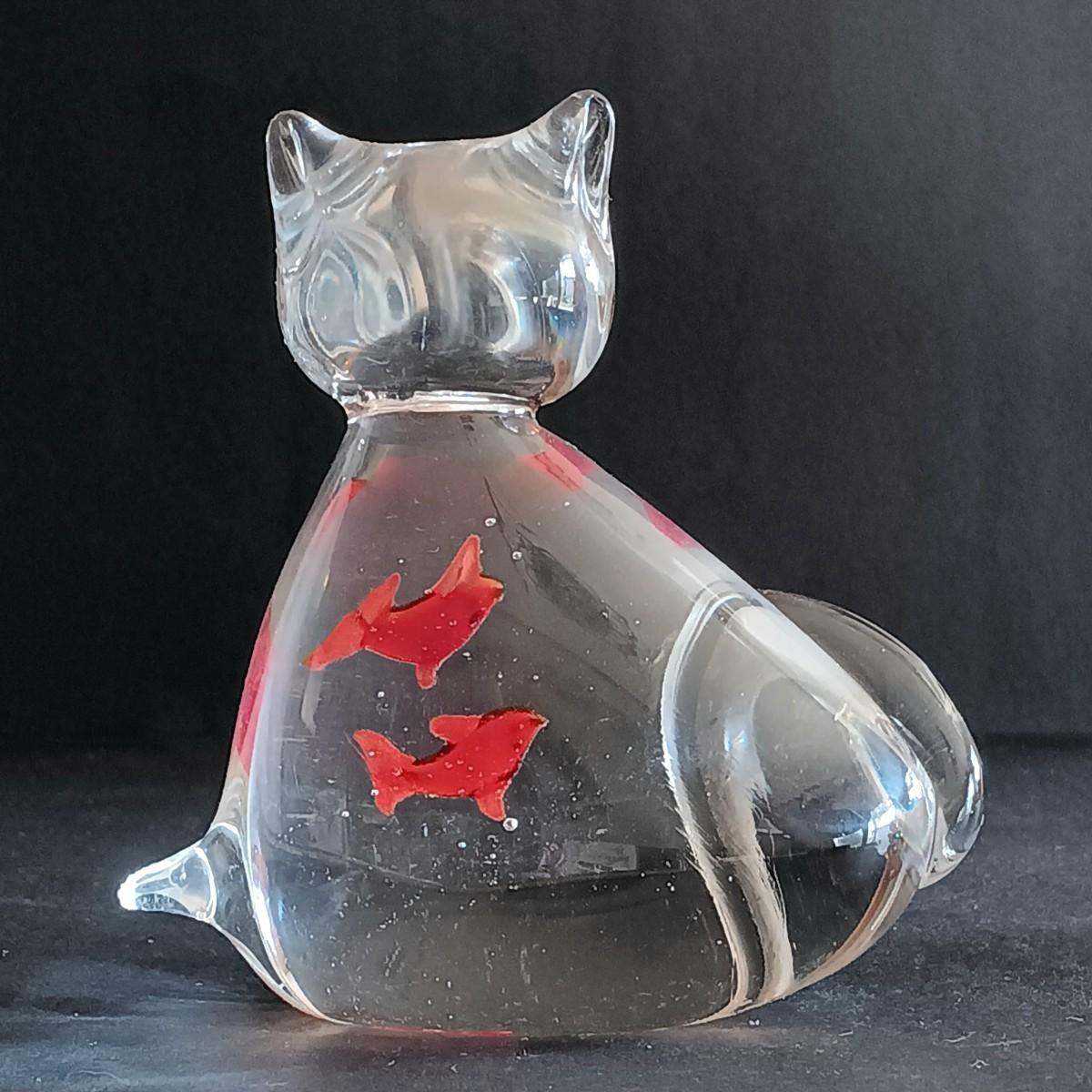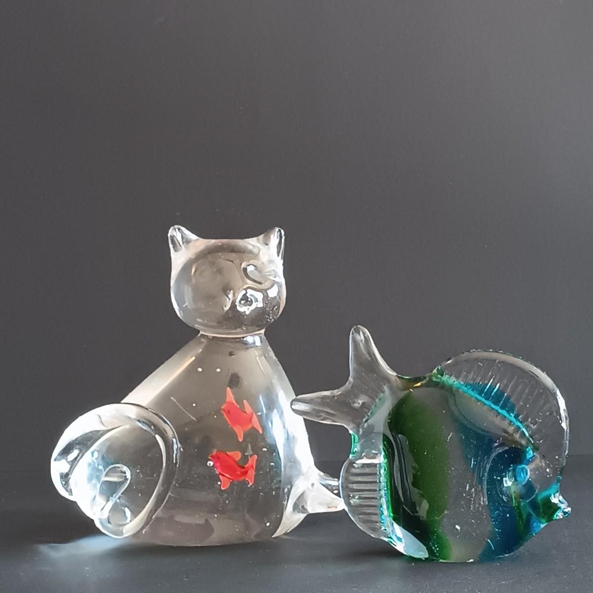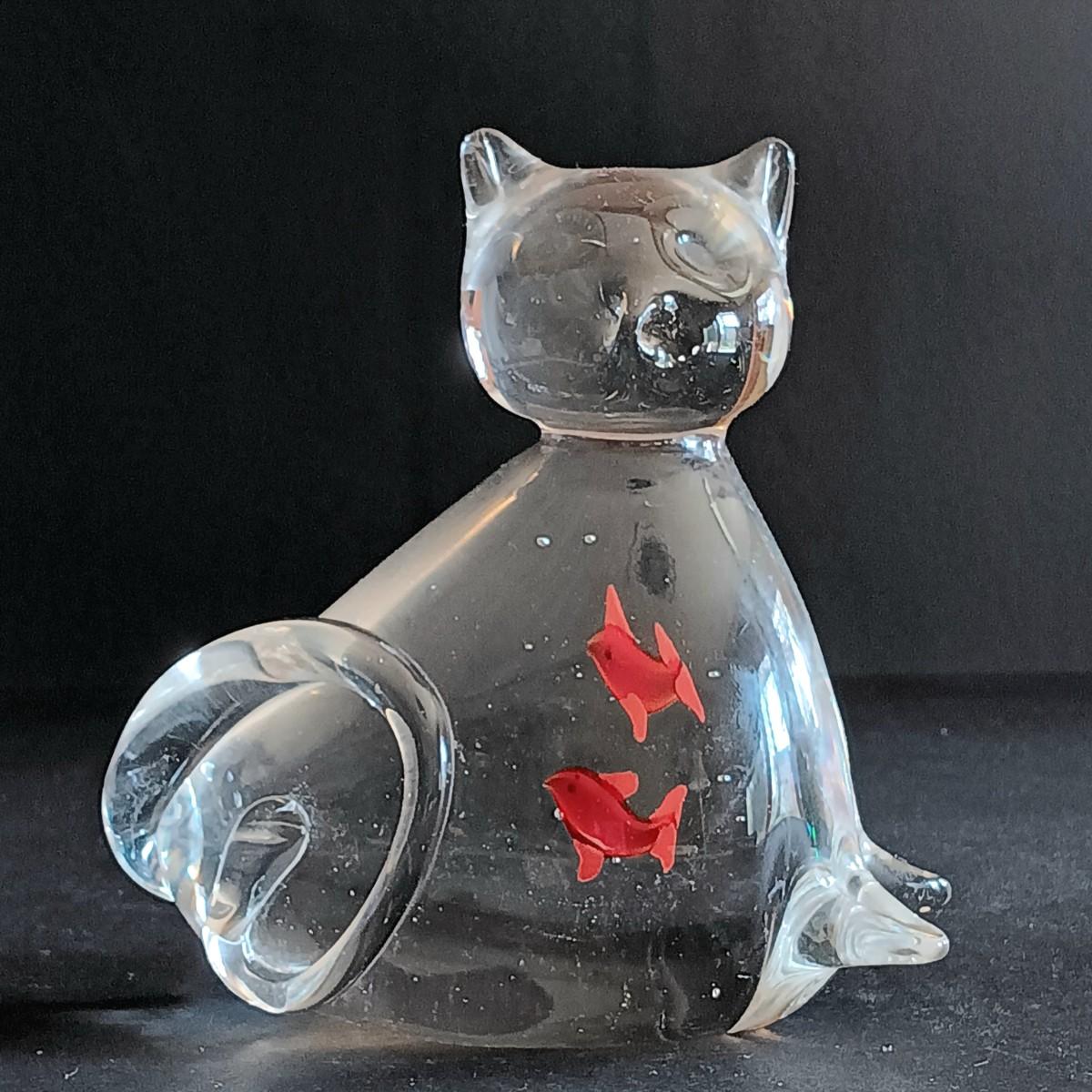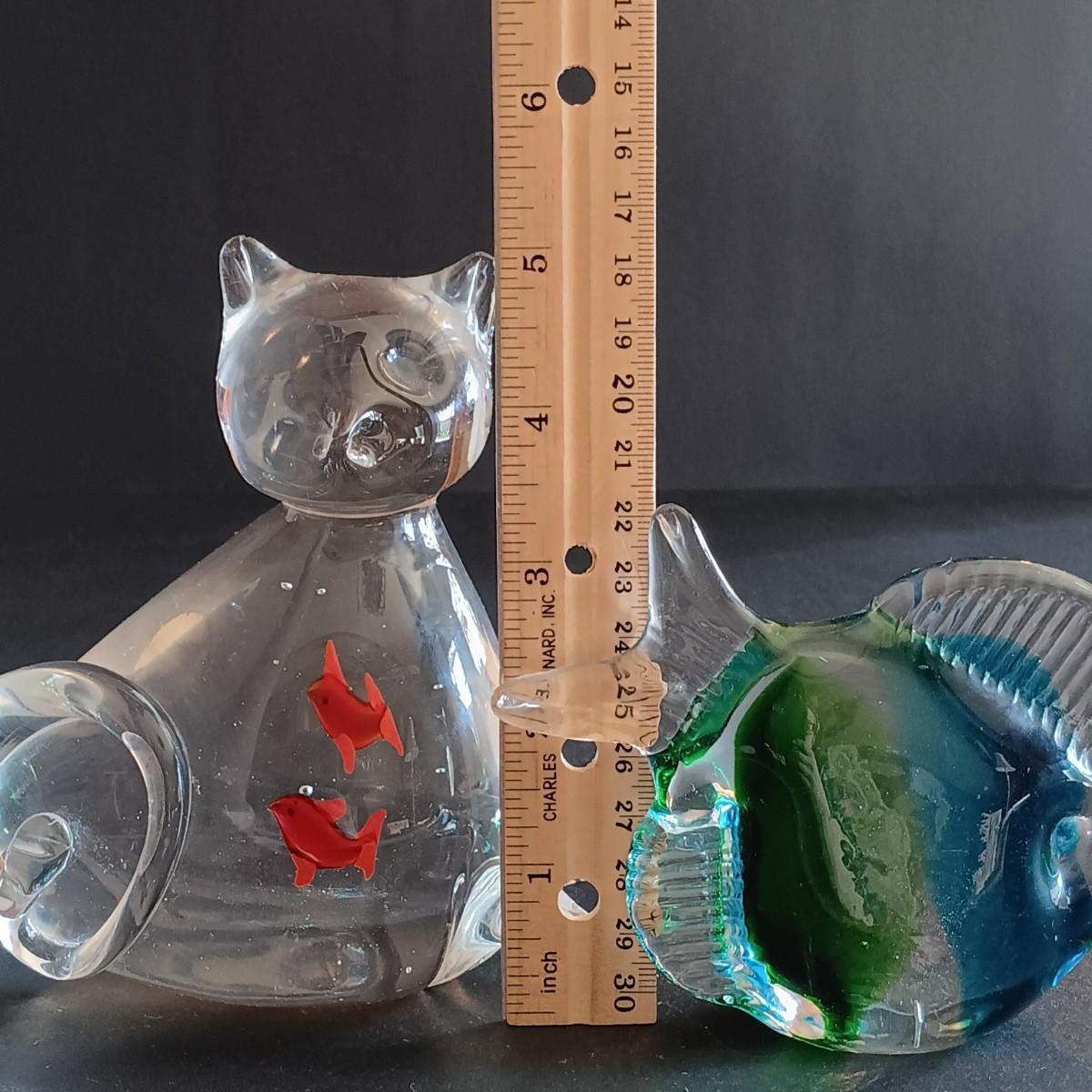 LOT 18: Vintage Art Glass Collection - Vinci Clear Glass Cat with Swimming Fish & Blue and Green Shaded Glass Fish