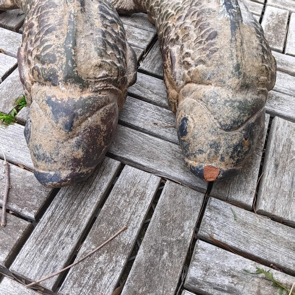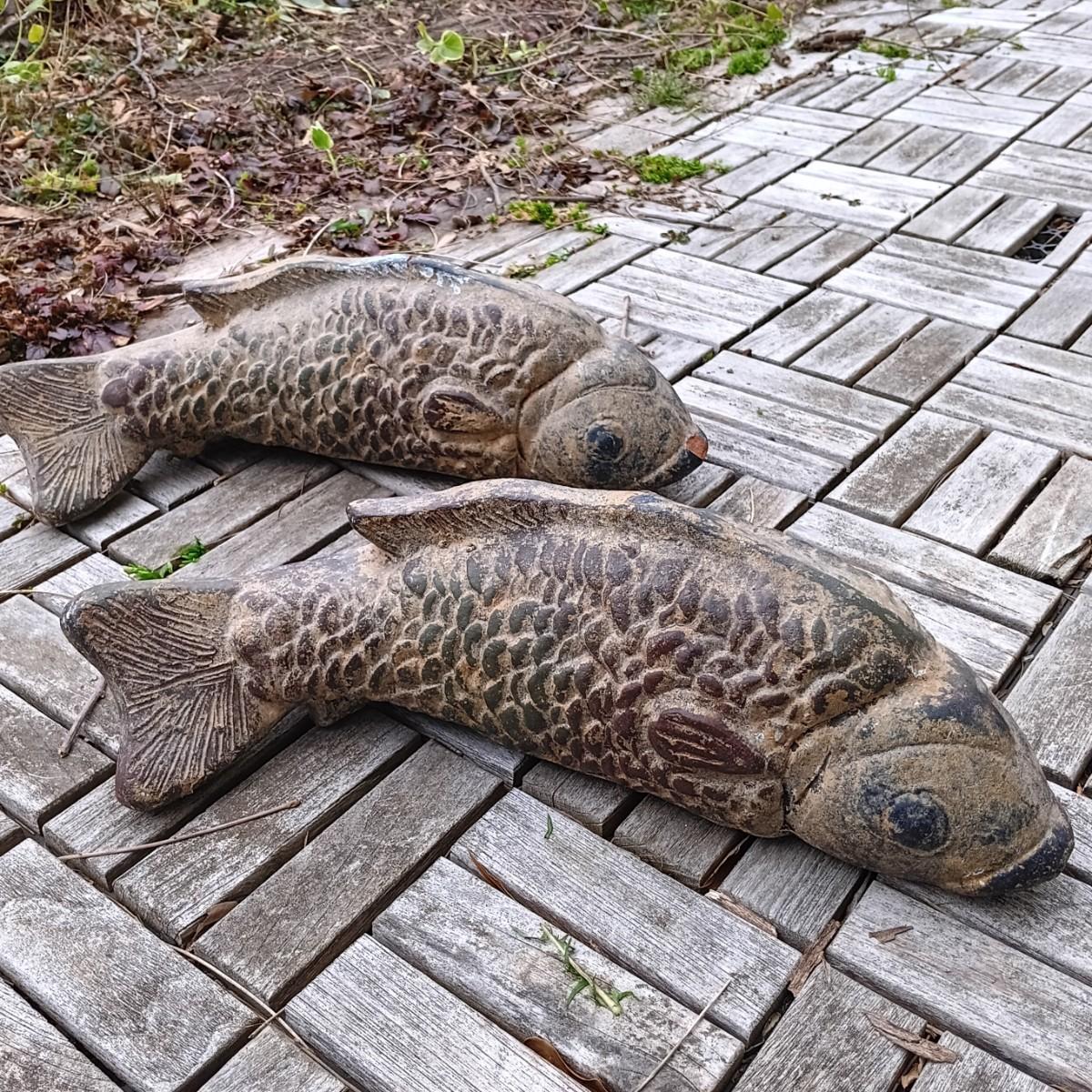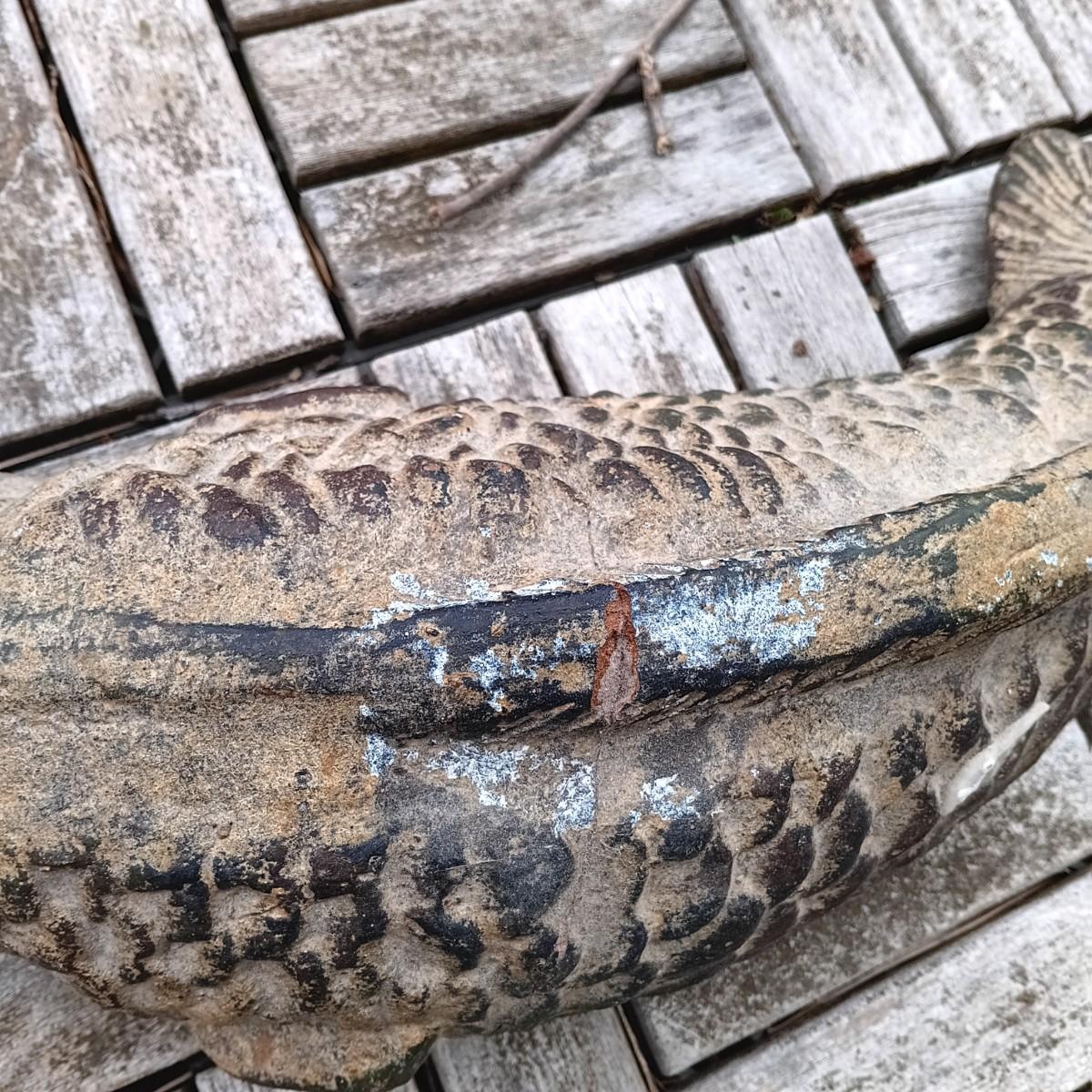 One of the carp statues was broken at some point and repaired by the previous owner.