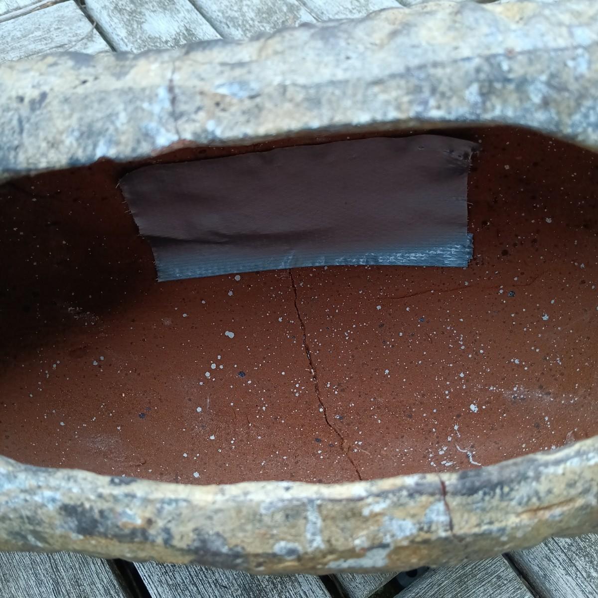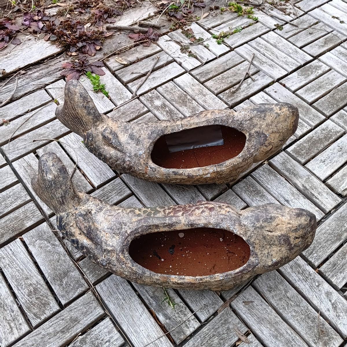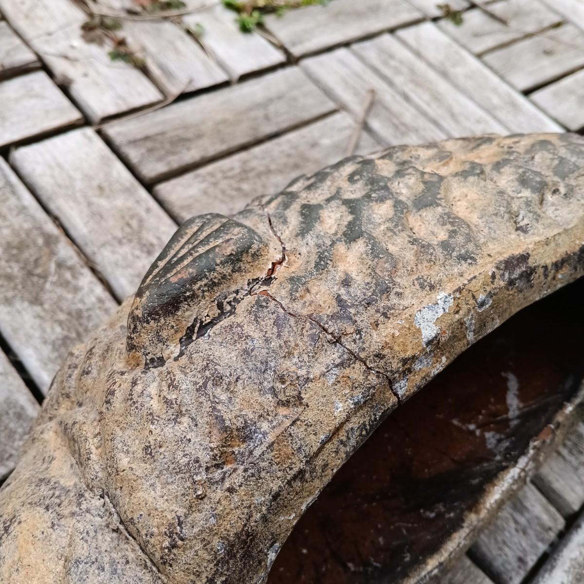 One of the carp statues was broken at some point and repaired by the previous owner.
