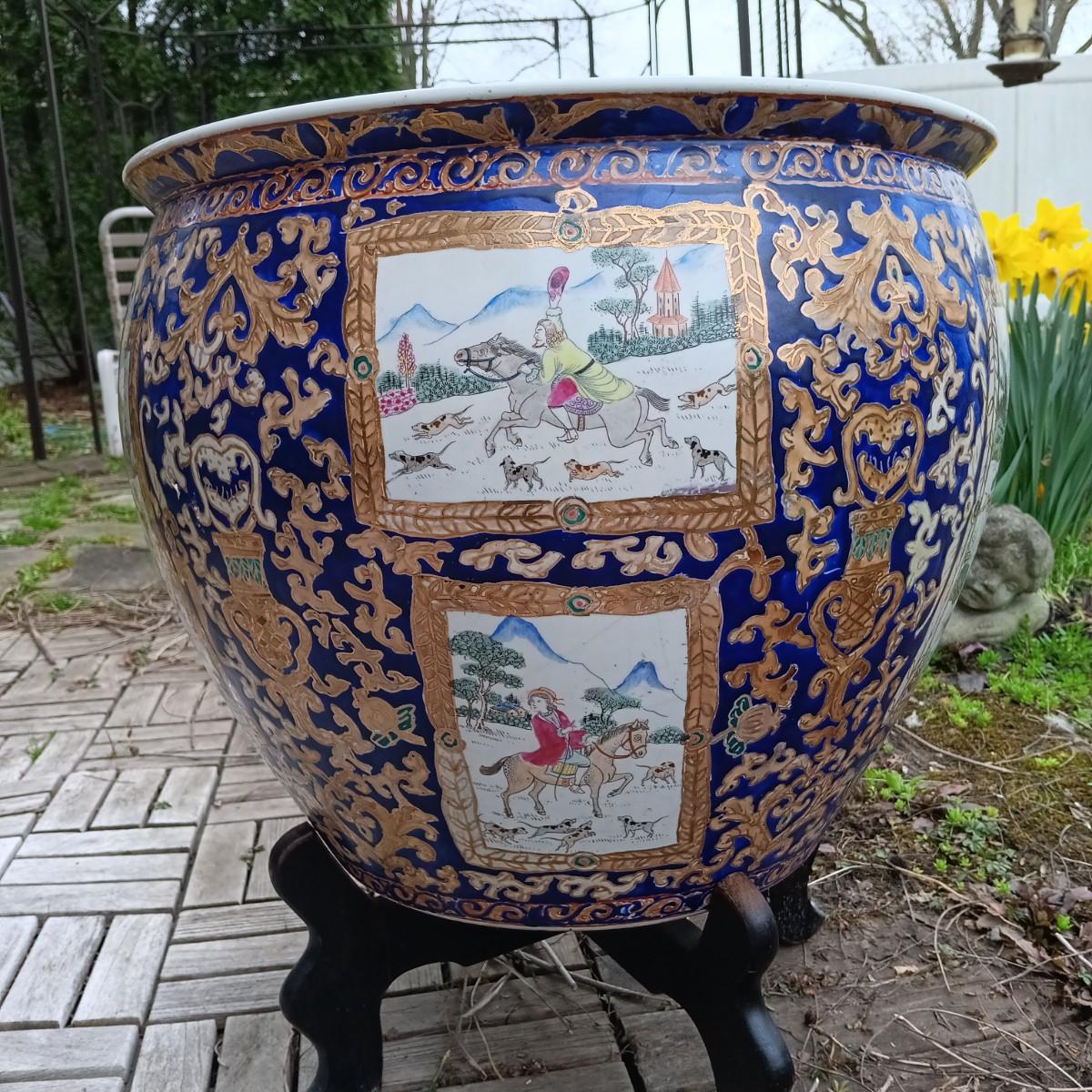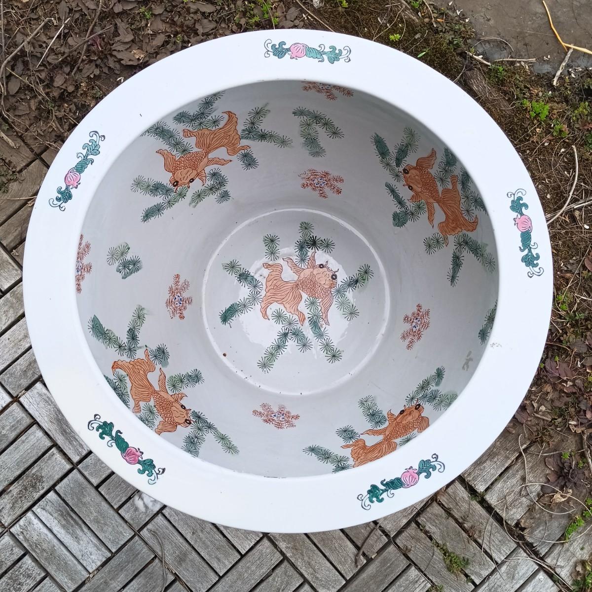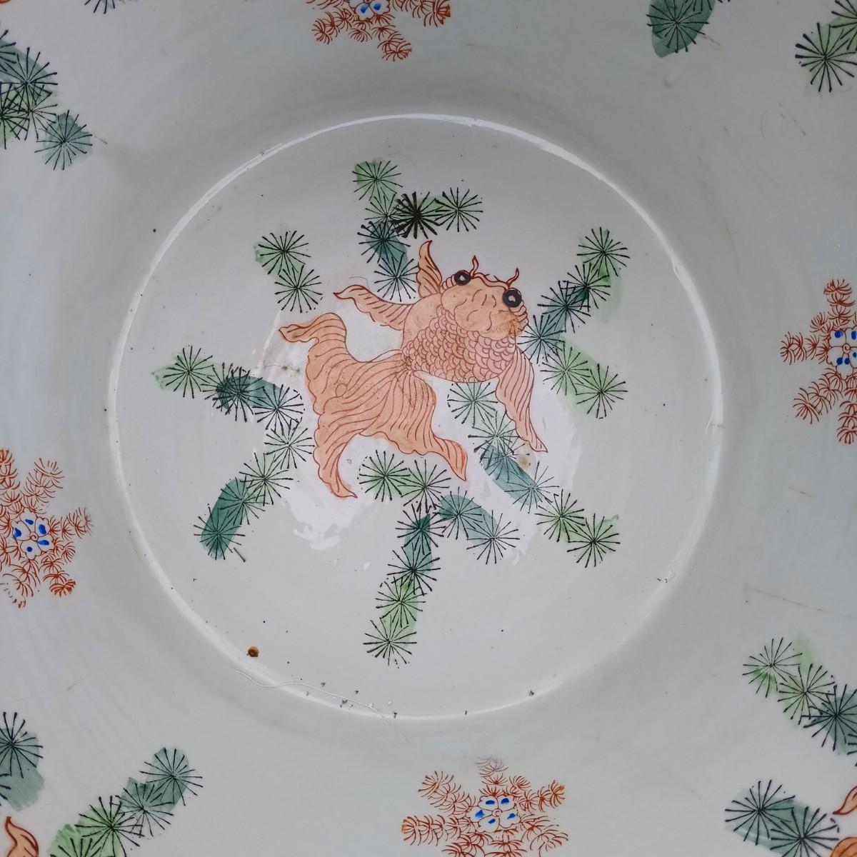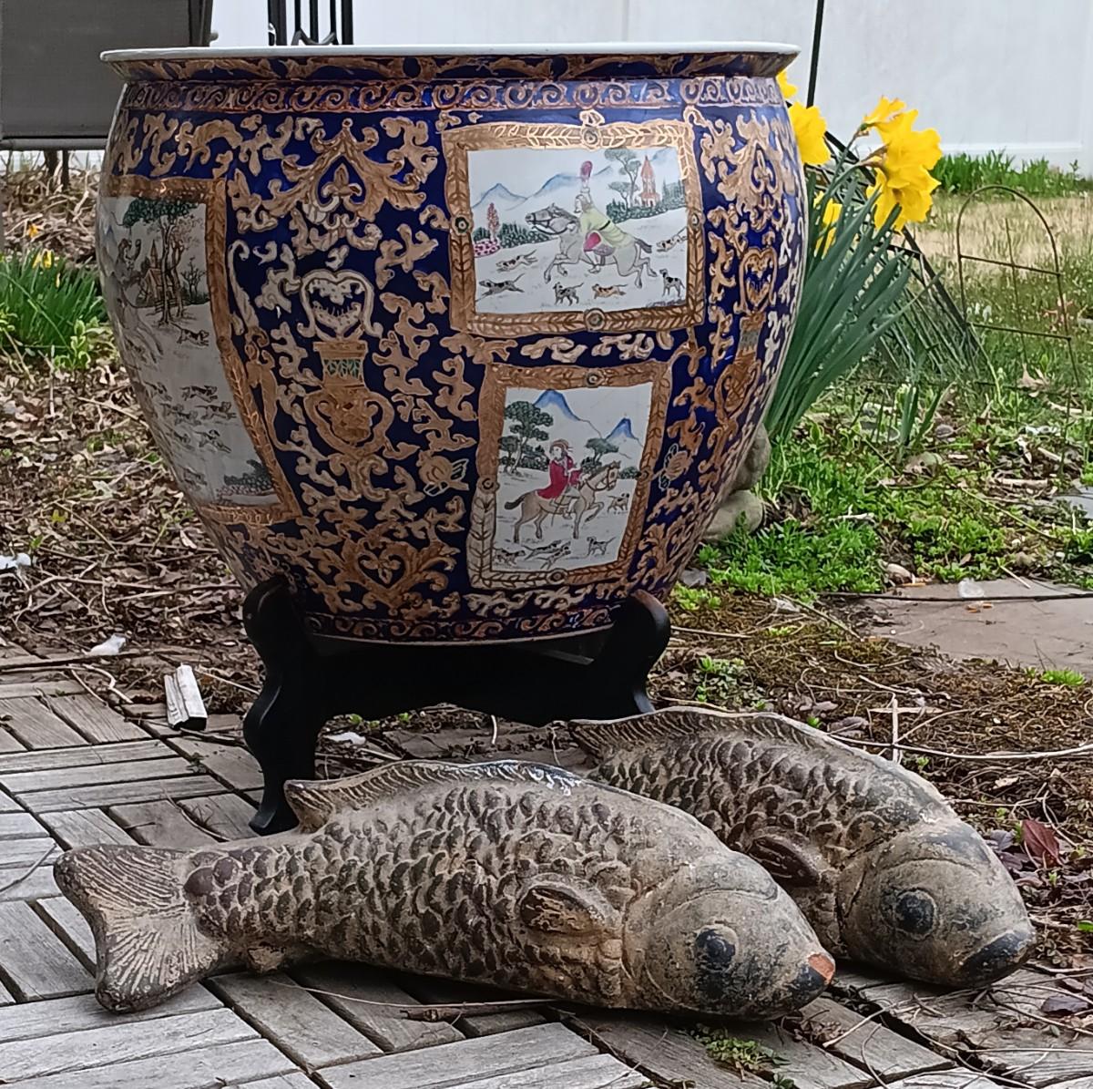 LOT 27: Large Chinese Porcelian Fishbowl with Clay Carp Statues
