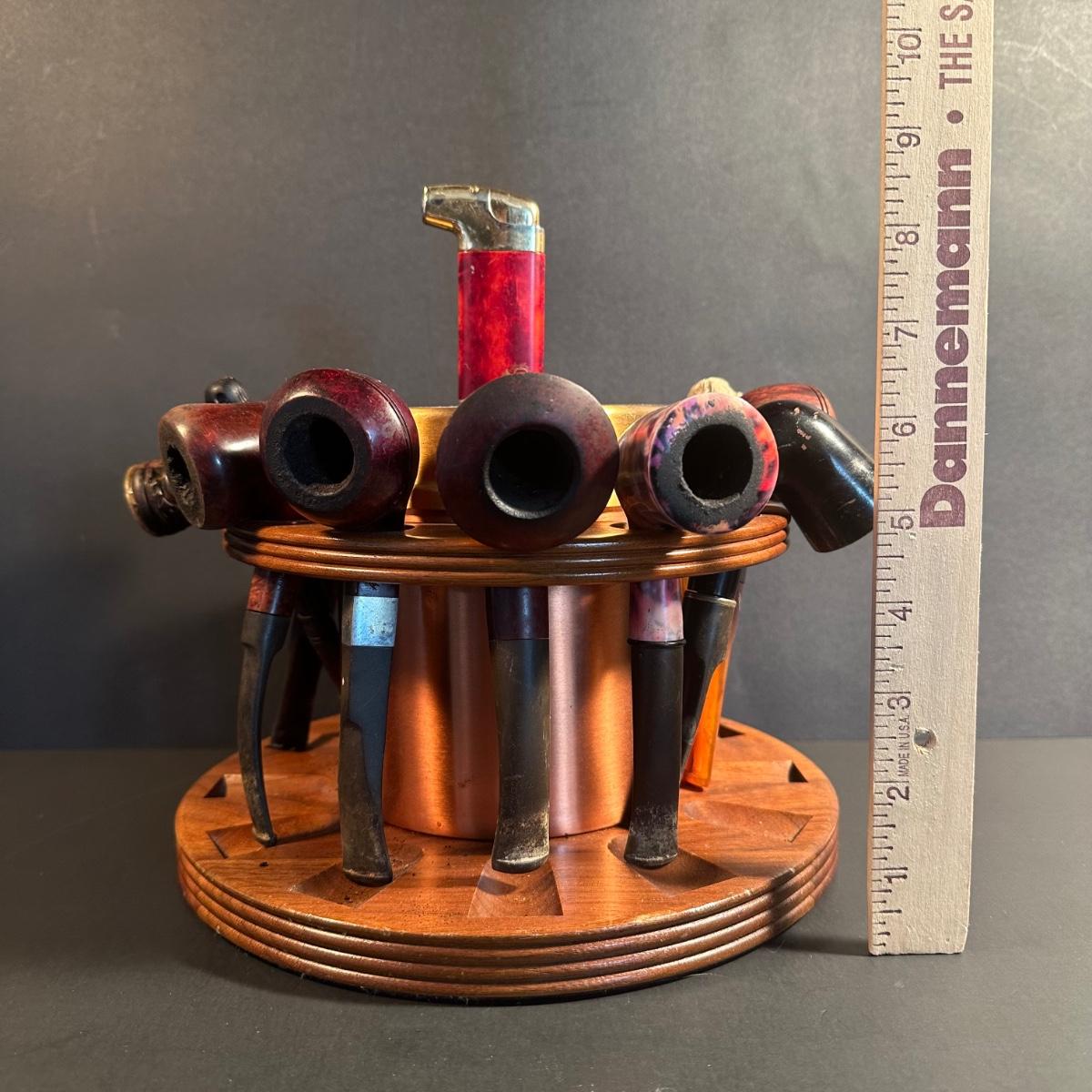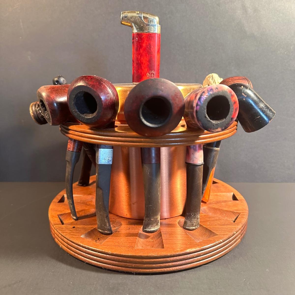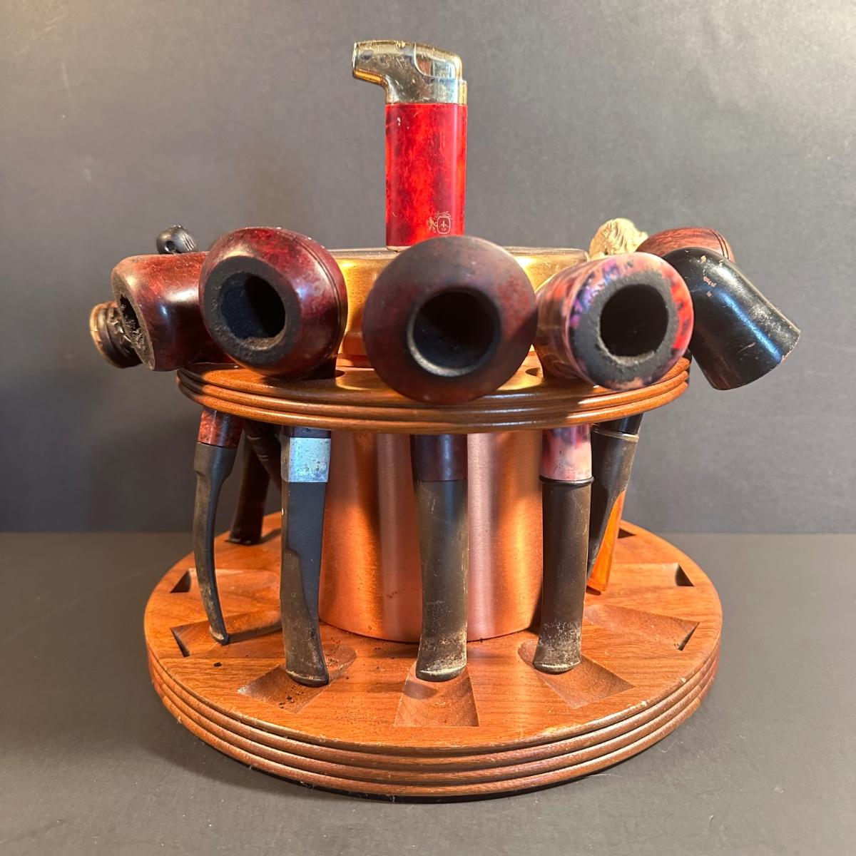 LOT 28: Vintage McDonald Products DUK-IT Walnut 12 Pipe Rest w/ Central Copper Humidor & 9 Pipes