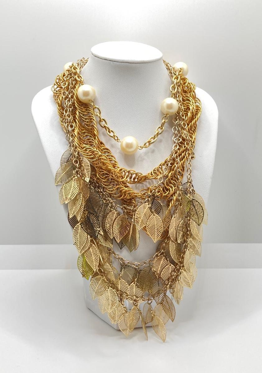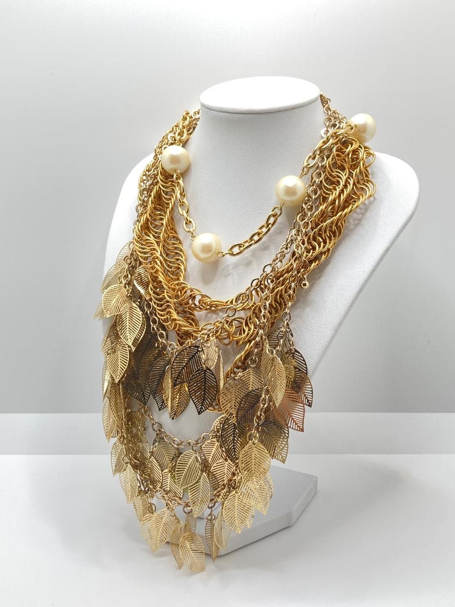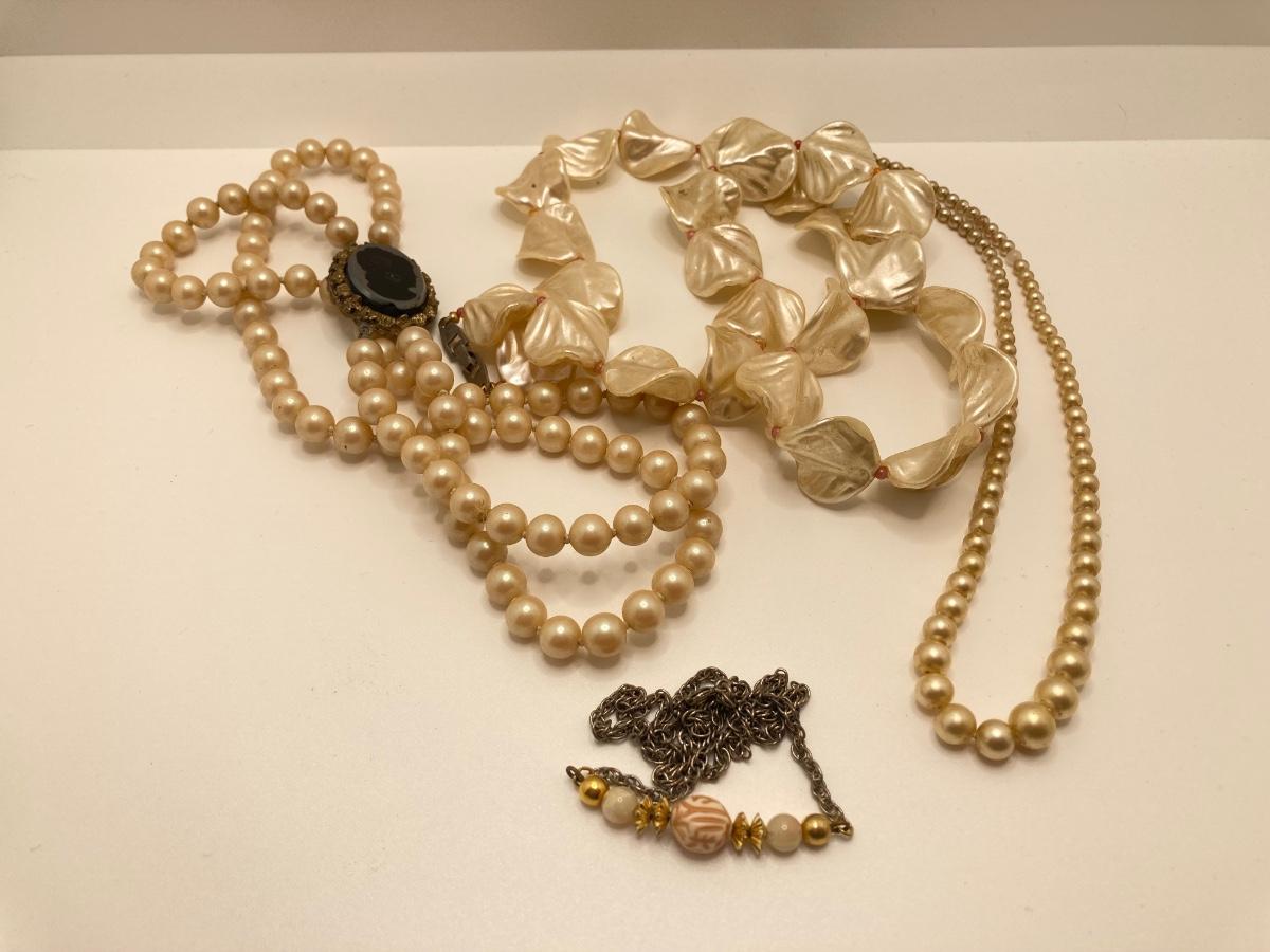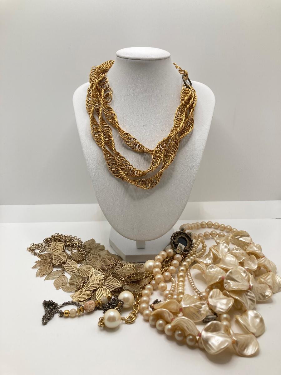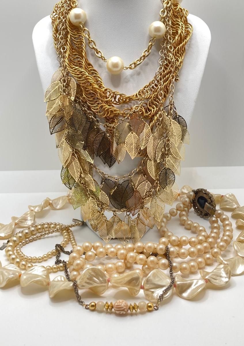 LOT 61: Multi Strand Gold Tone Necklaces, Faux Pearls & More