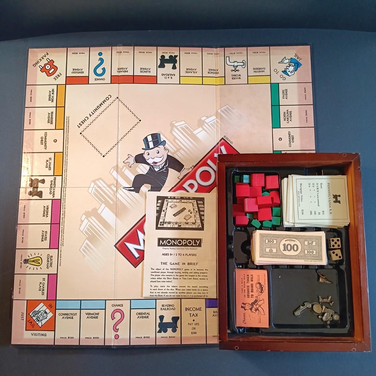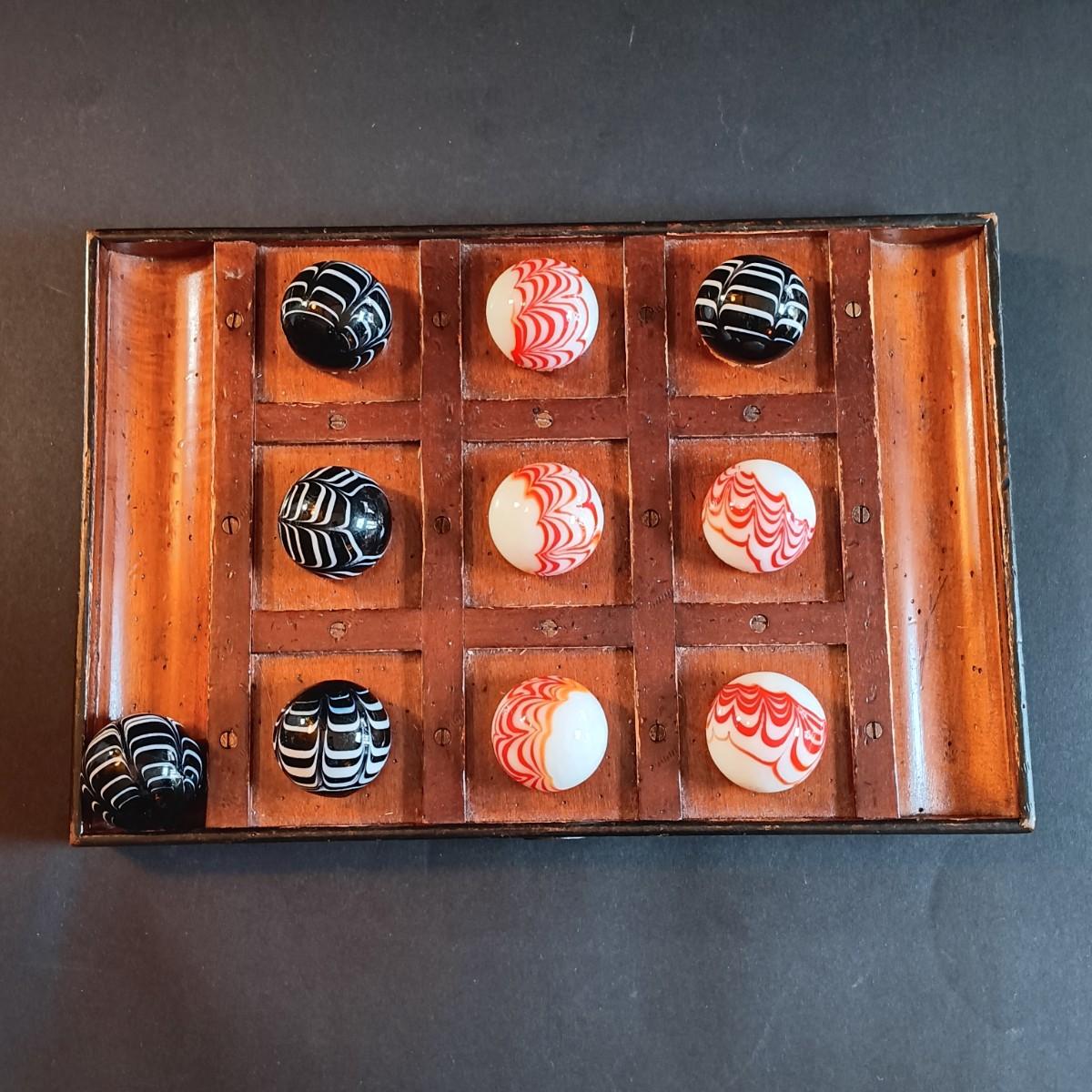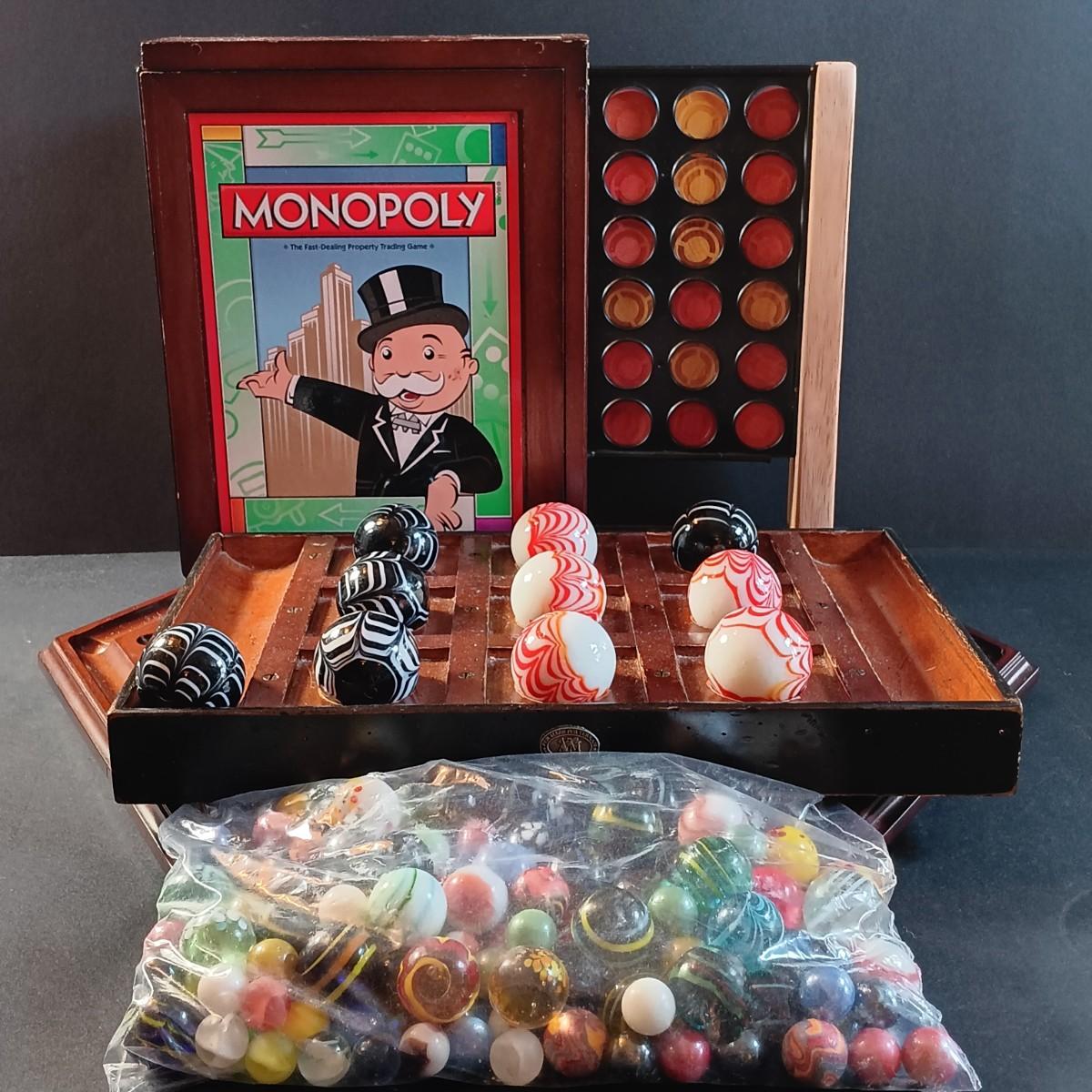 LOT 176: Vintage Wood Bookshelf Monopoly Set w/ Venetian Glass Marble Tic Tac Toe, Bombay Co Chinese Checkers Board & More