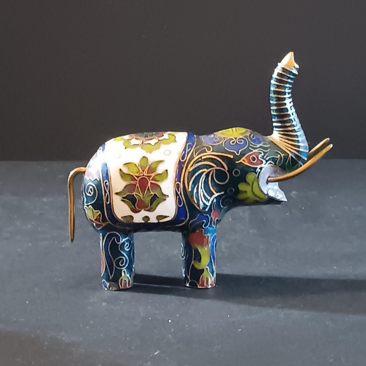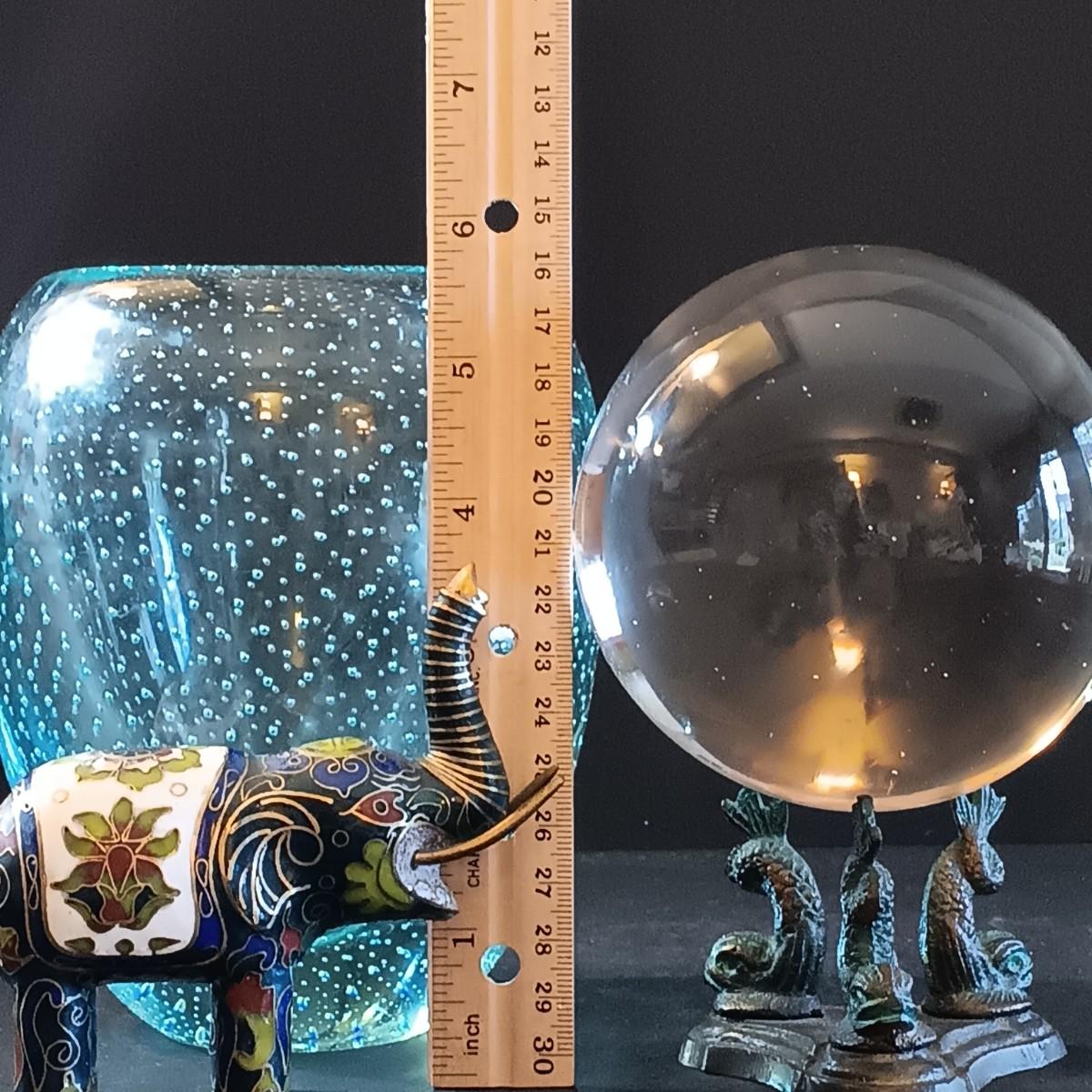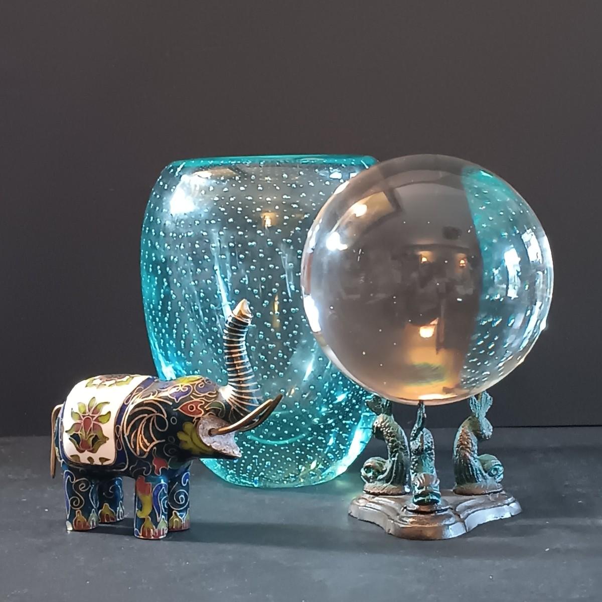 LOT 184: Controlled Bubble Vase w/ Mini Cloisonne Elephant, Brass Koi Base & Glass Orb