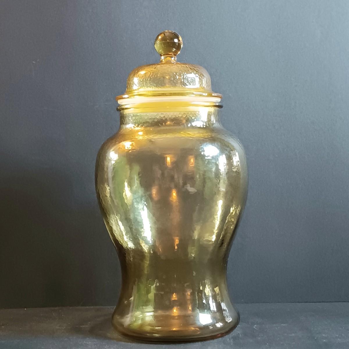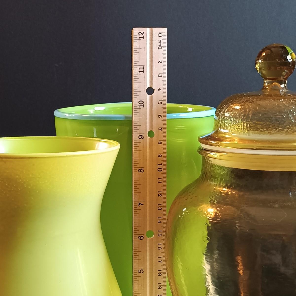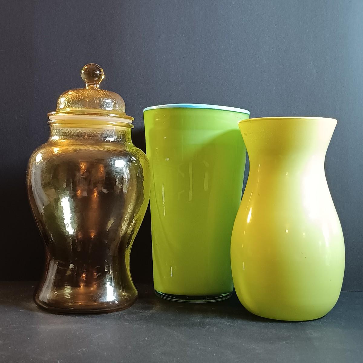 LOT 185: Vintage Green Color Glass Vases with Apothecary Ginger Jar