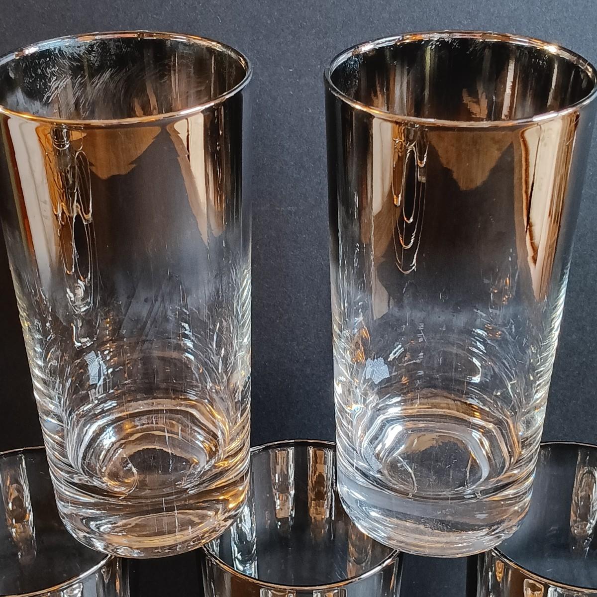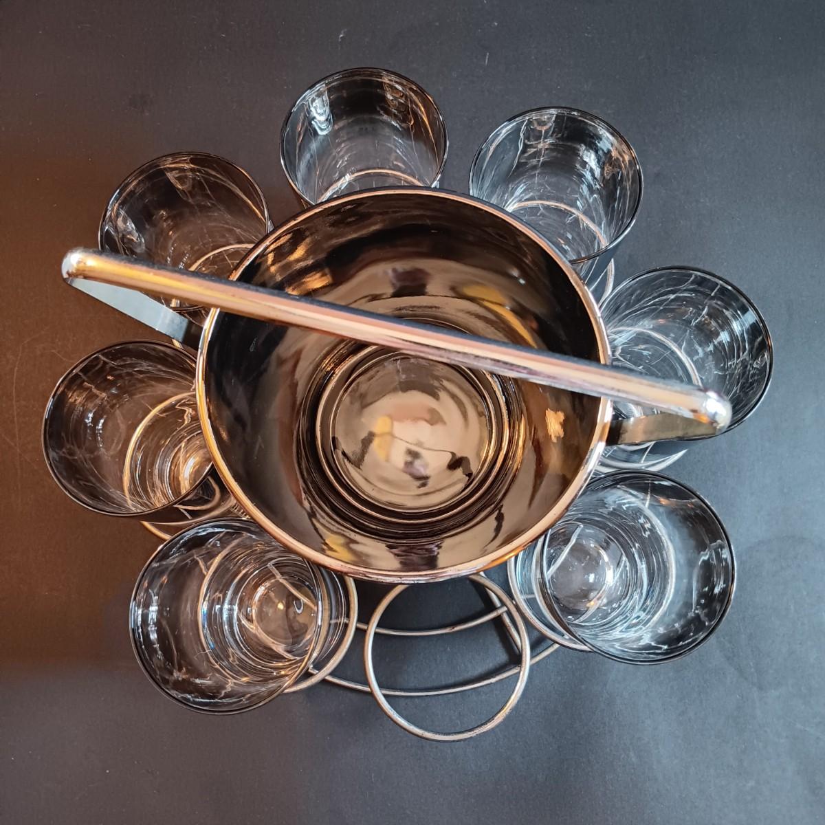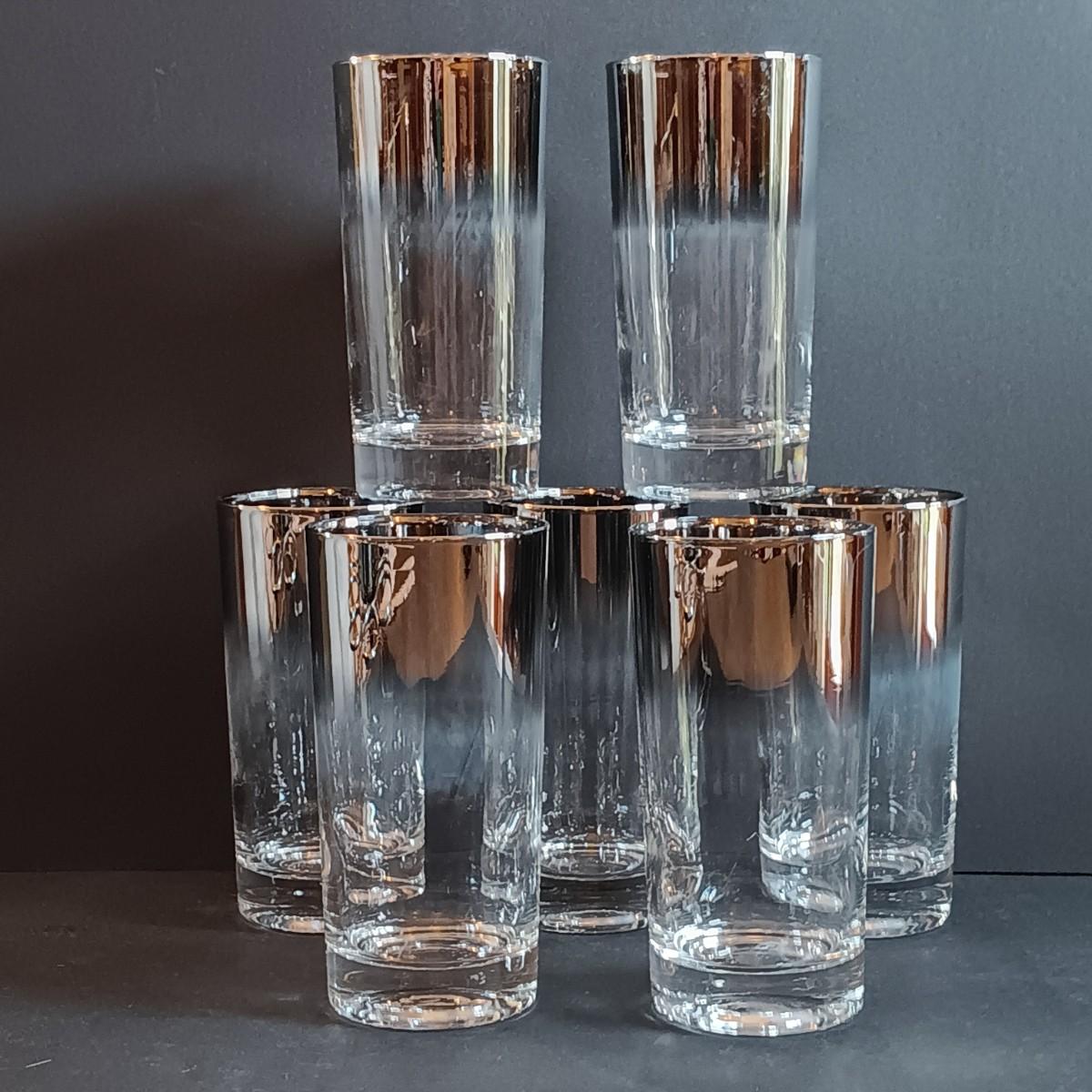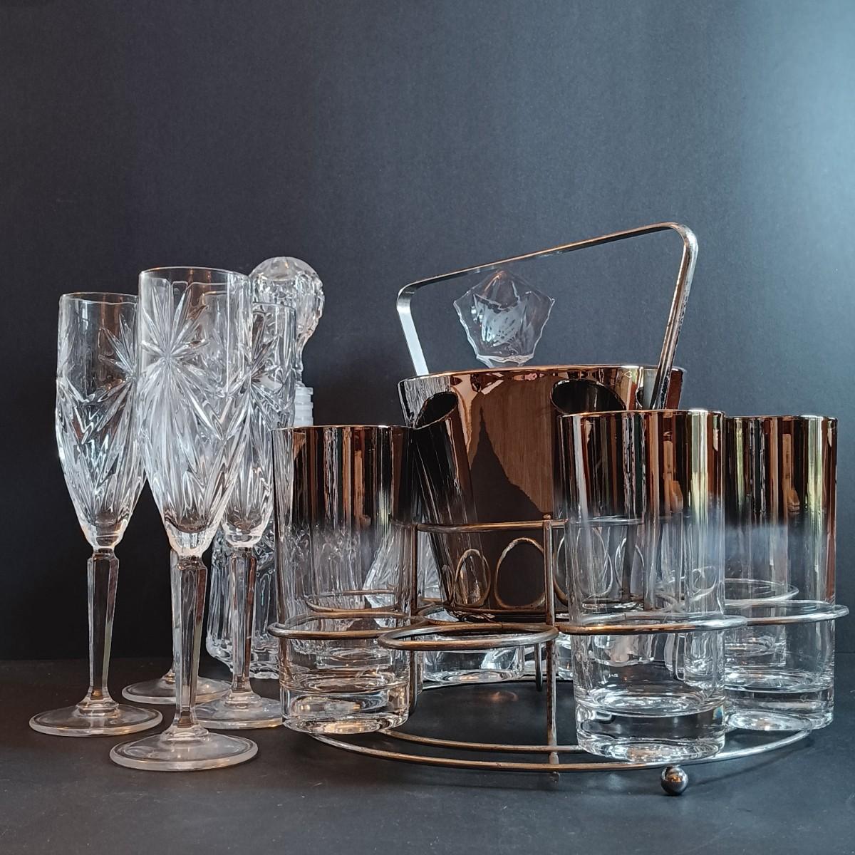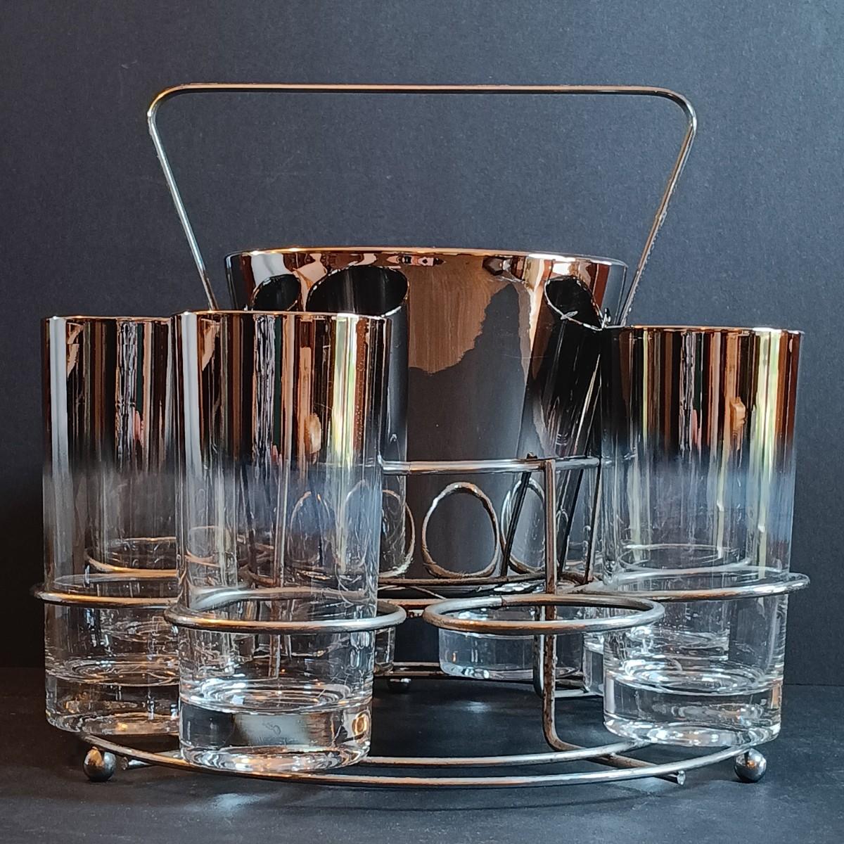 LOT 186: MCM Dorothy Thorpe Style Mercury Fade HiBall Glasses w/ Ice Pail, Crystal Decanters & Champagne Glasses