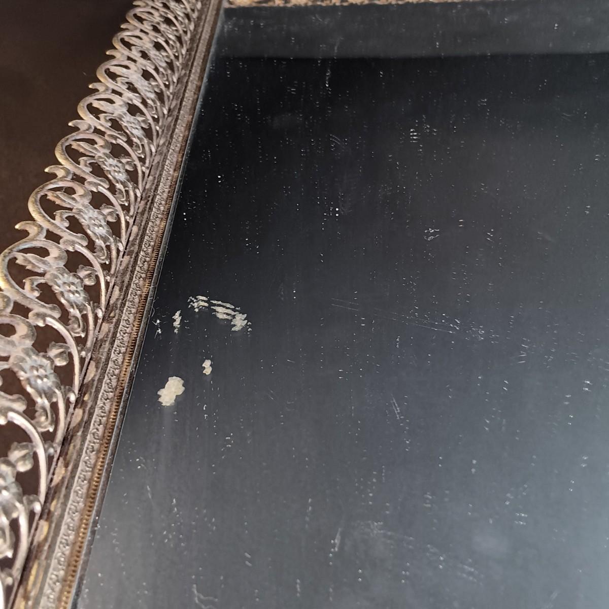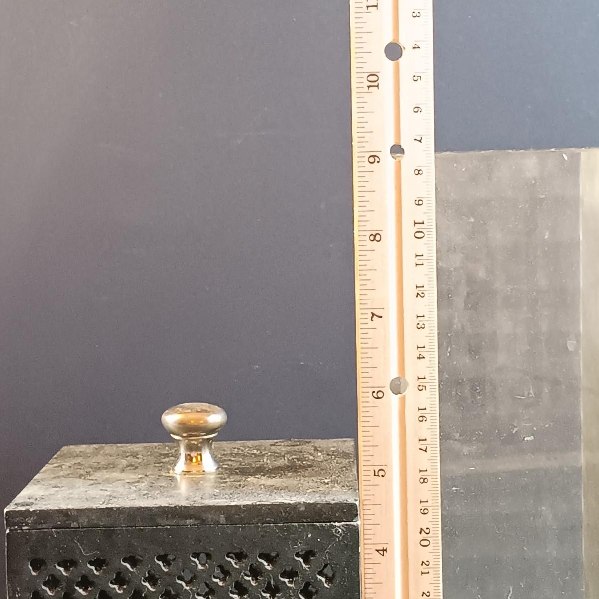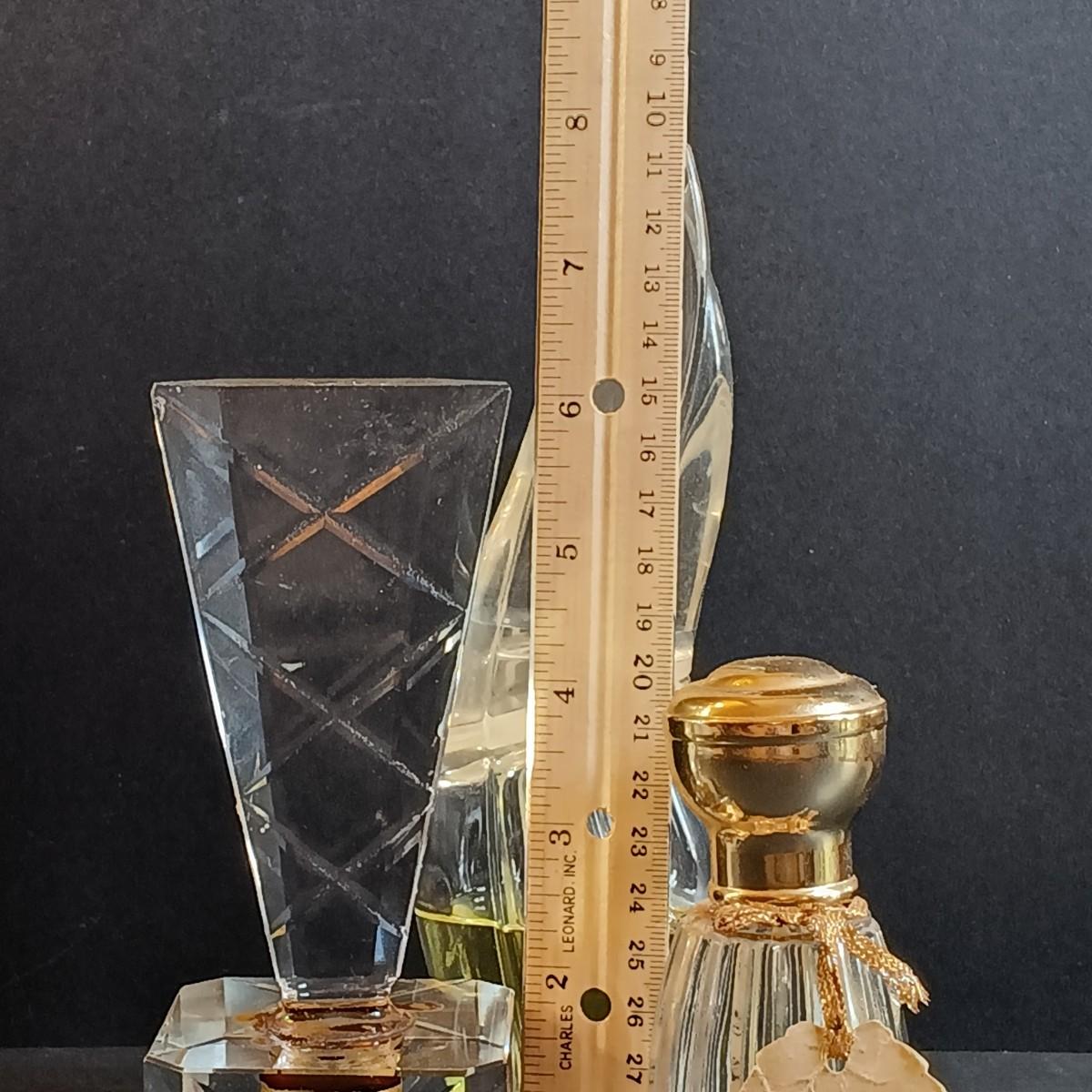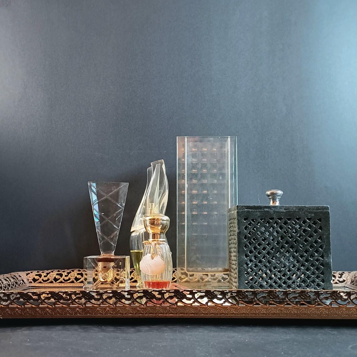 LOT 189: Vintage Perfume Bottles w/ Mirrored Tray, Bulova Vase & Soapstone Tissue Box