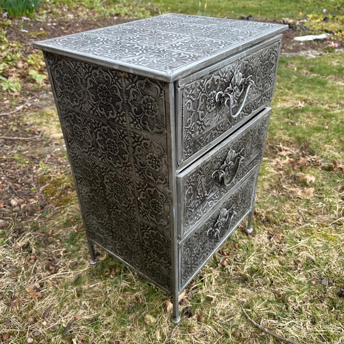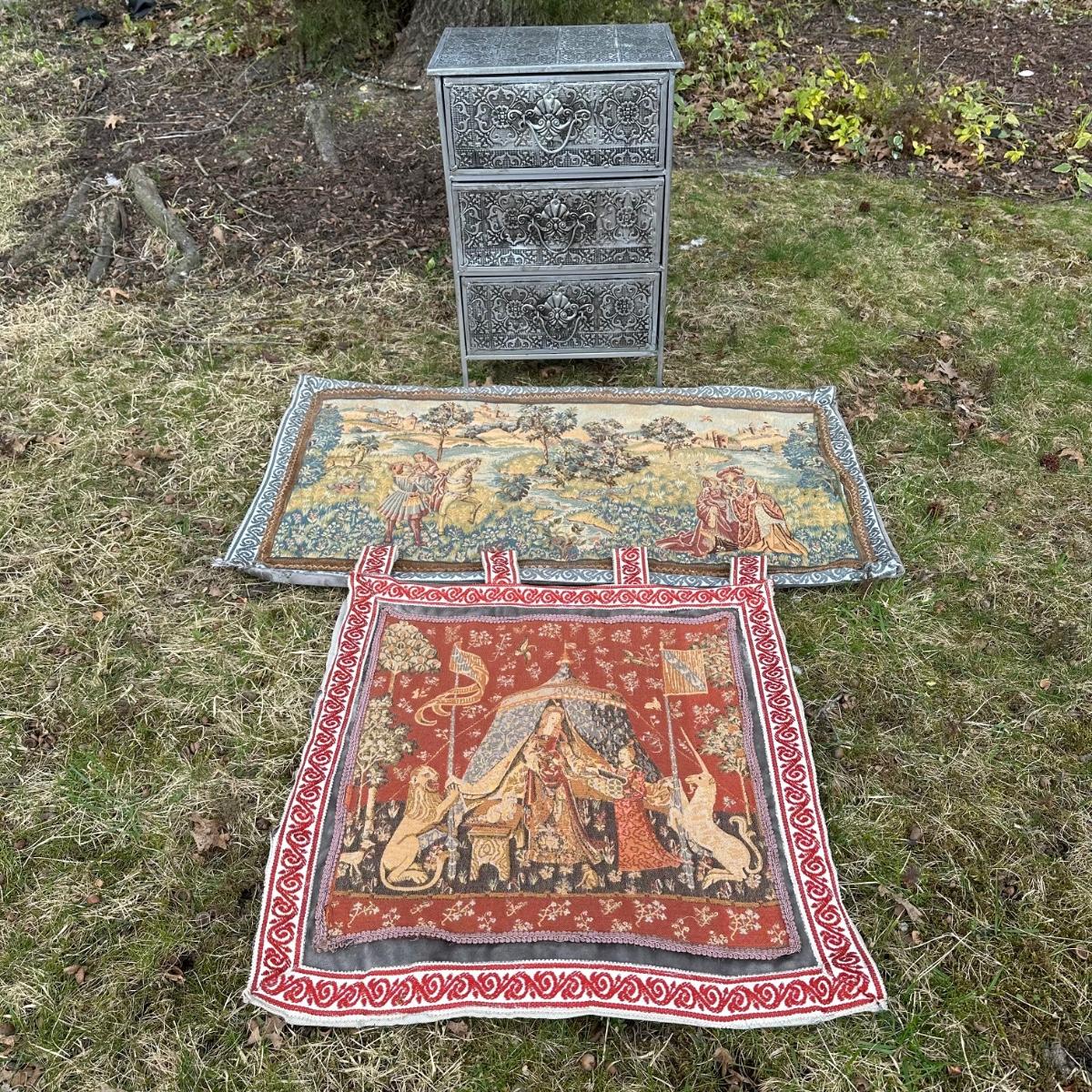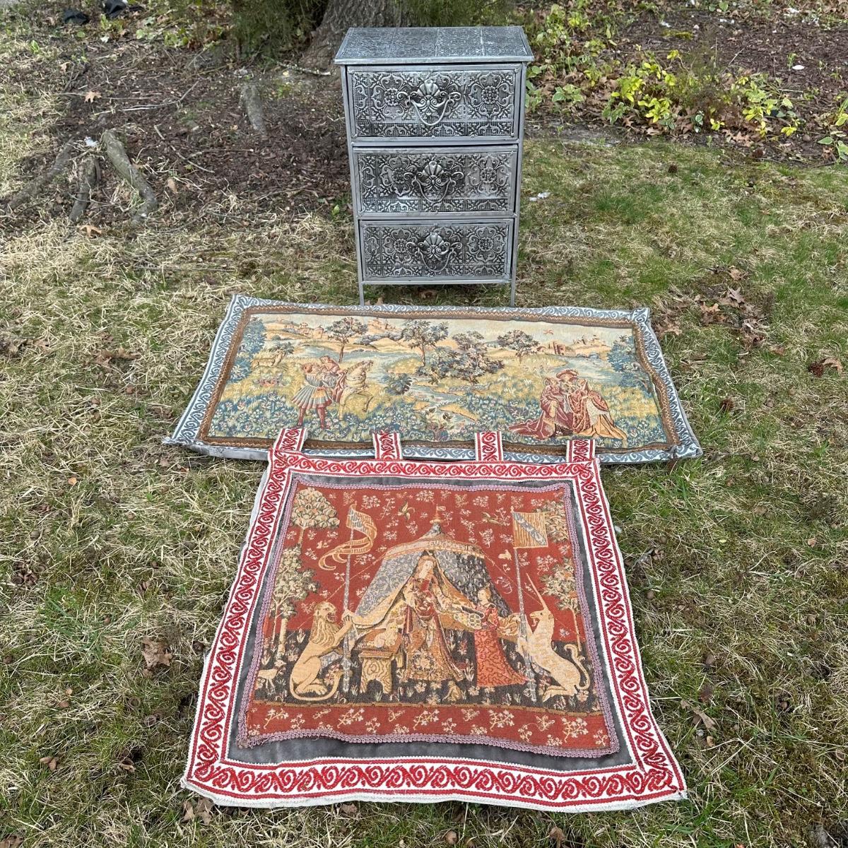 LOT 207: 2 Vintage French Tapestry’s & Vintage Embossed Metal Dresser