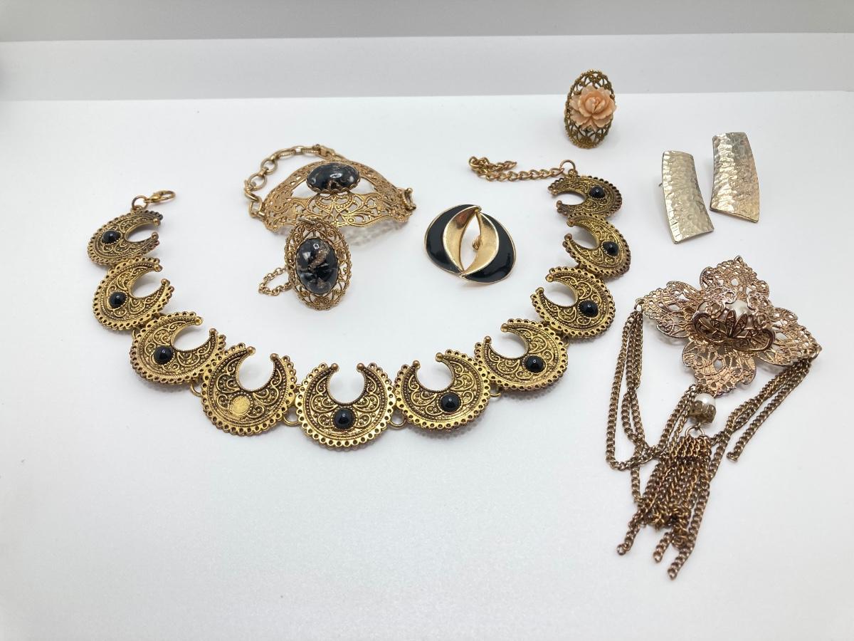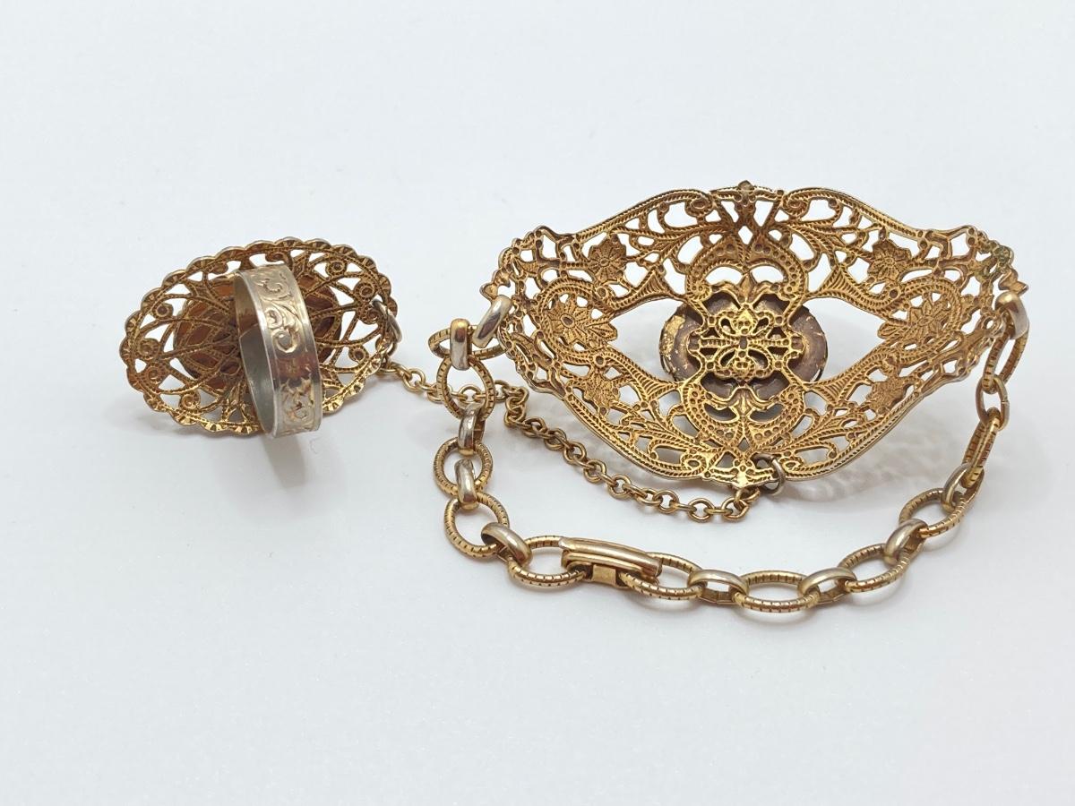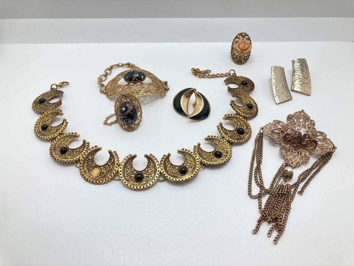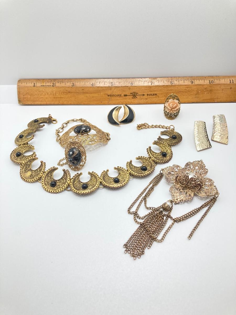 LOT 251: Vintage Ornate Fashion Jewelry - Bracelet / Ring Combination, Carved Rose Ring, Earrings and More