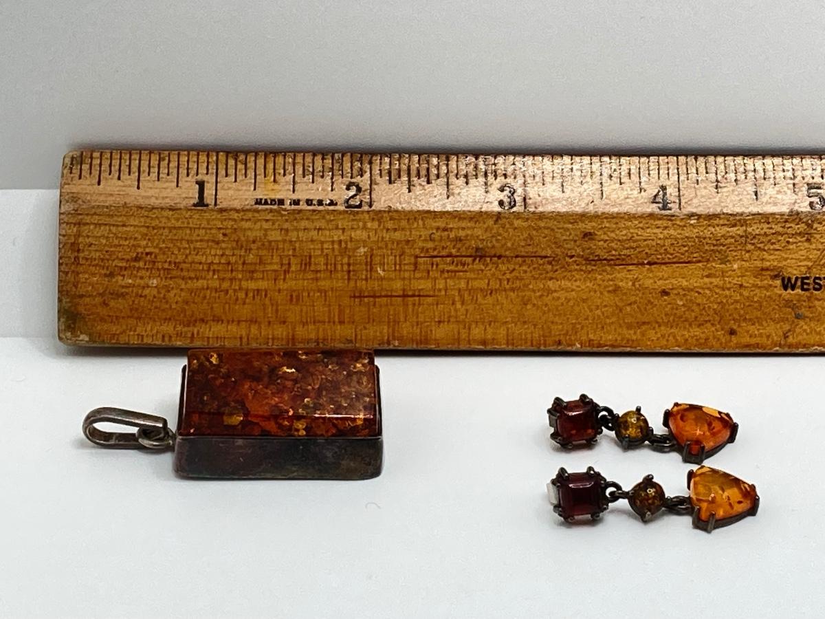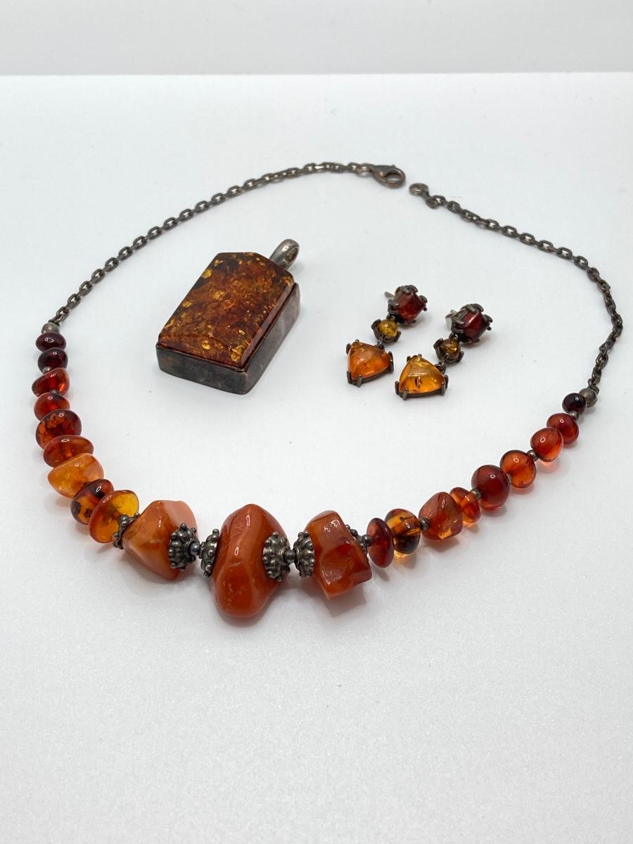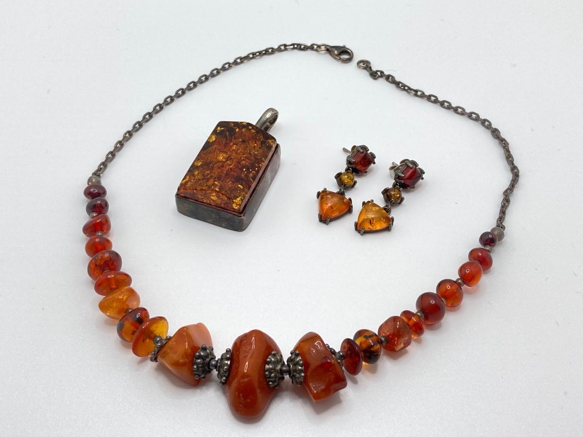 LOT 261: Sterling Amber Necklace, Earring and Pendant