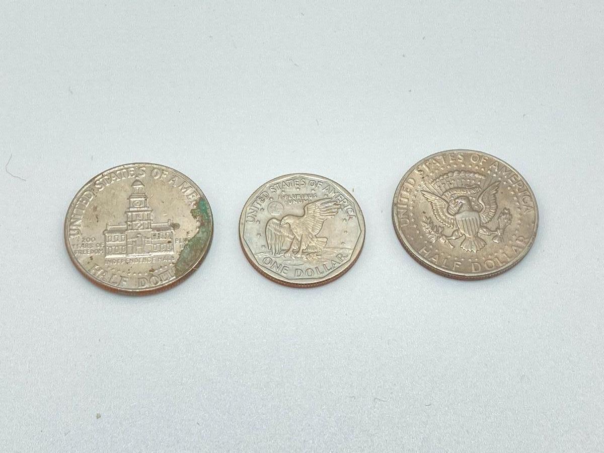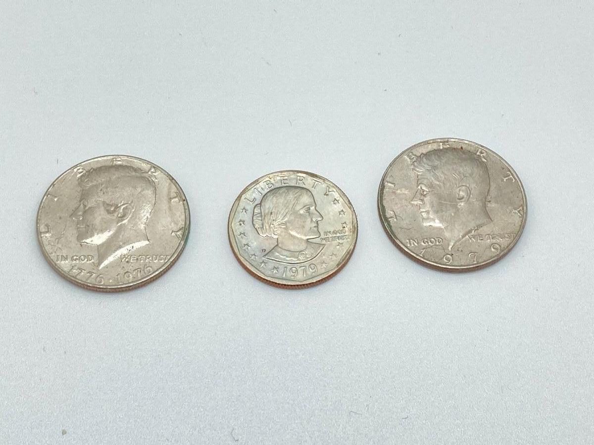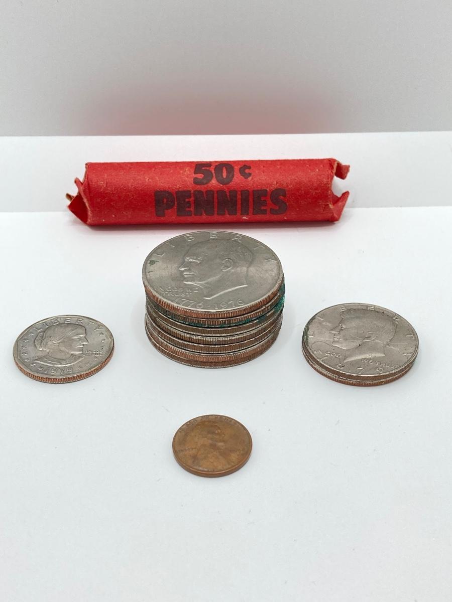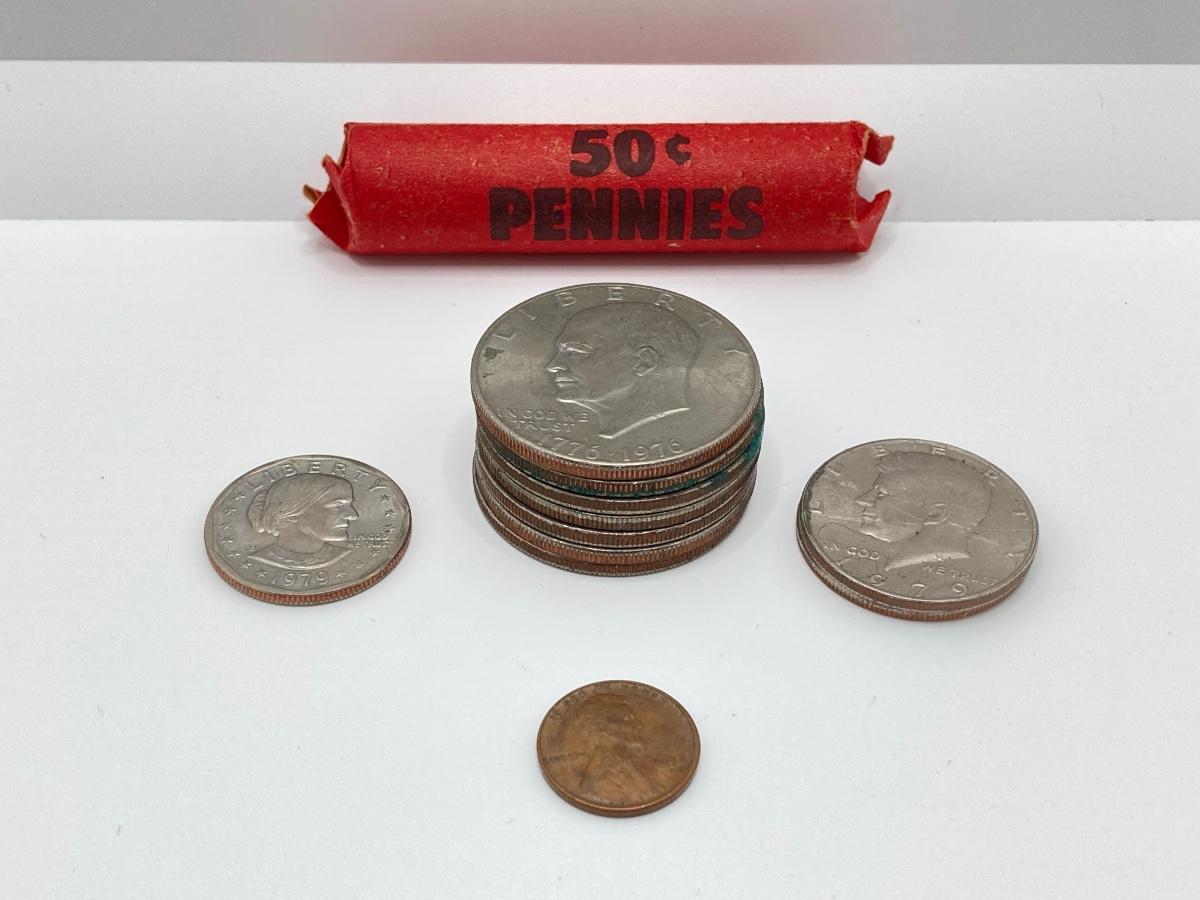 LOT 269: Currency Collection - Eisenhower Dollars, Susan B Anthony, Kennedy Half Dollars, 52D Wheat Penny and Roll of Various Pennies