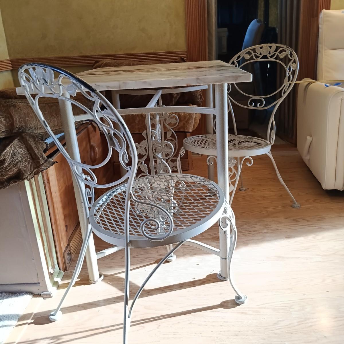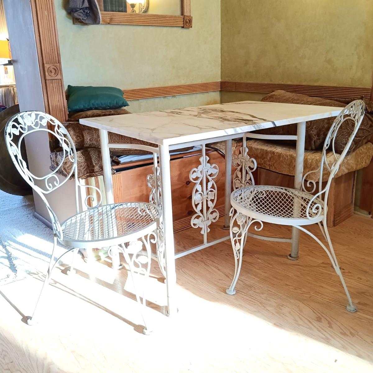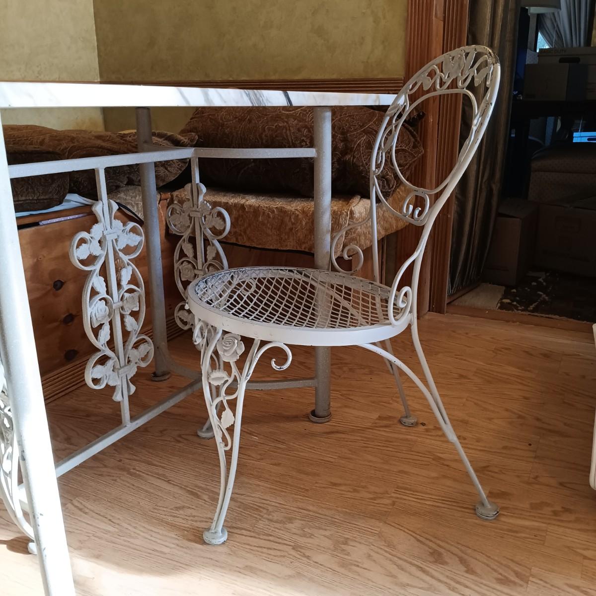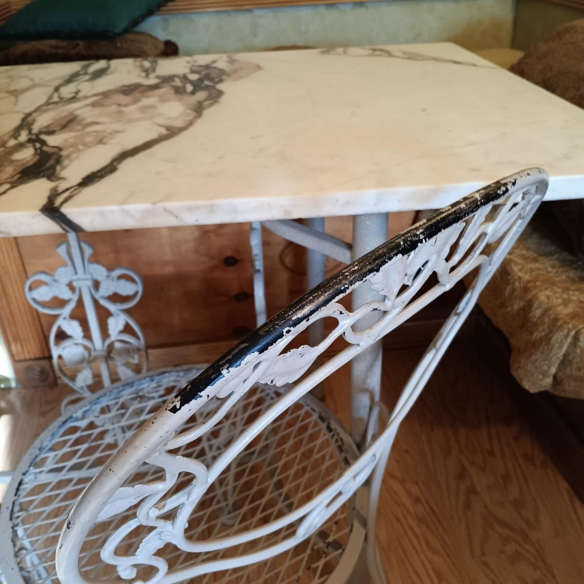 LOT 272: Marble Top Wrought-Iron Table with Two Chairs