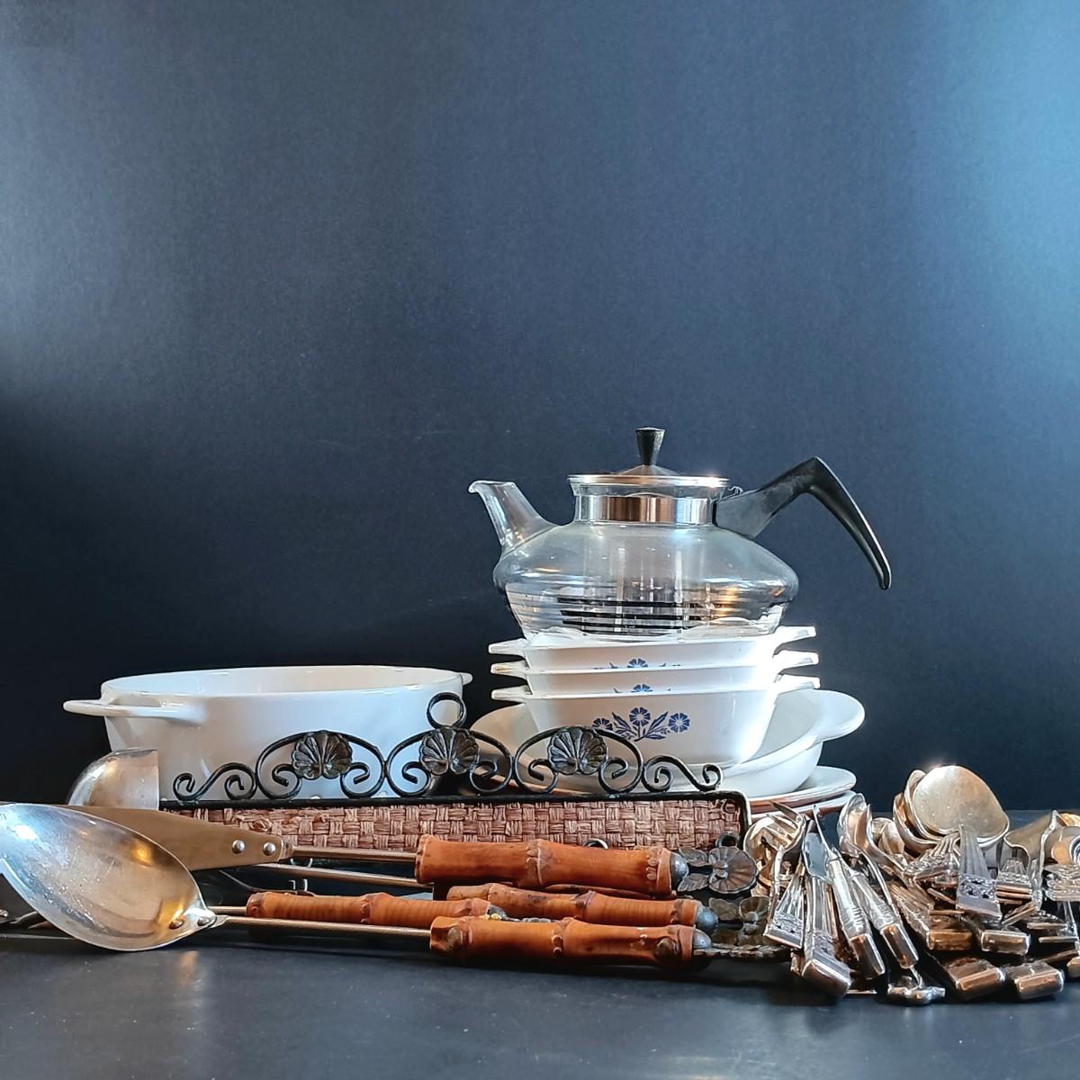 LOT 277: Pyrex Corning Teapot, Community Brand Silverware, Corning Ware Petite Dishes & More