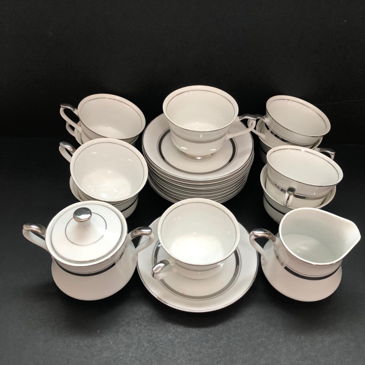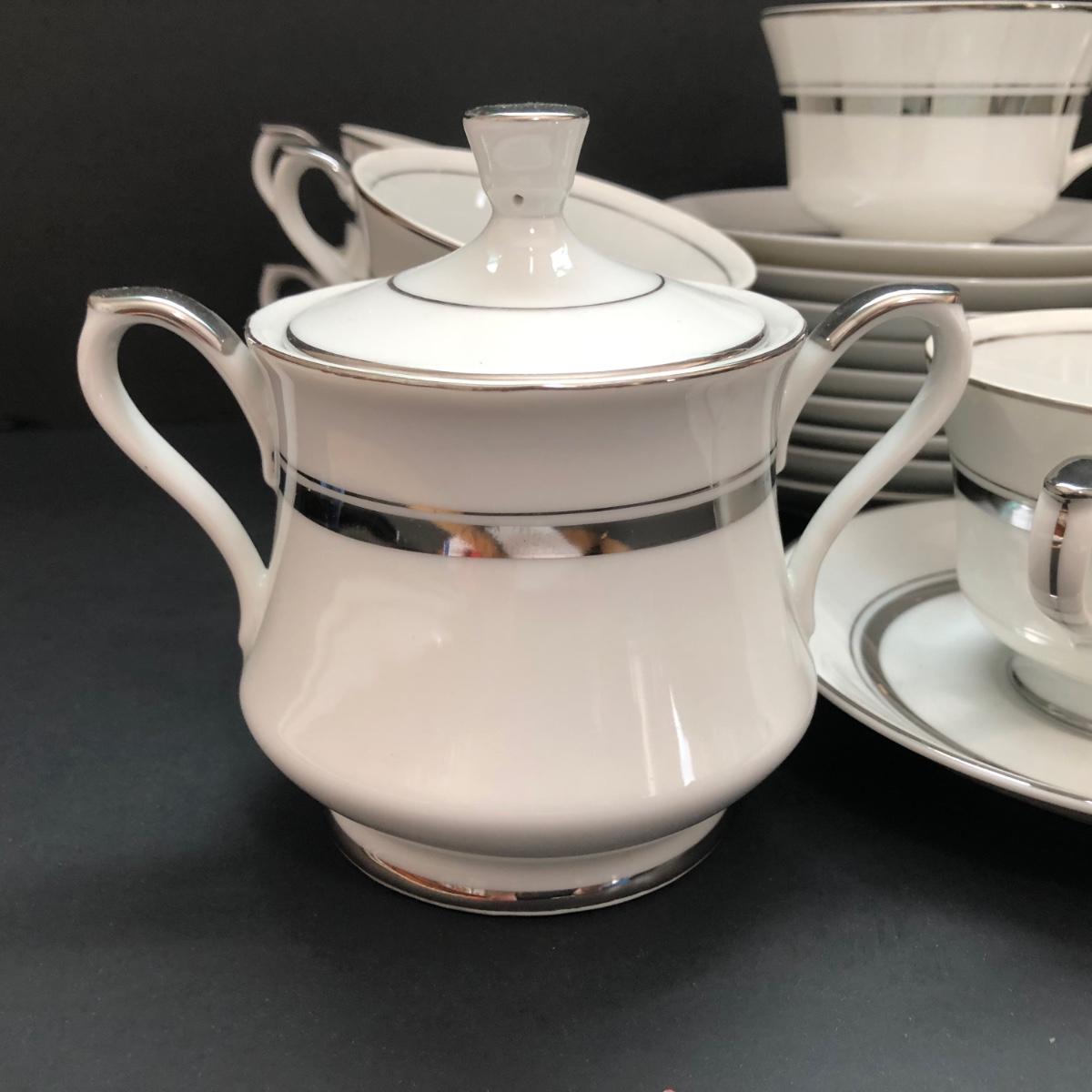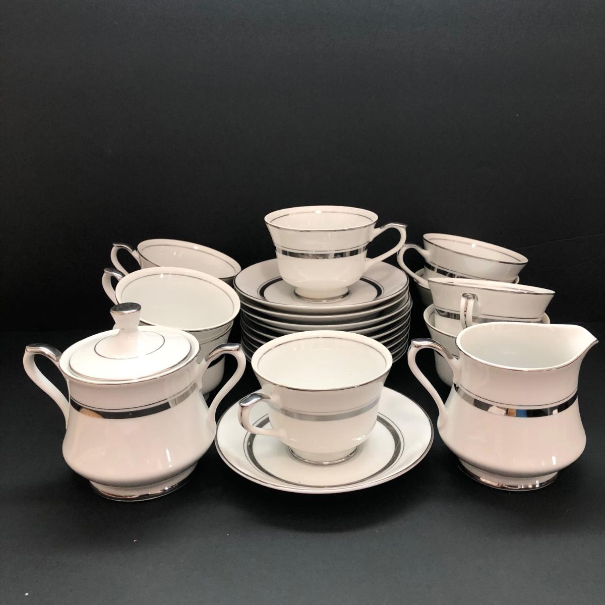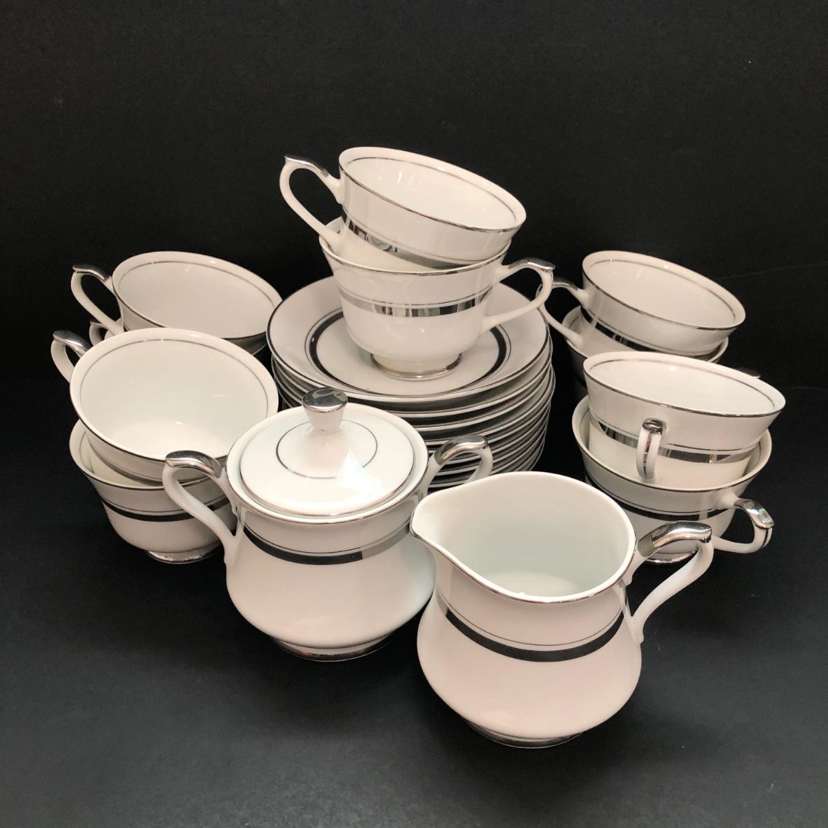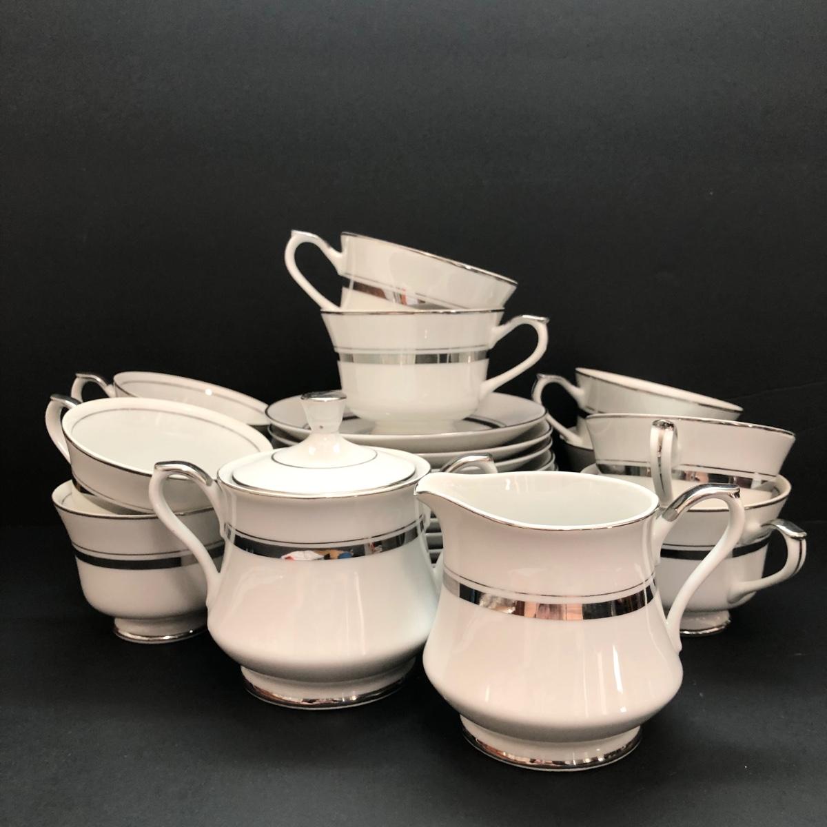 LOT 6U: Set of Crown Platinum Empress China - Plates, Bowls, Teacups, Sugar Bowl & Creamer