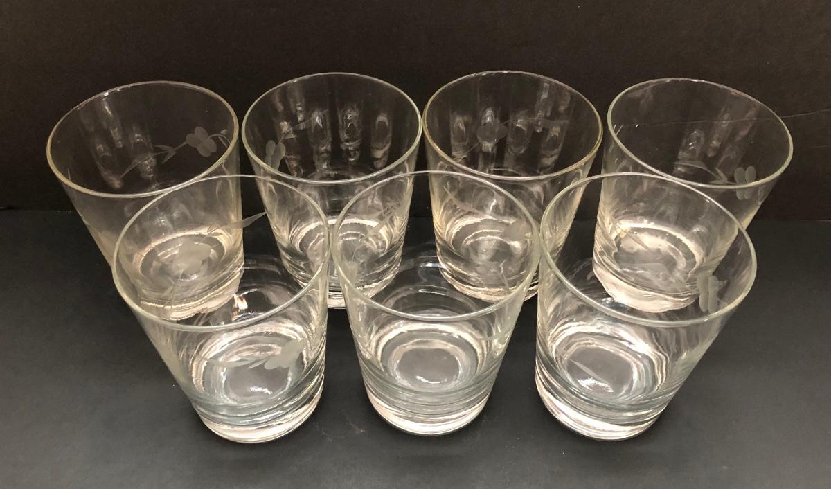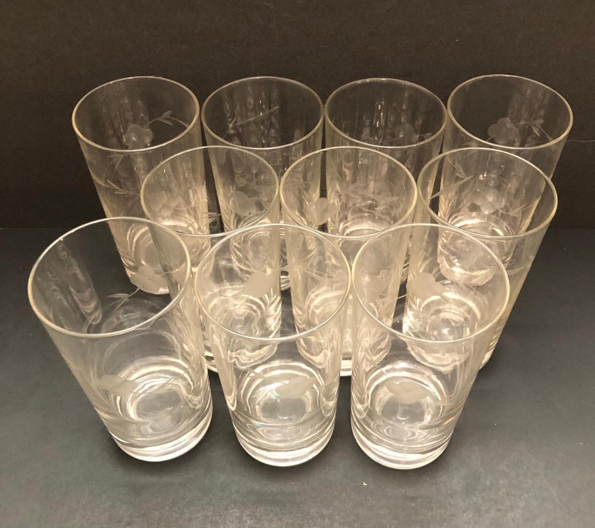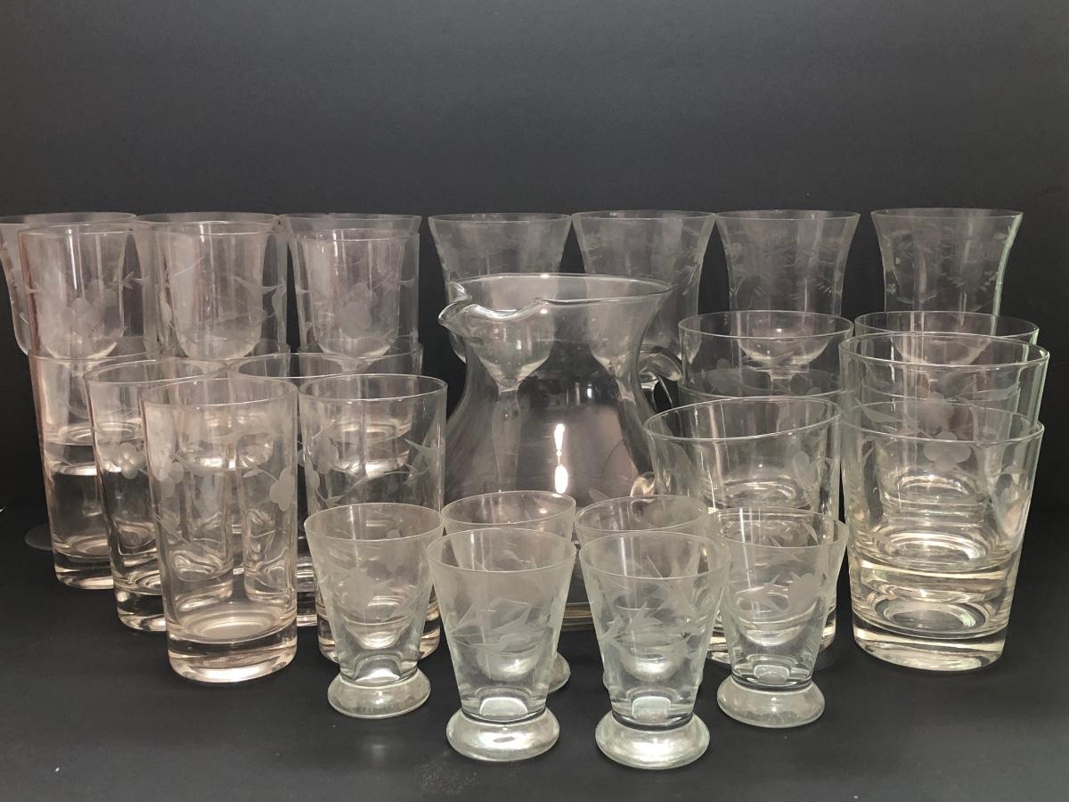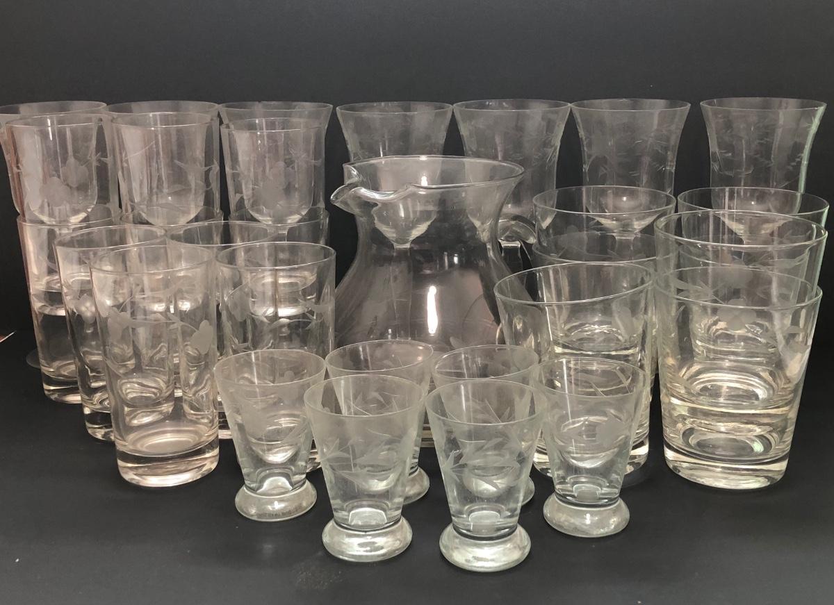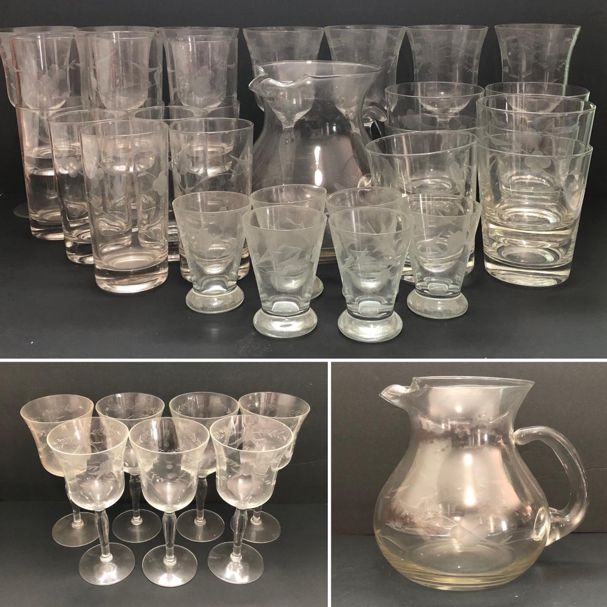 LOT 7U: Collection of Vintage Matching Etched Glass - Stemmed, High and Lowball Glasses, Pitcher