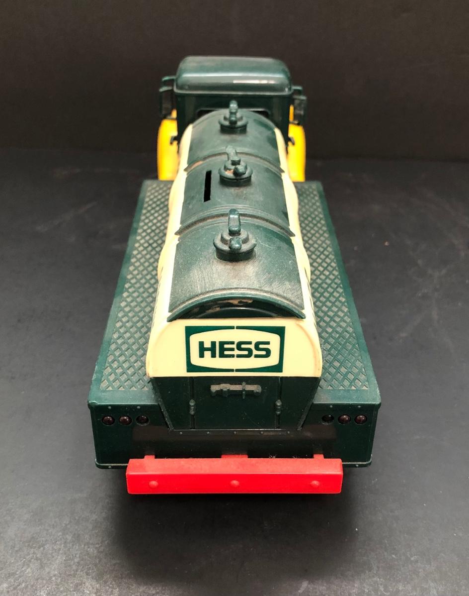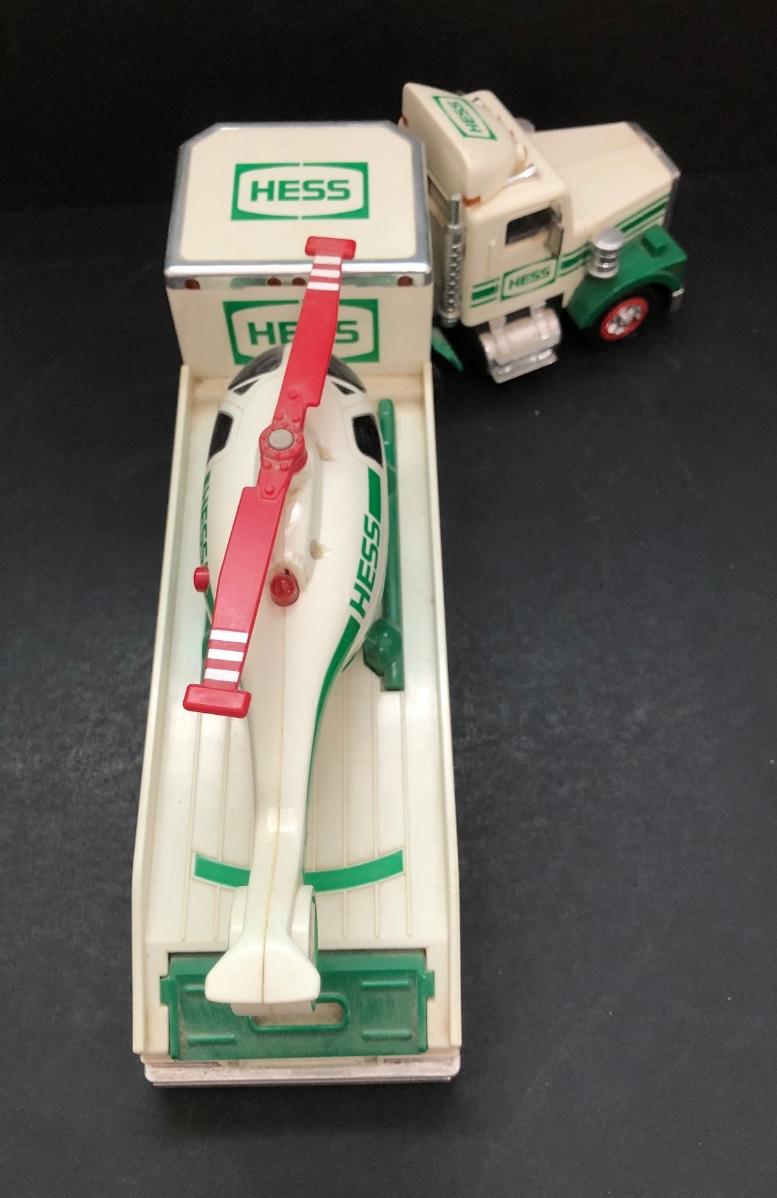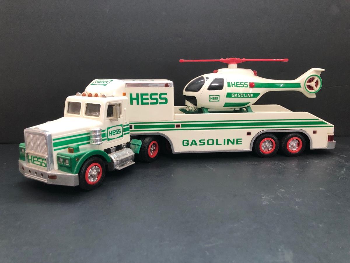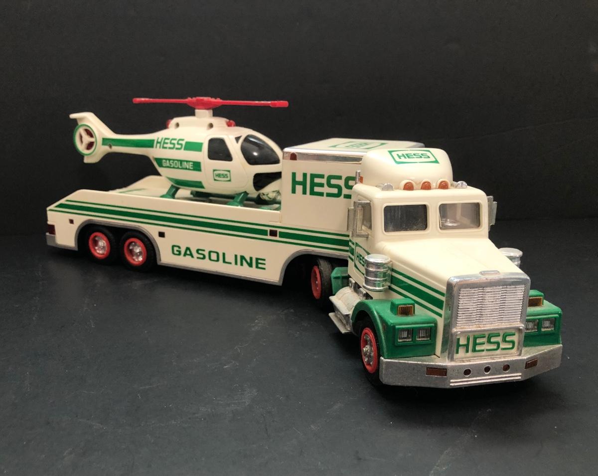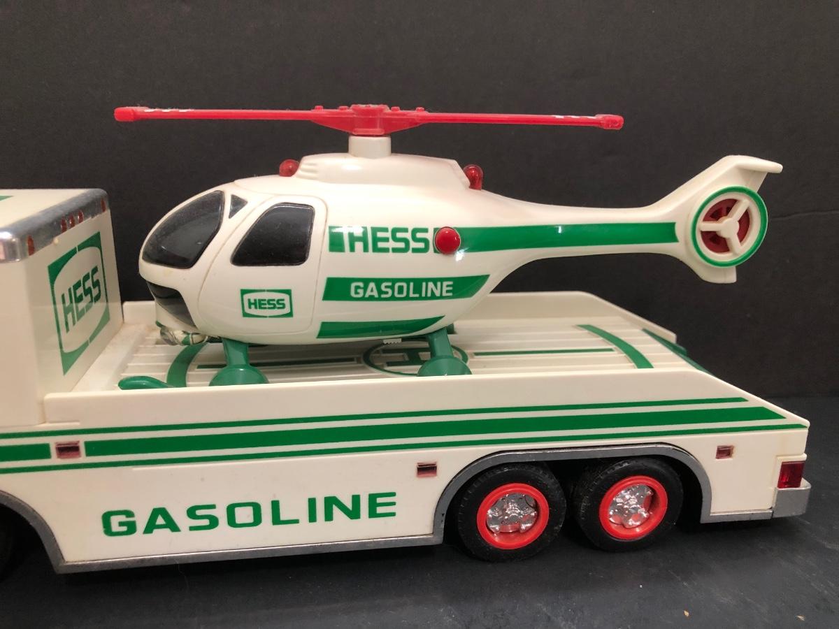 LOT 16U: Vintage Hess Collection - 1980s "The First Hess Truck" Gasoline / Oil Tank Truck Bank & 1995 Gas Truck Transporter w/ Helicopter