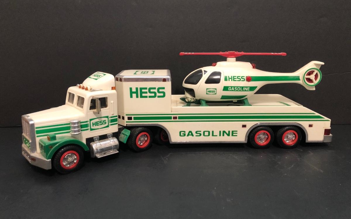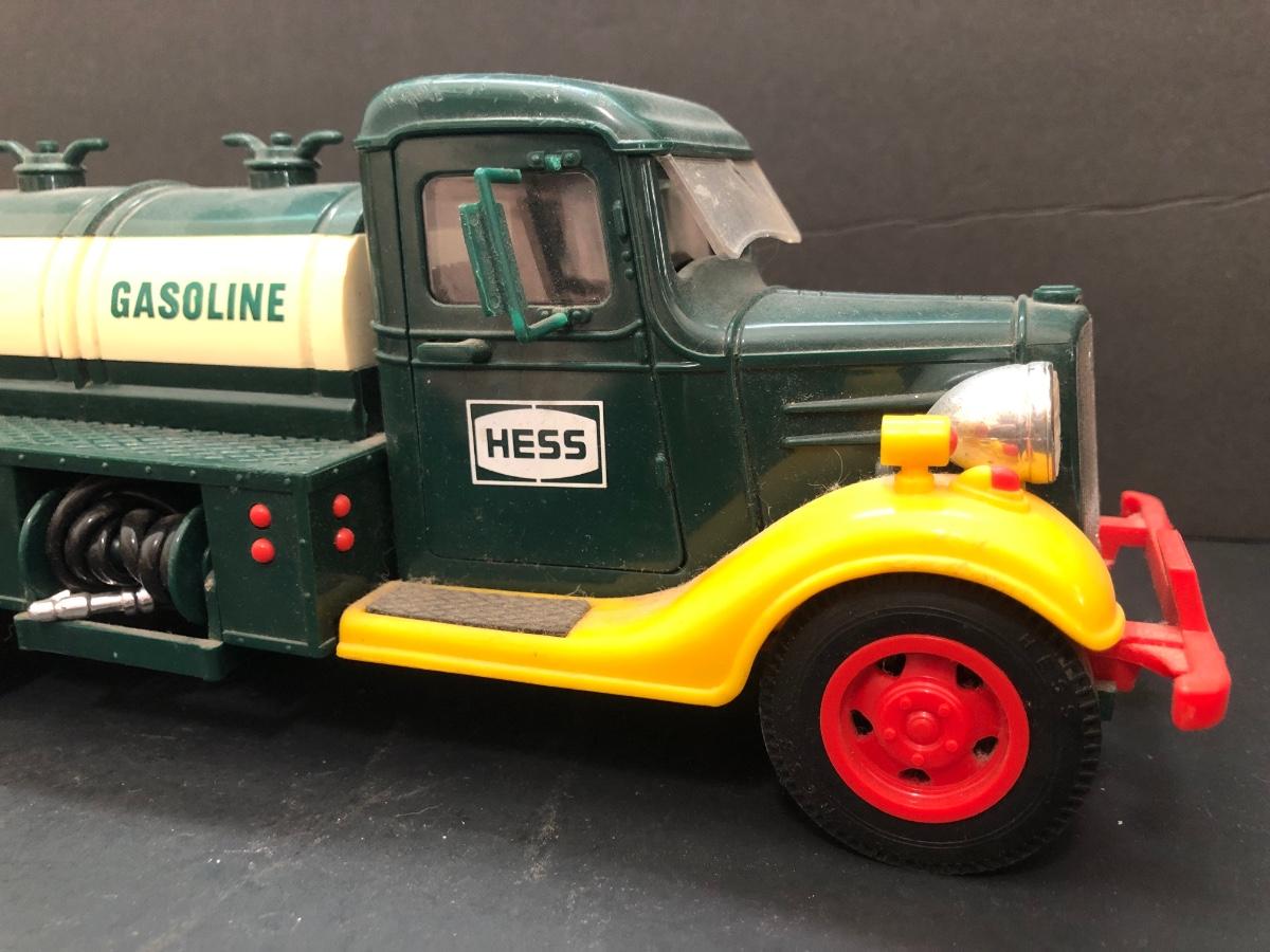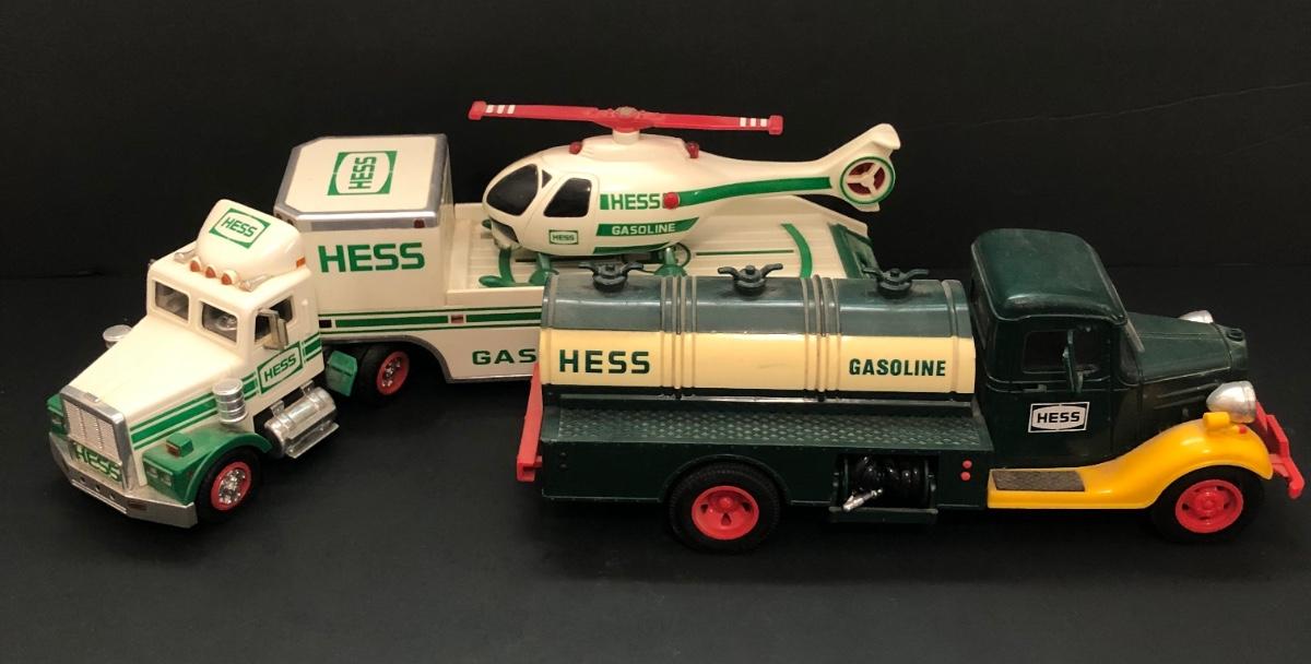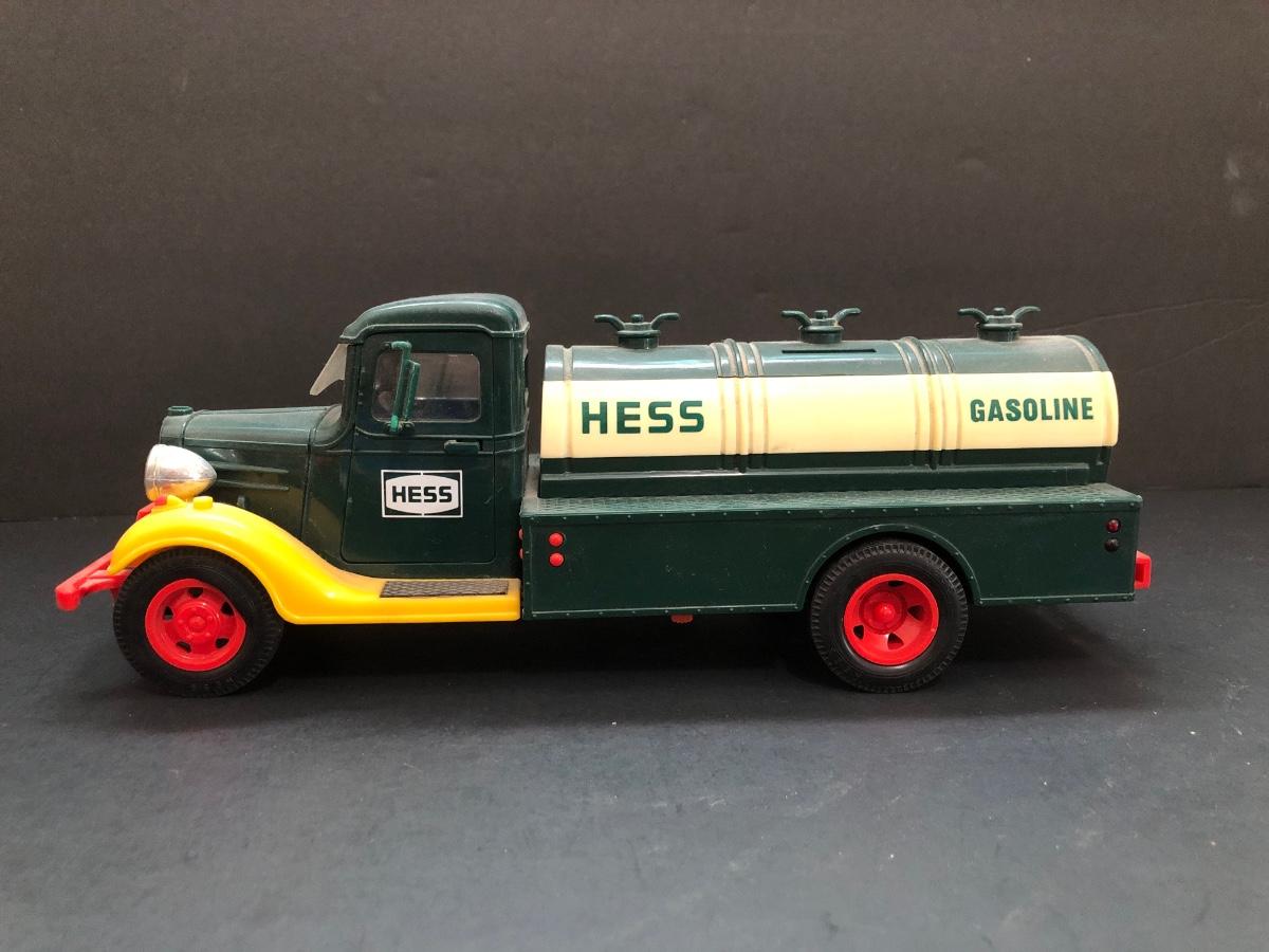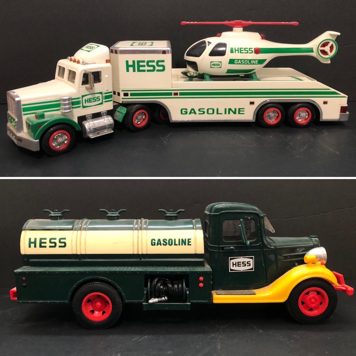 LOT 16U: Vintage Hess Collection - 1980s "The First Hess Truck" Gasoline / Oil Tank Truck Bank & 1995 Gas Truck Transporter w/ Helicopter