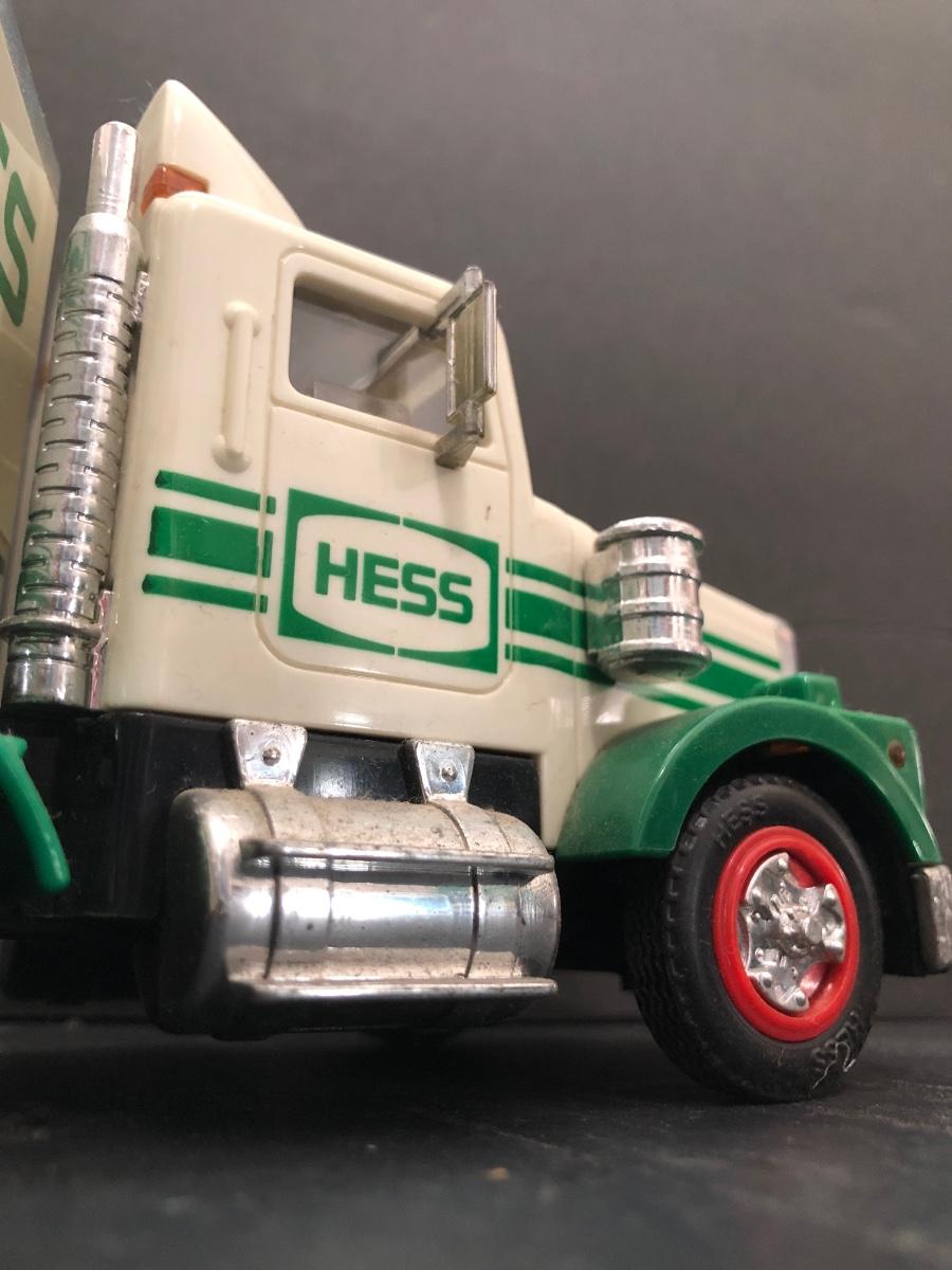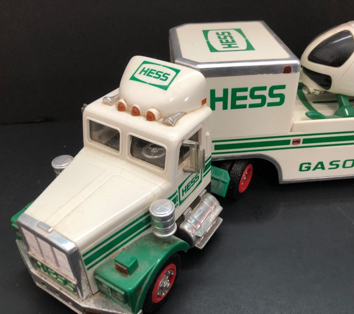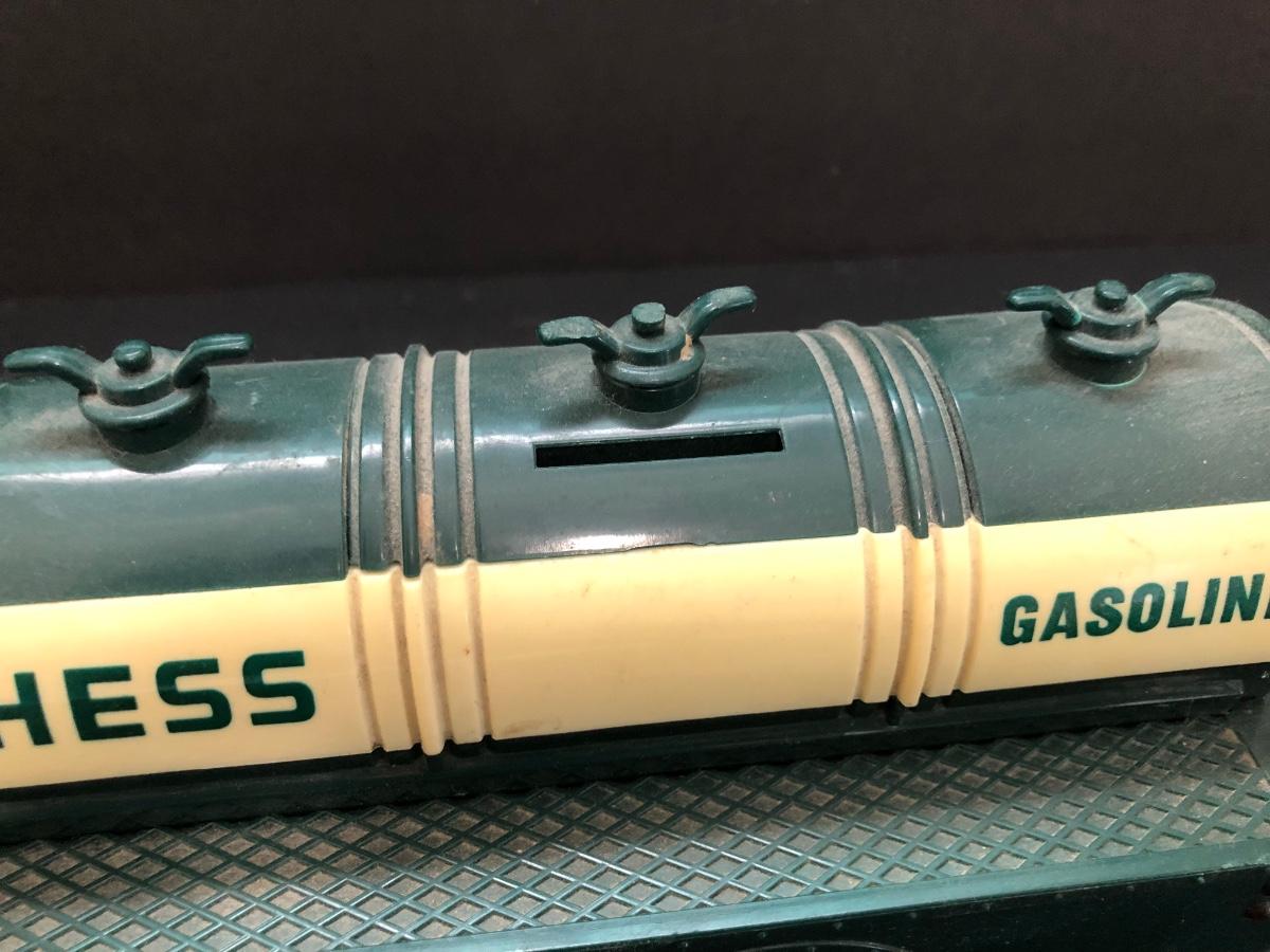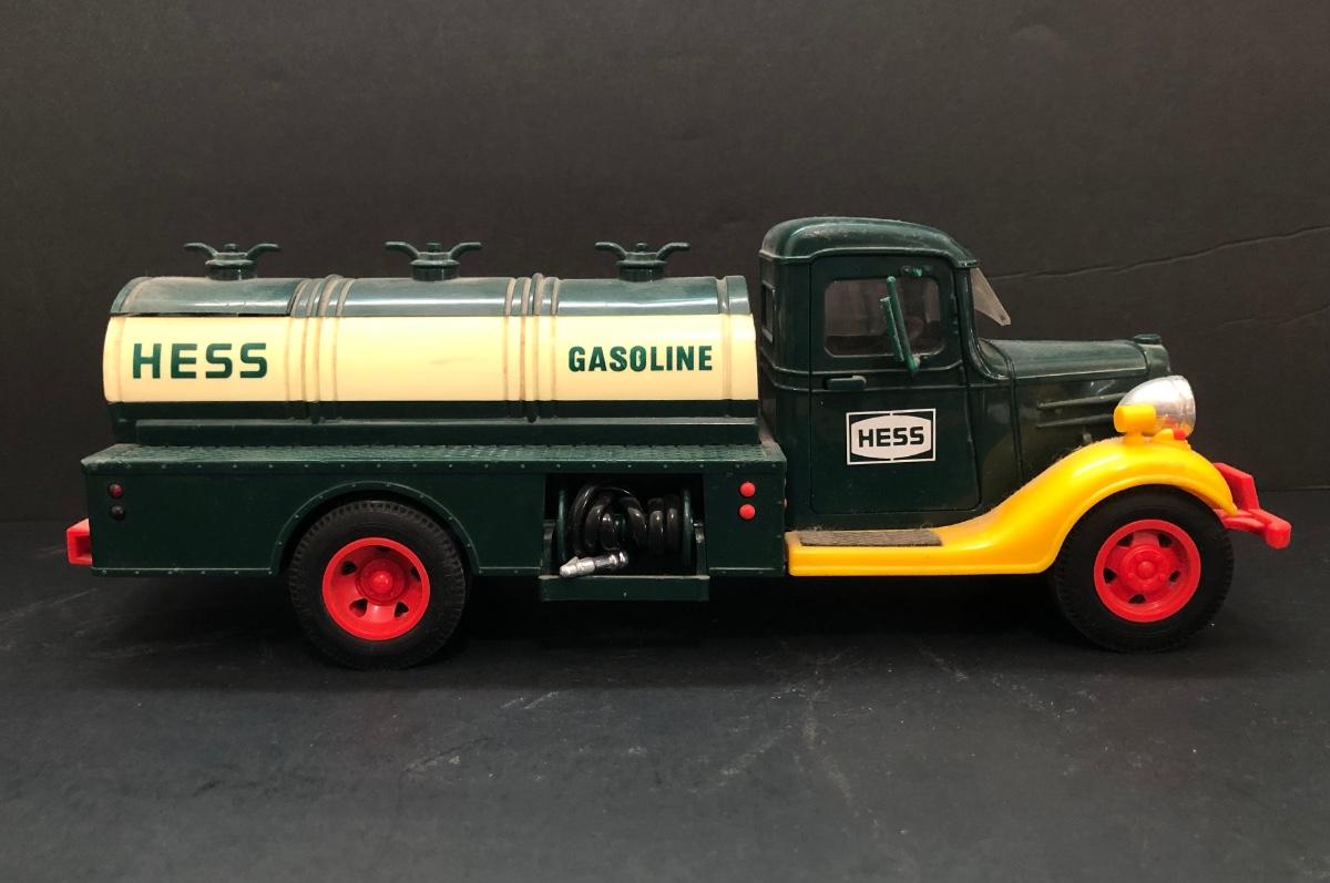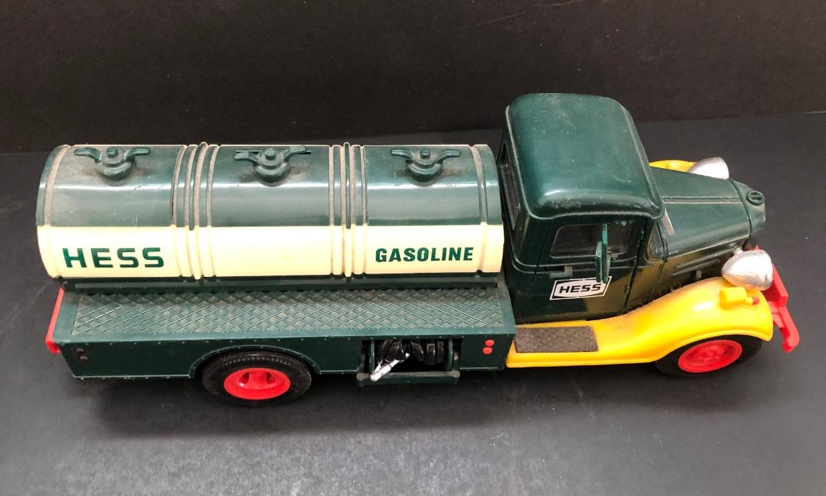 LOT 16U: Vintage Hess Collection - 1980s "The First Hess Truck" Gasoline / Oil Tank Truck Bank & 1995 Gas Truck Transporter w/ Helicopter