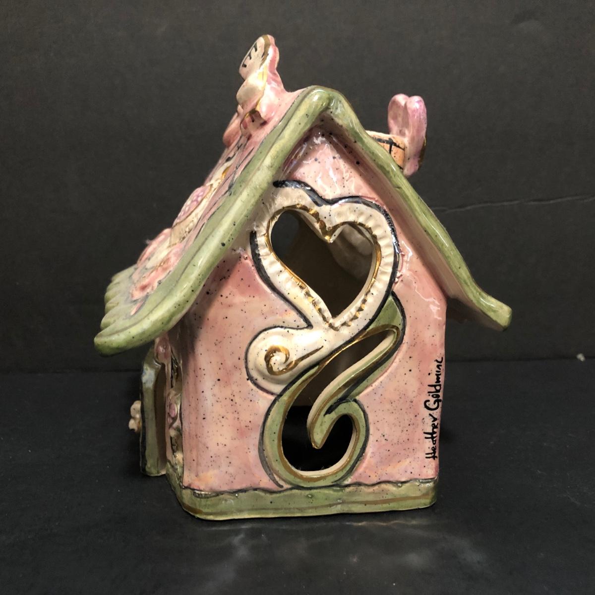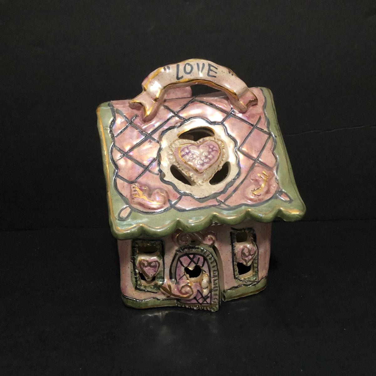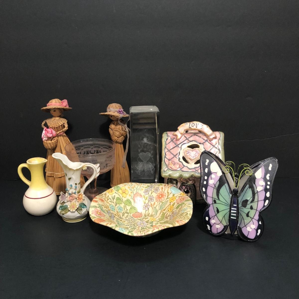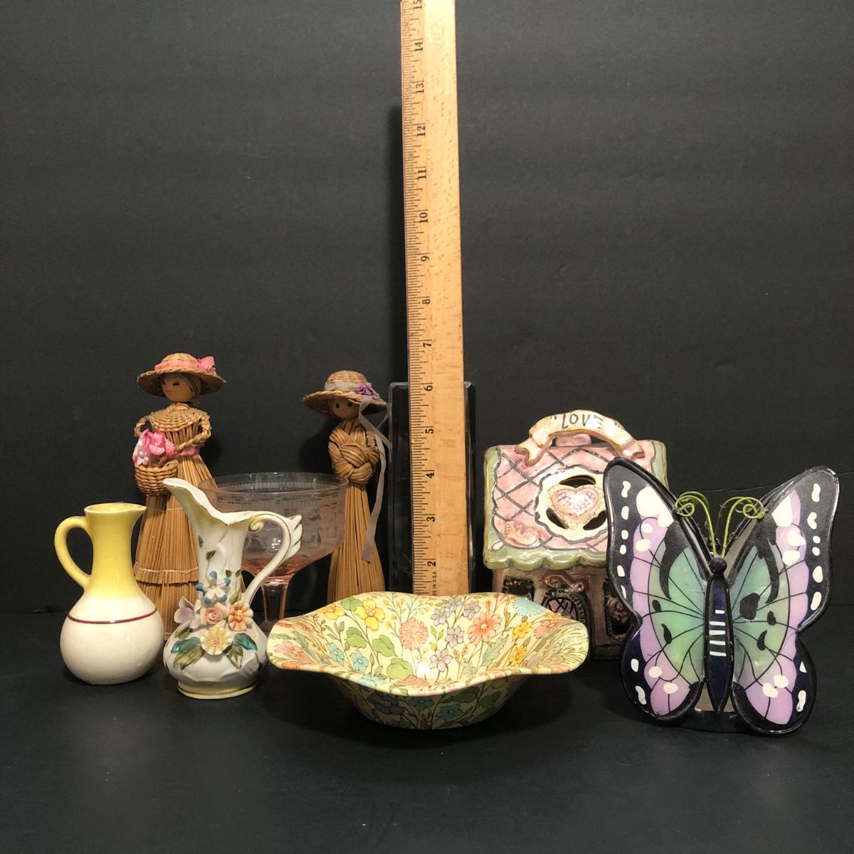 LOT 25U: Vintage Decor Collection - Straw Dolls, Signed Heather Goldminc Love House Sculpture, Pink Depression Glass, Butterfly Votive & More