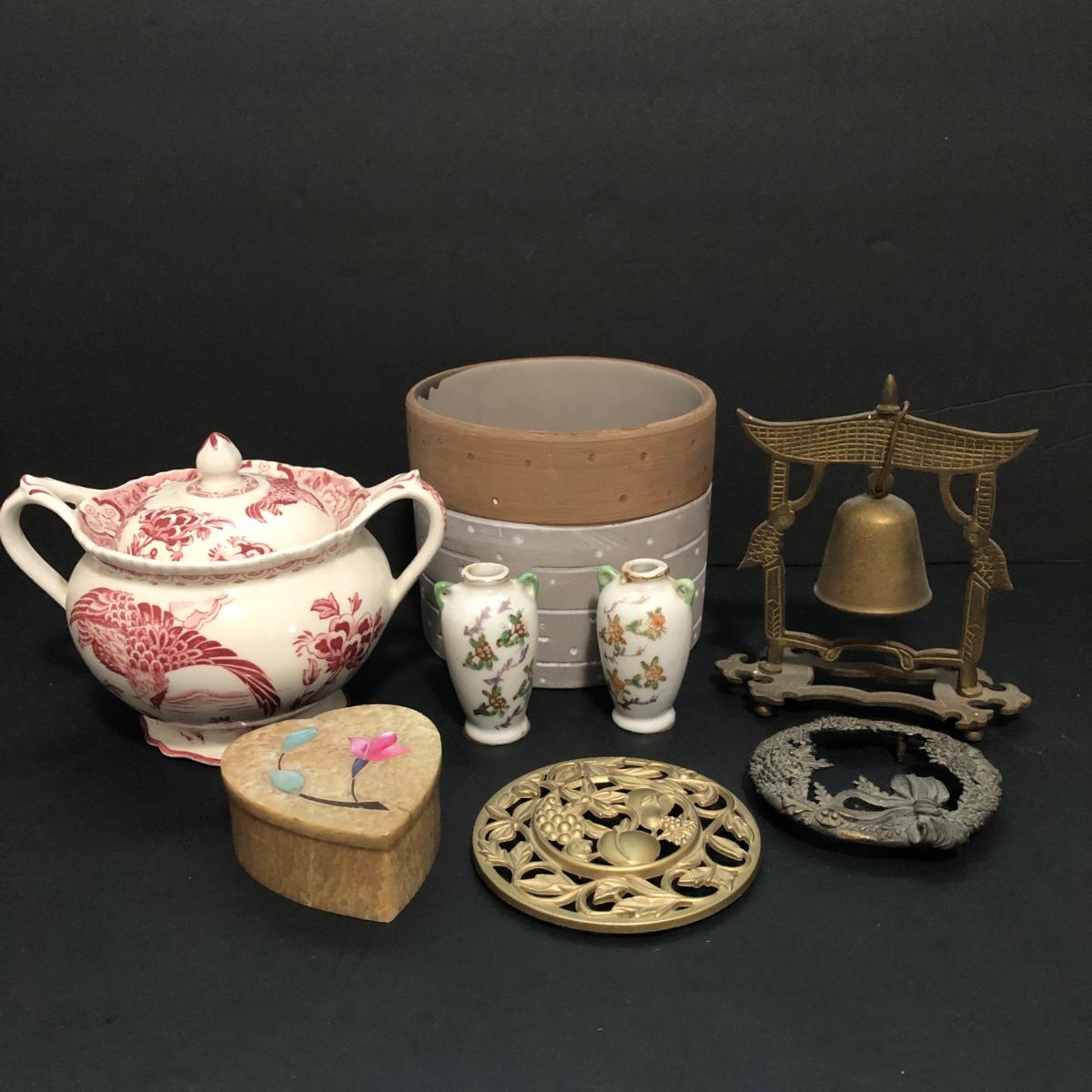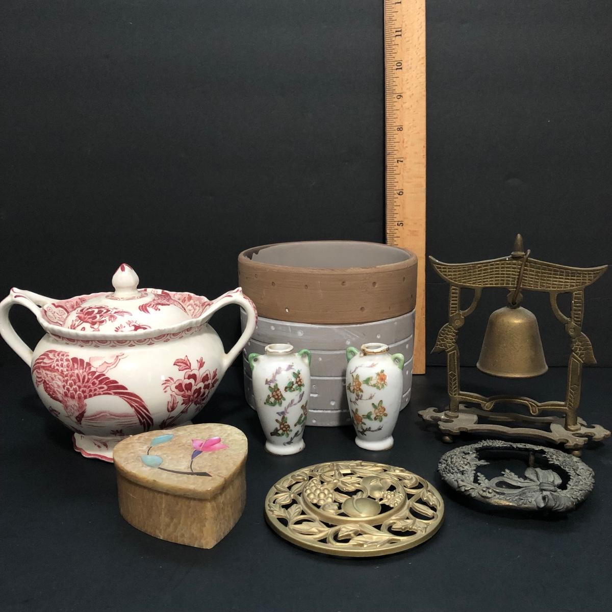LOT 26U: Vintage Home Decor - Miniature Gong, China Pieces, Trinket Box & More