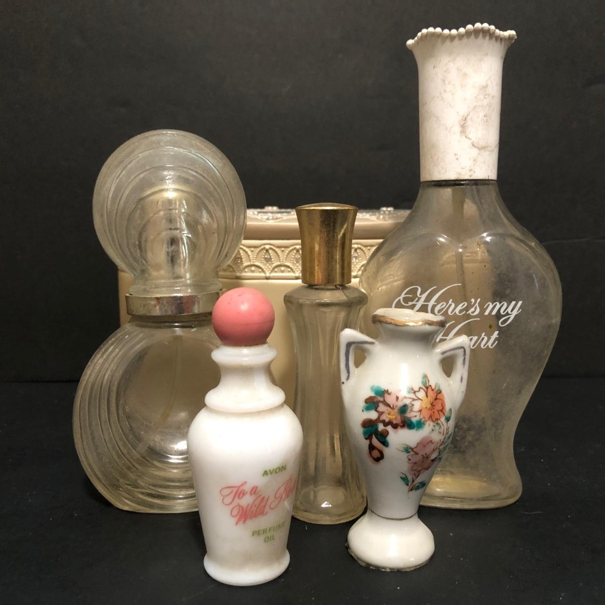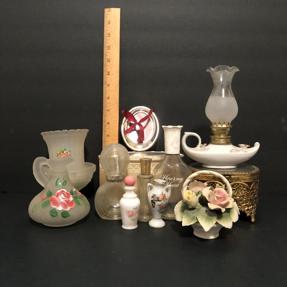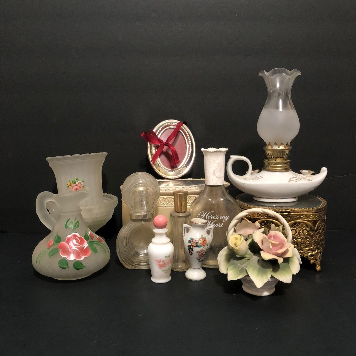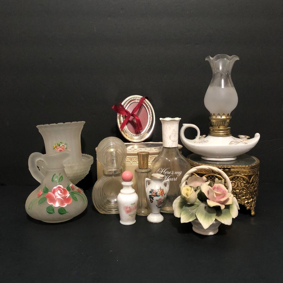 LOT 28U: Vintage Vanity Collection - Engraved Things Remembered Musical Jewelry Box w/ Swarovski Crystal Accents, Porcelain Flower Basket, Mini Oil Lamp, Perfume Bottles & More