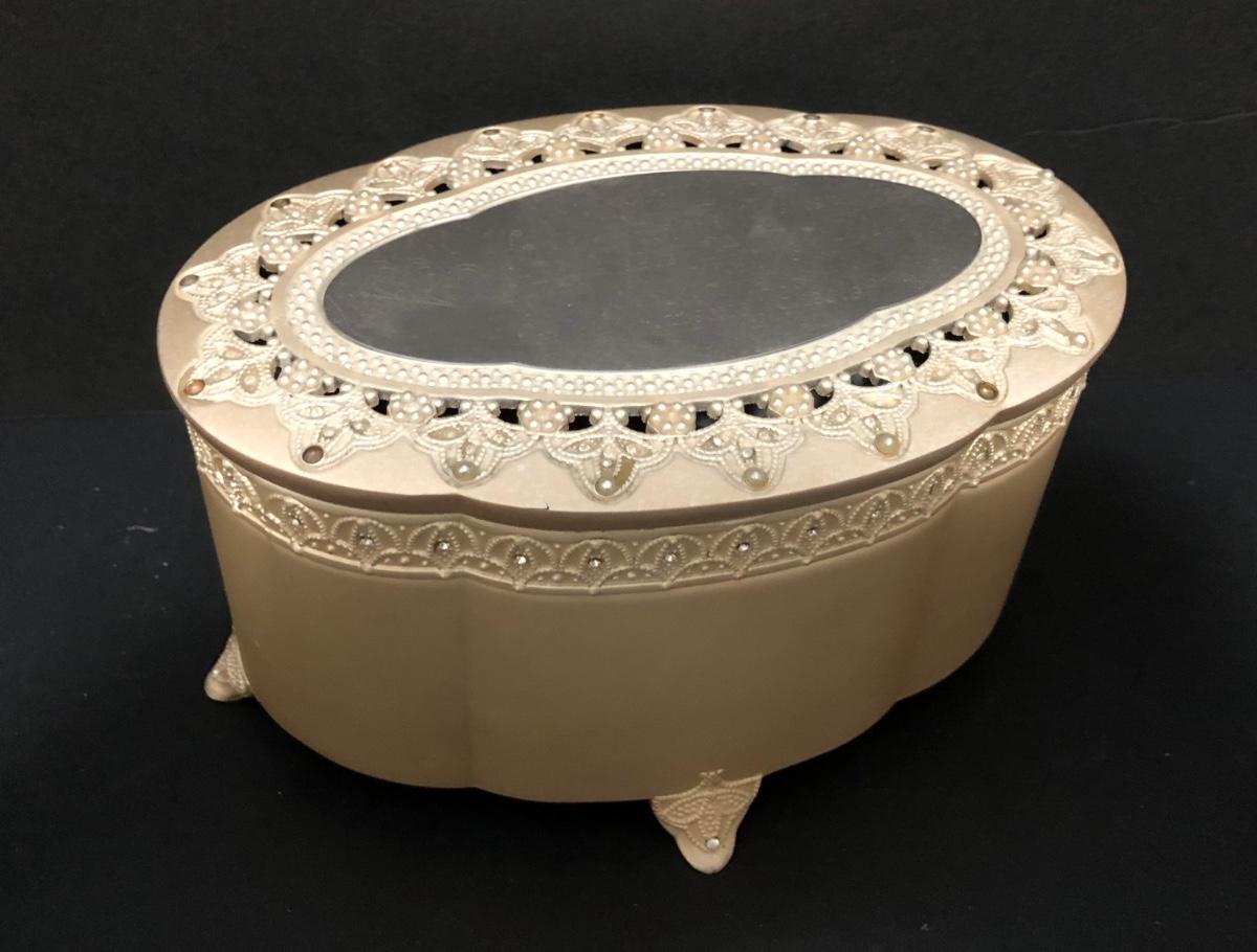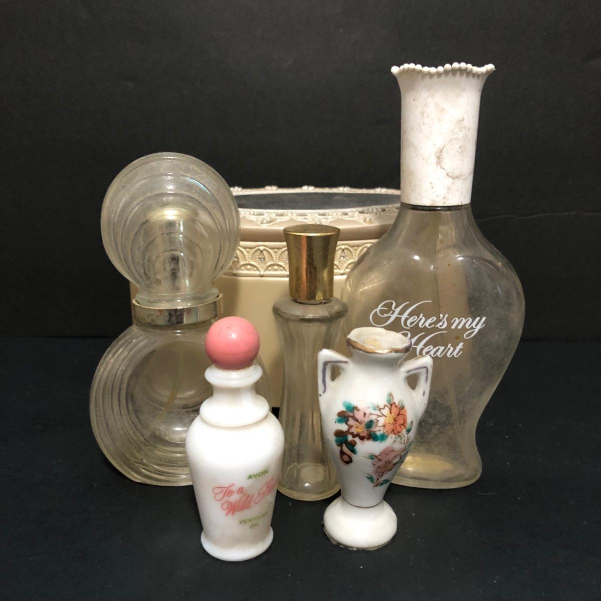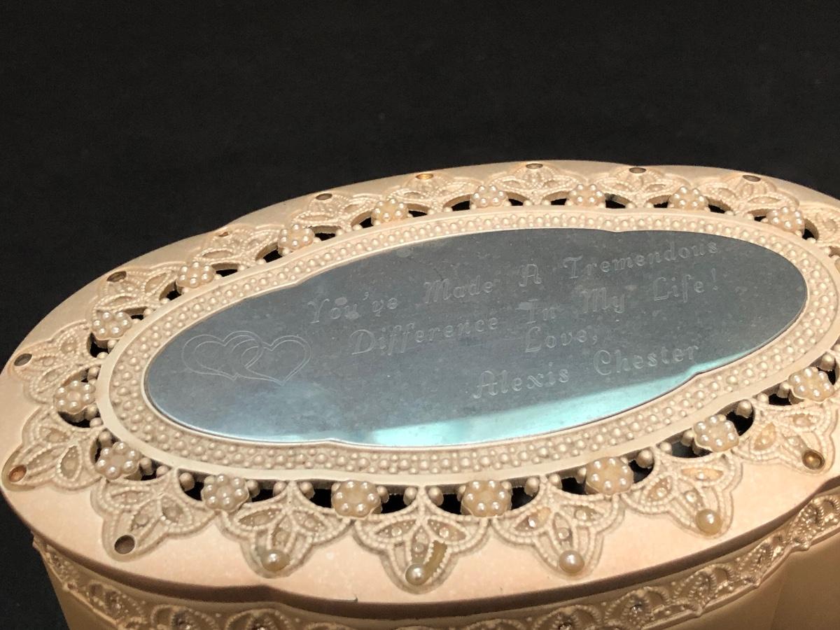 LOT 28U: Vintage Vanity Collection - Engraved Things Remembered Musical Jewelry Box w/ Swarovski Crystal Accents, Porcelain Flower Basket, Mini Oil Lamp, Perfume Bottles & More