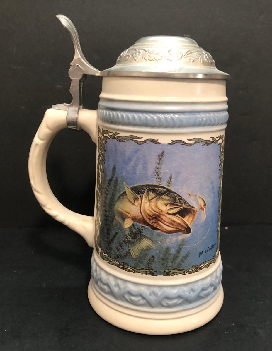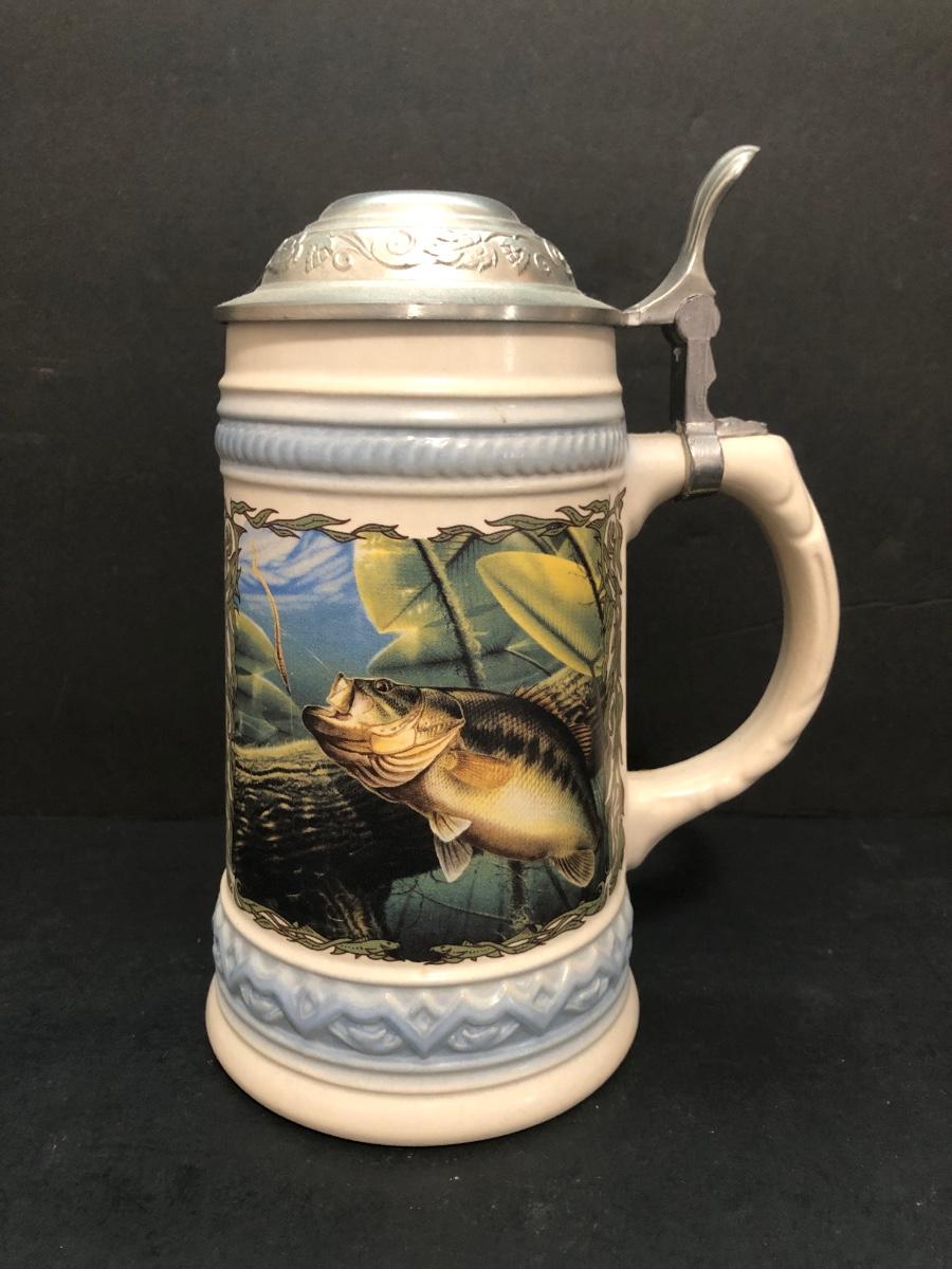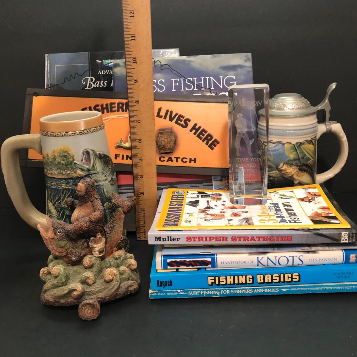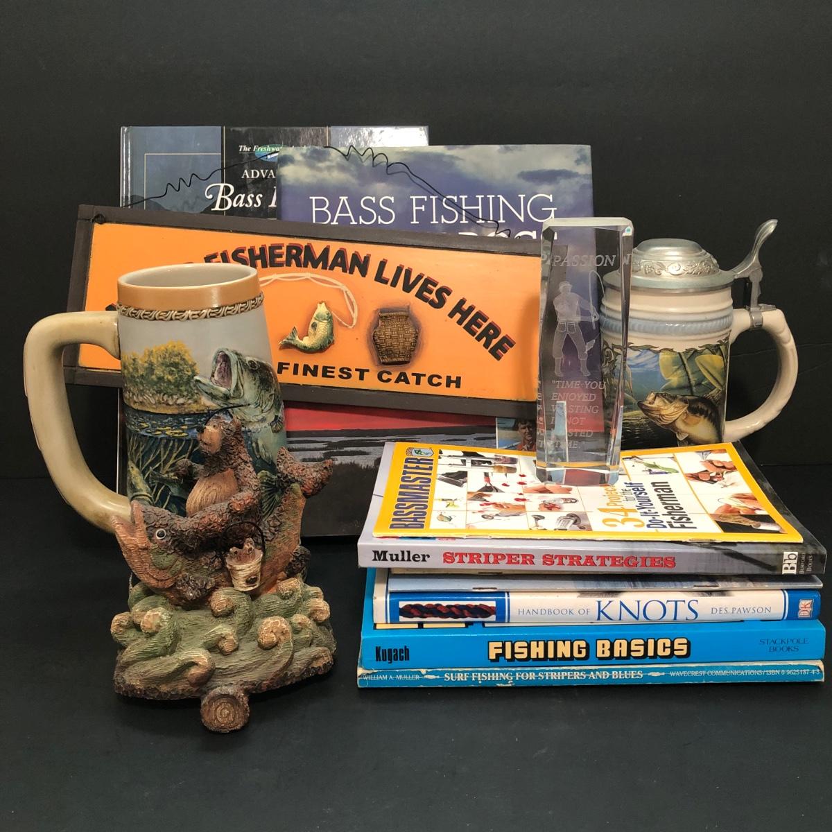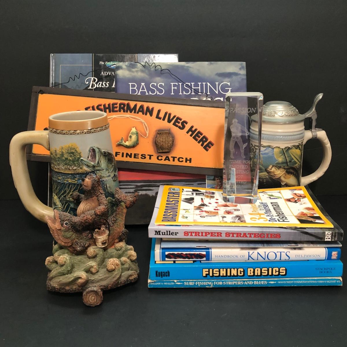 LOT 43U: Fisherman's Collection - Vintage Carolina Collection Ceramarte American Angler Series Large Mouth Bass Stein, Jon A Wright Bass Stein, Fishing Bear Figurine, Books & Decor