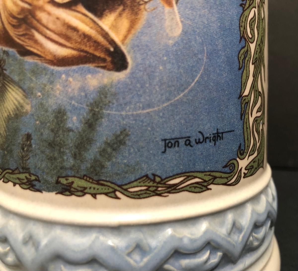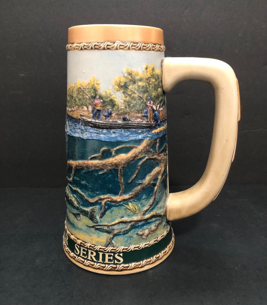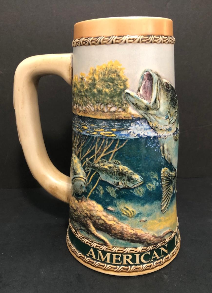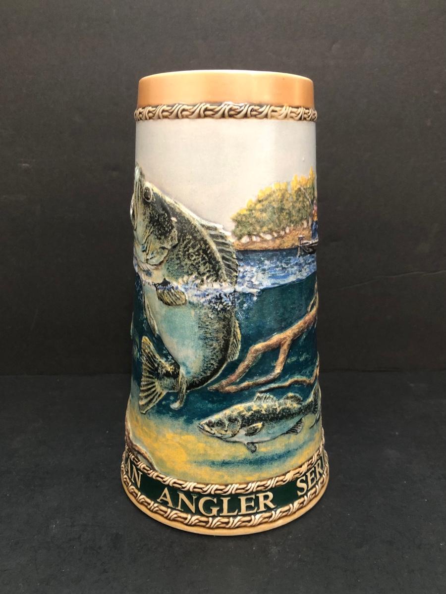 LOT 43U: Fisherman's Collection - Vintage Carolina Collection Ceramarte American Angler Series Large Mouth Bass Stein, Jon A Wright Bass Stein, Fishing Bear Figurine, Books & Decor