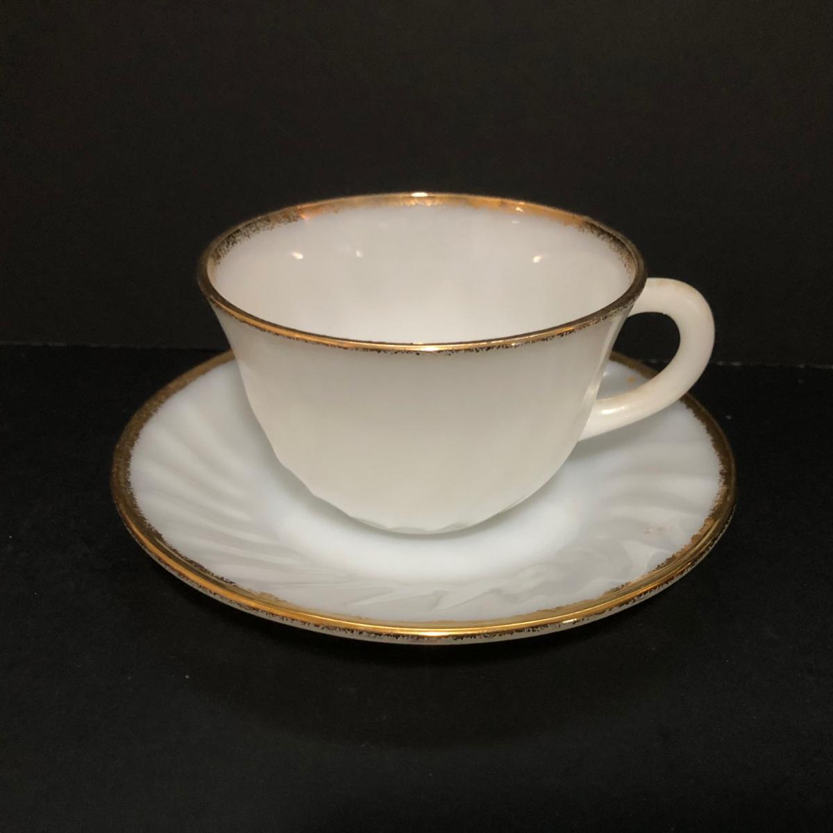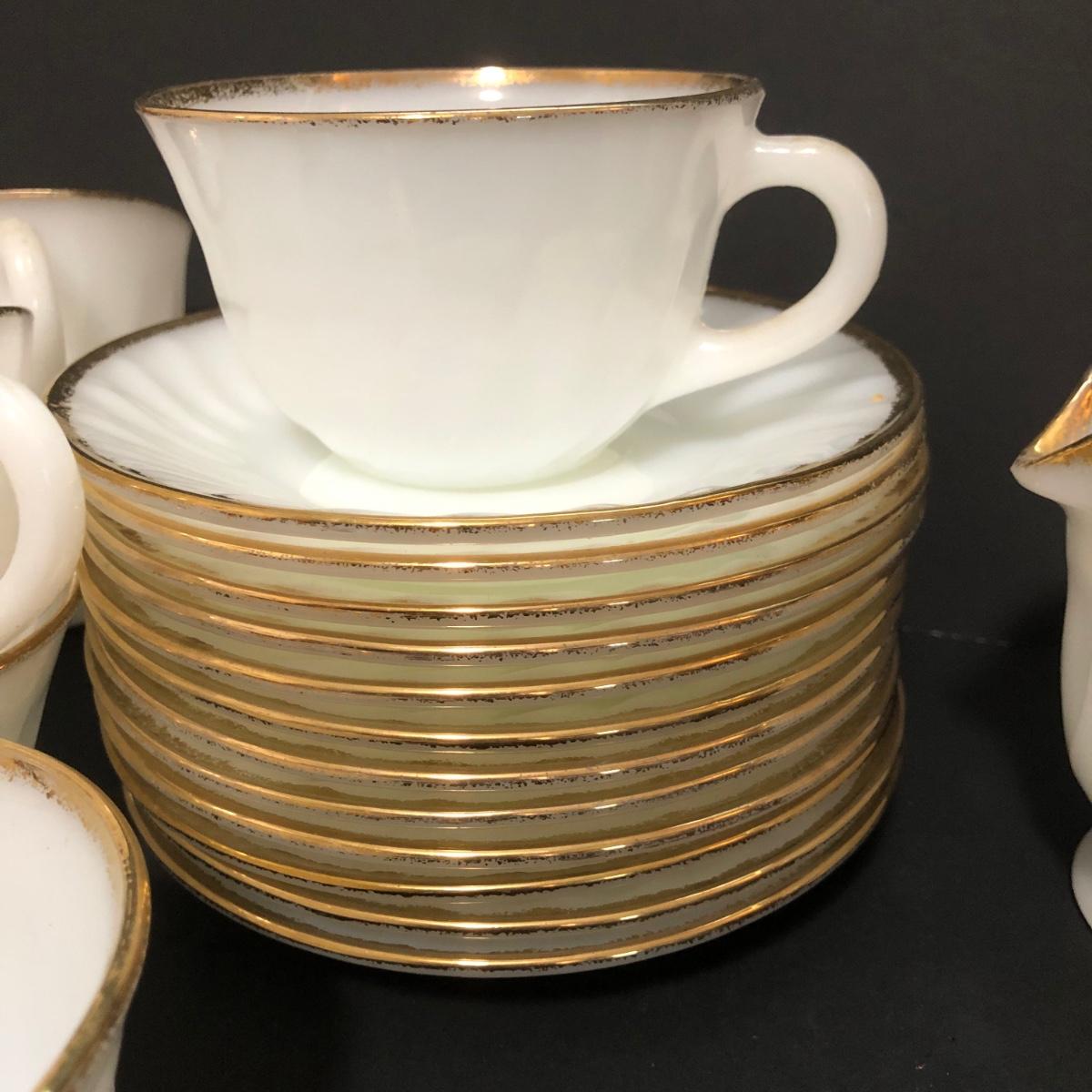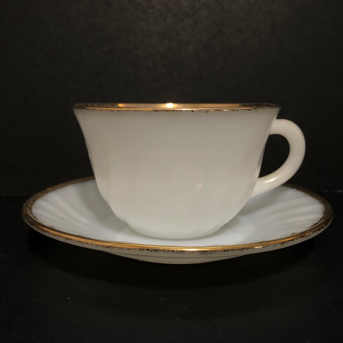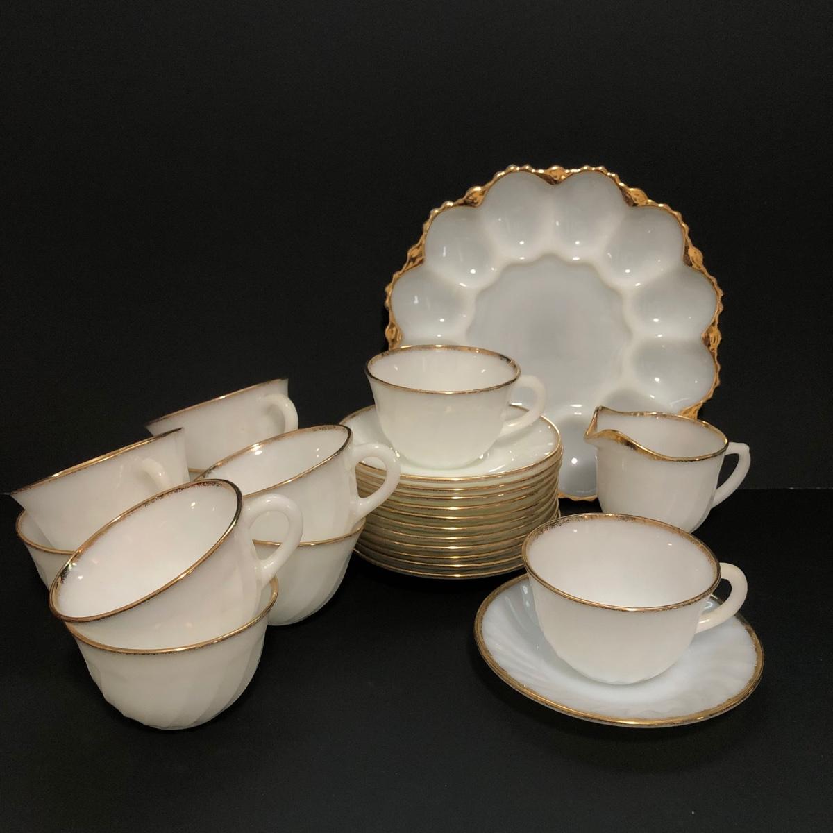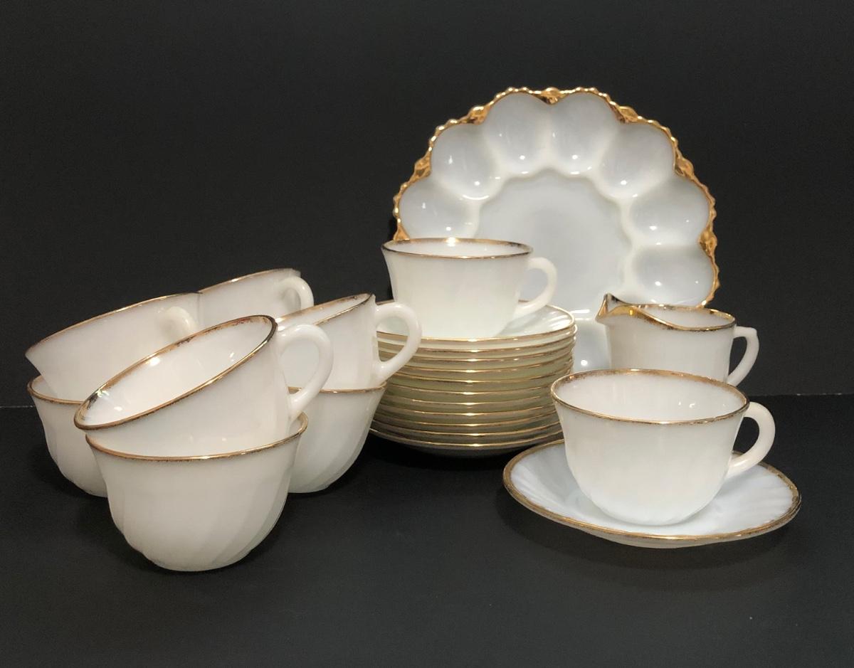 LOT 63U: Vintage Milk Glass - Fireking Teacups & Saucers w/ Anchor Hocking Egg Plate