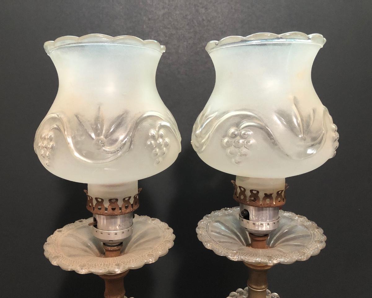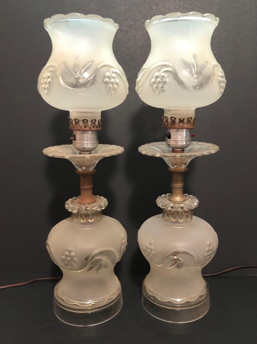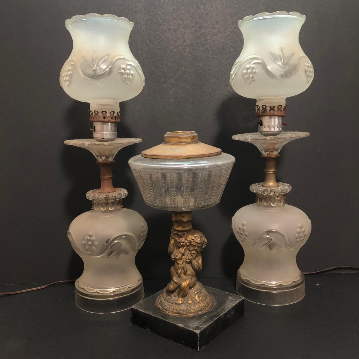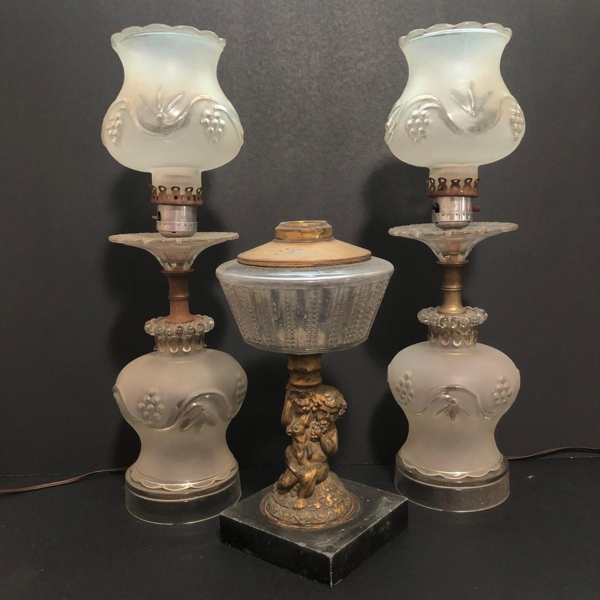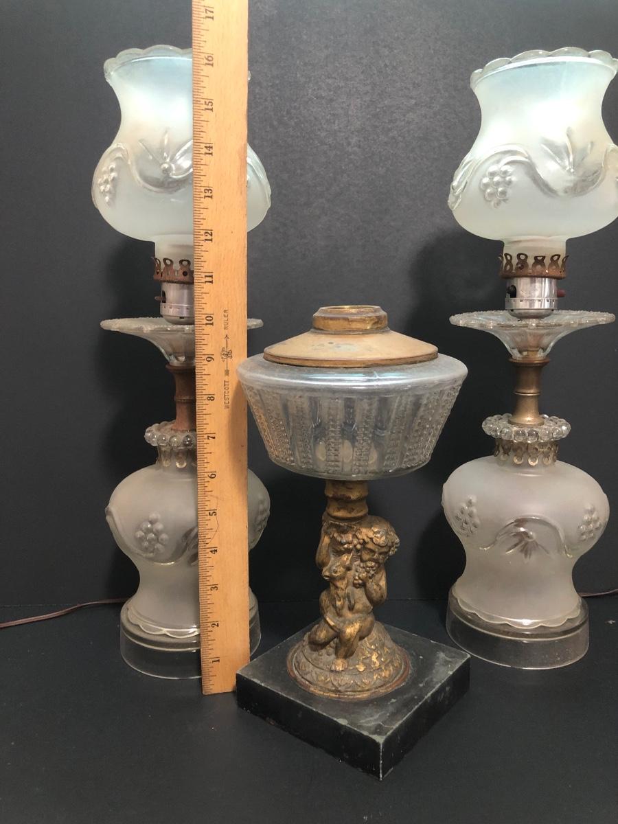 LOT 64U: Antique / Vintage Lamps - Electric Frosted Glass Hurricane Lamps & Composite Grape Harvest Stem Oil Lamp Base
