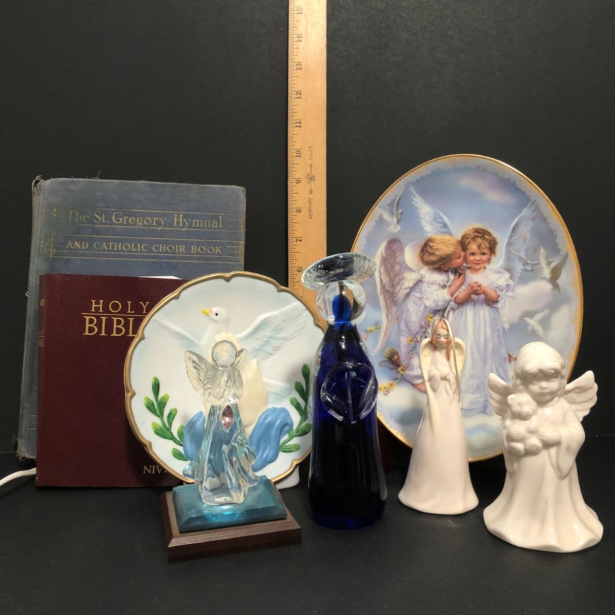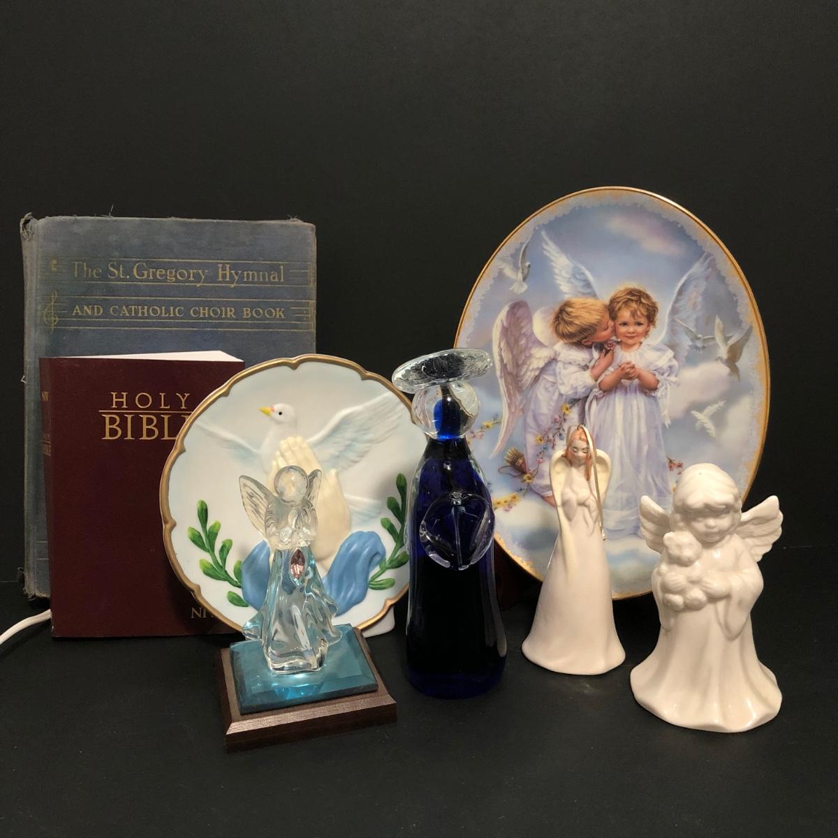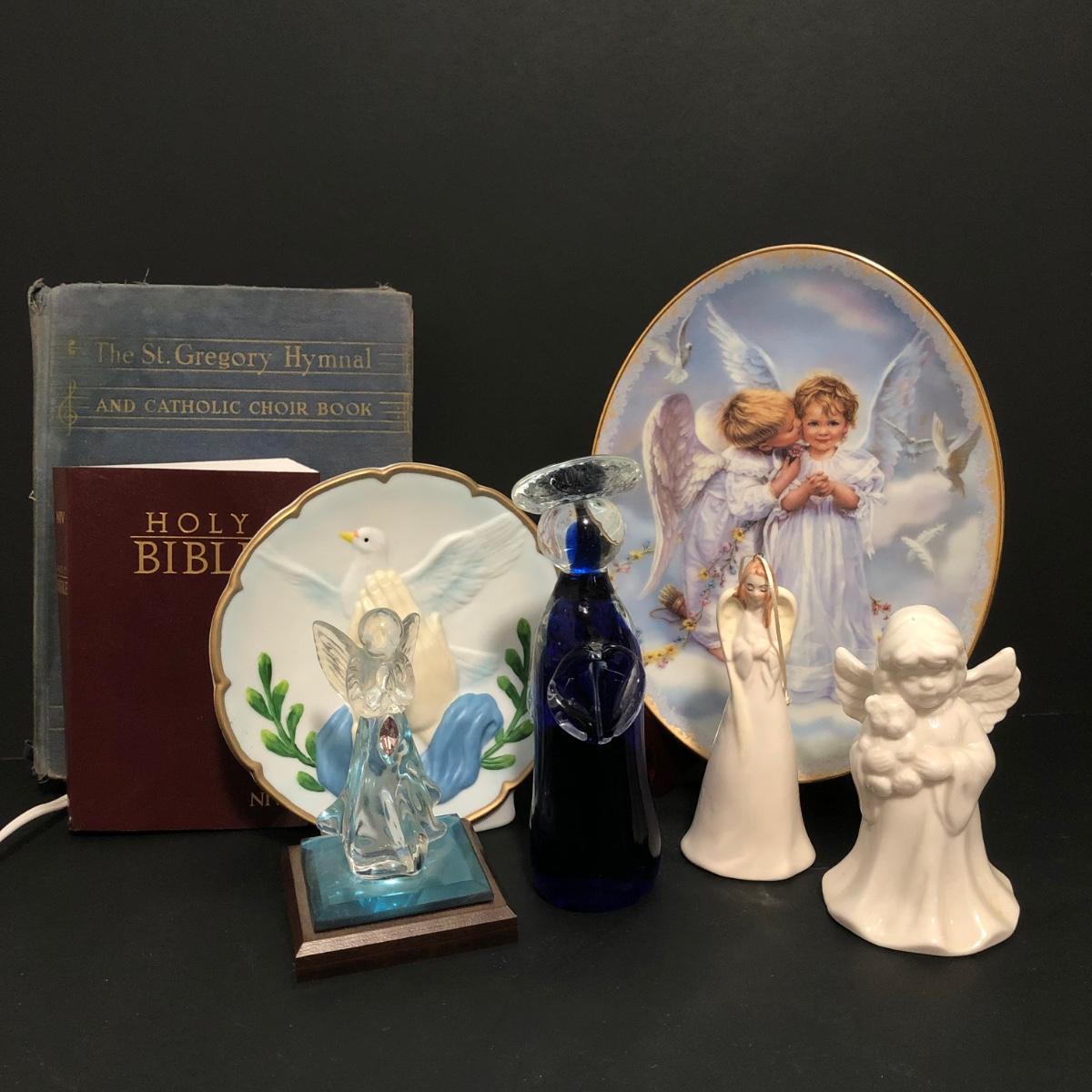 LOT 67U: Religious Decor & Books - Bradford Exchange Sandra Kuck's On Angels Wings #1 Plate, Praying Hands Dove Lamp, Angel Bells & More