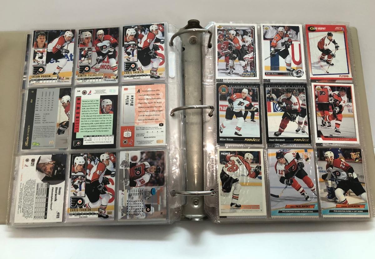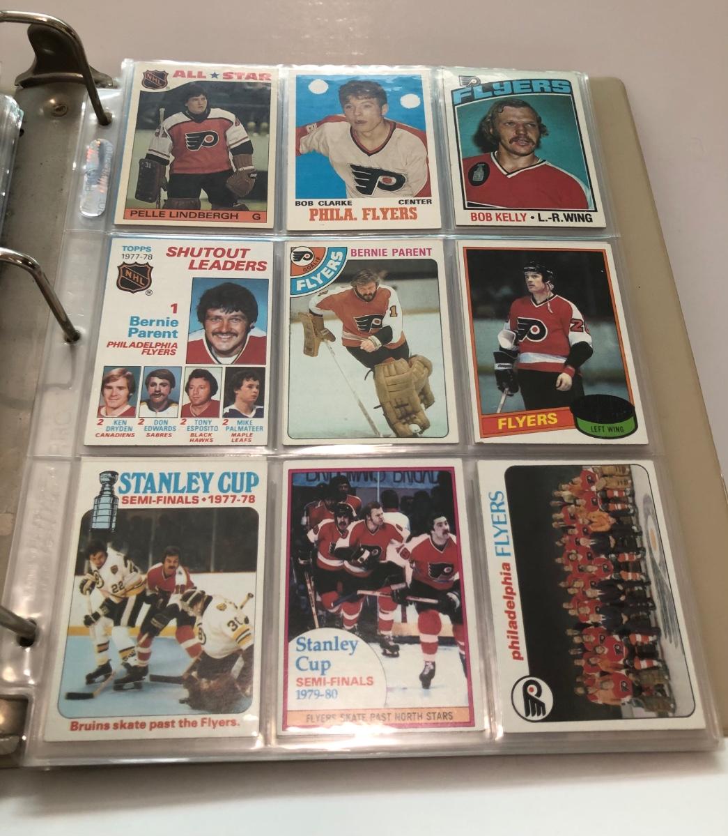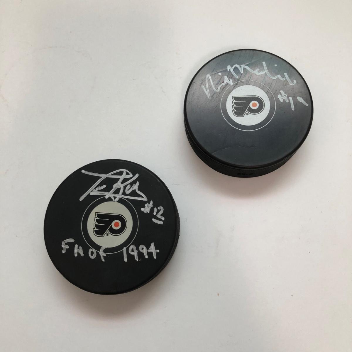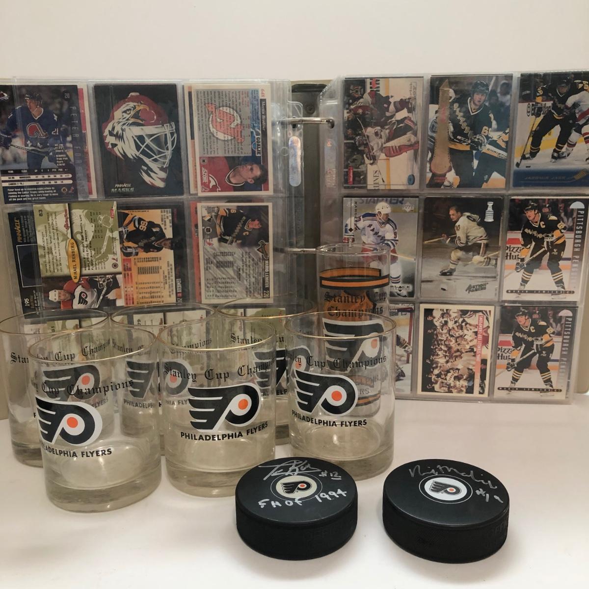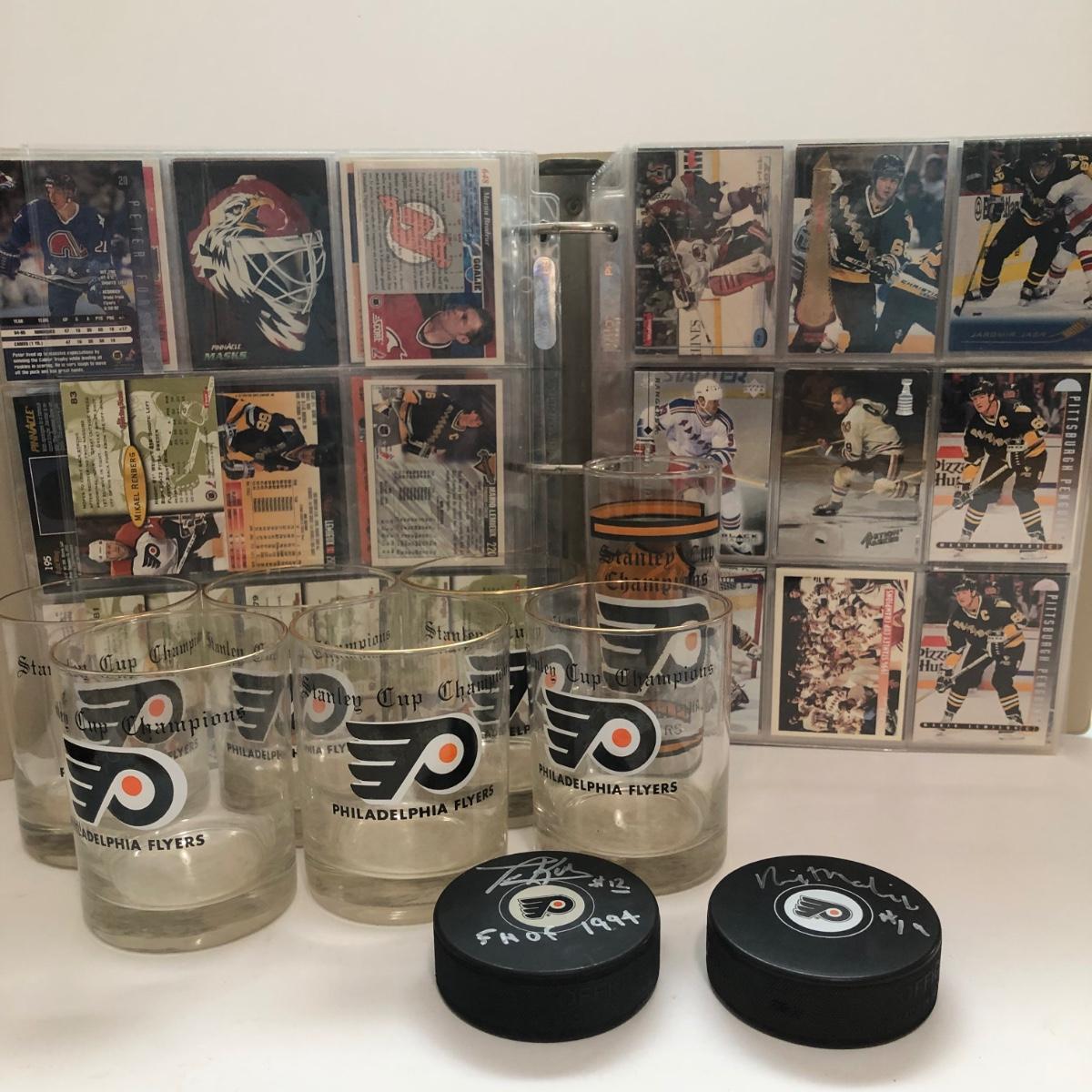 LOT 204U: Signed Philadelphia Flyer's Hockey Pucks (Tim Kerr & Ric MacLeish), Flyers Stanley Cup Glasses & Binder full of Hockey Trading Cards