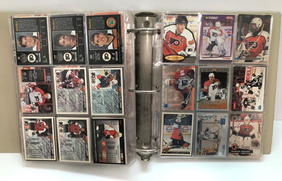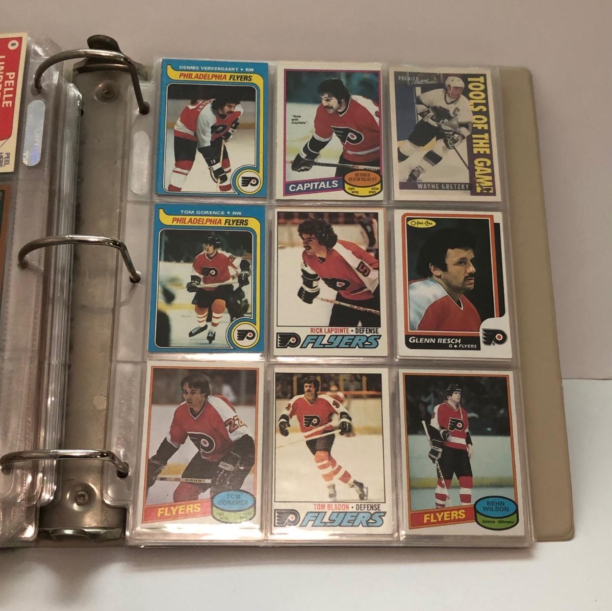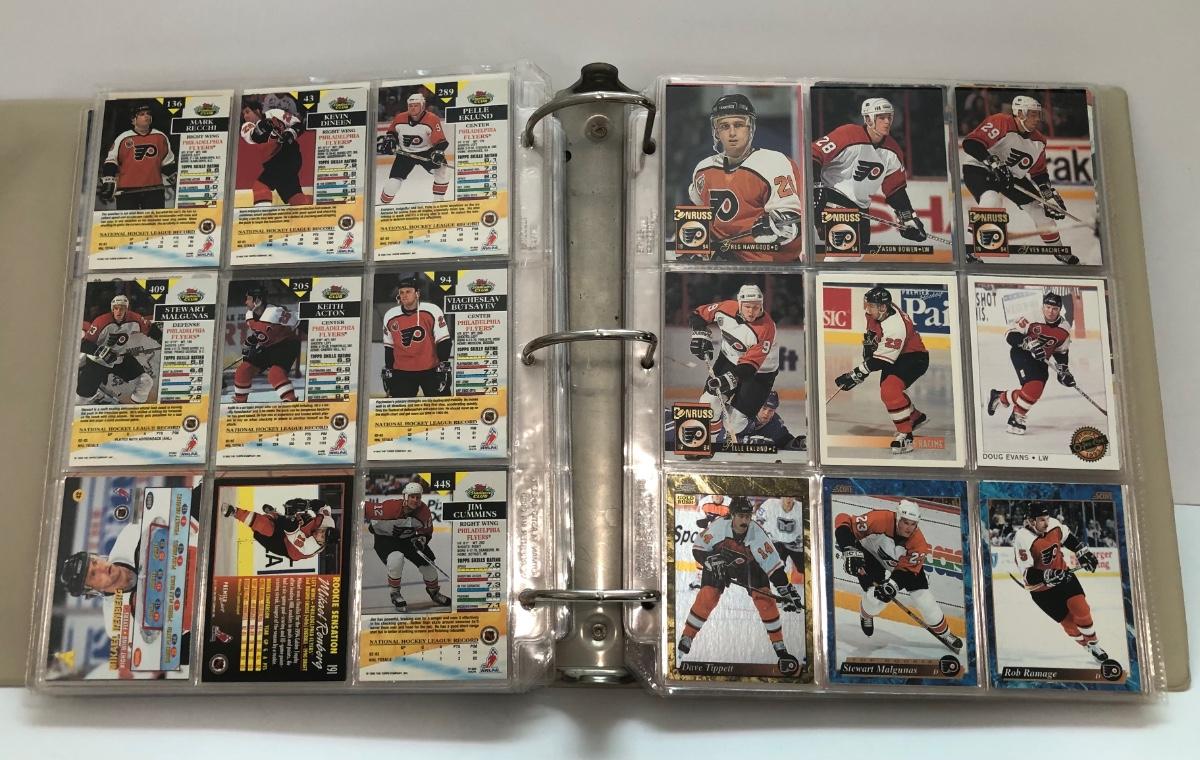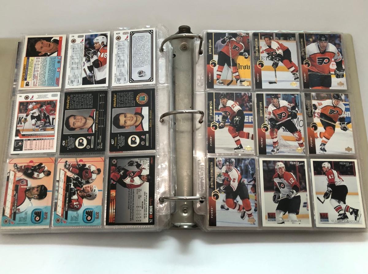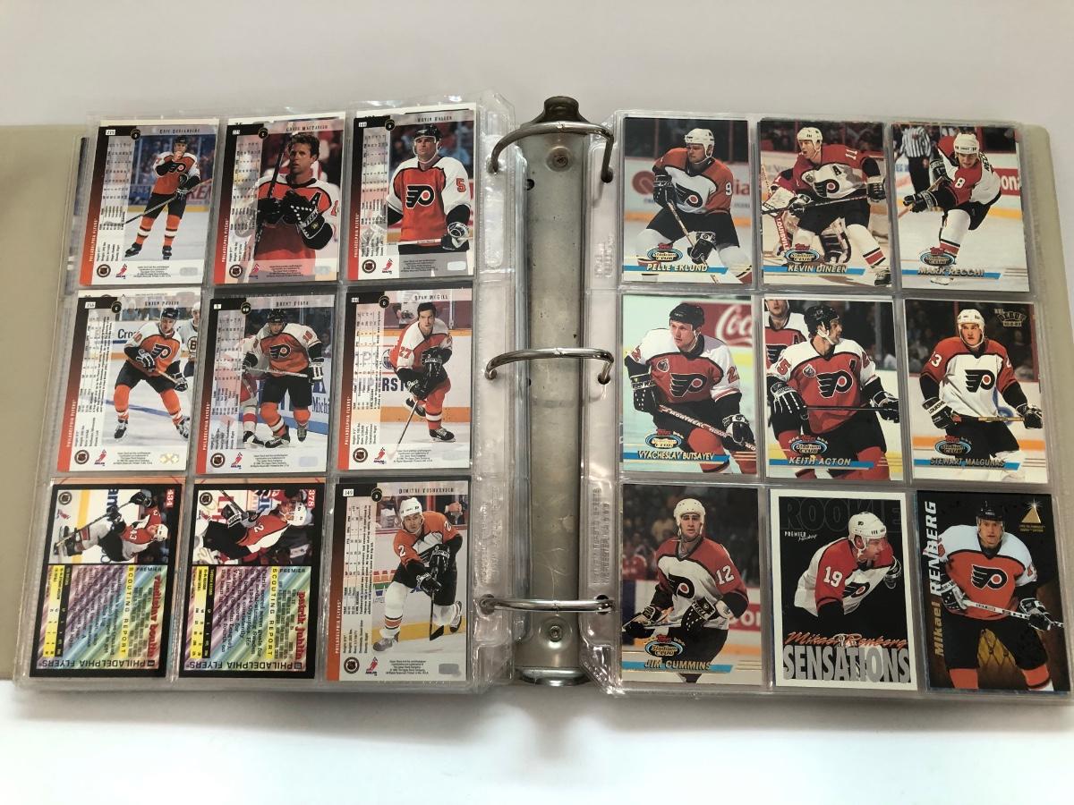 LOT 204U: Signed Philadelphia Flyer's Hockey Pucks (Tim Kerr & Ric MacLeish), Flyers Stanley Cup Glasses & Binder full of Hockey Trading Cards