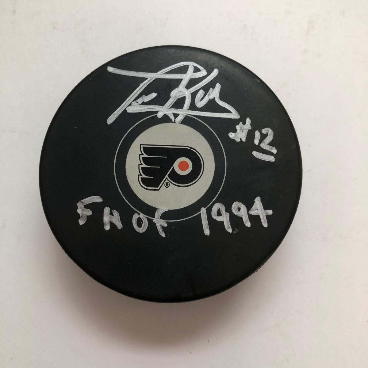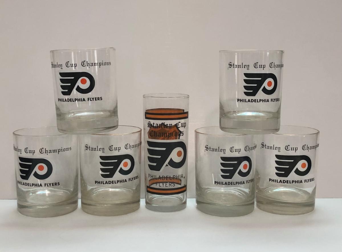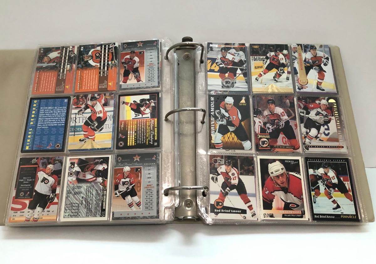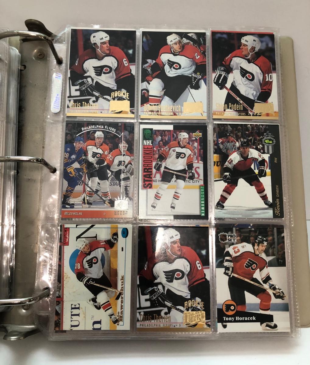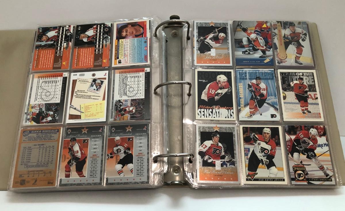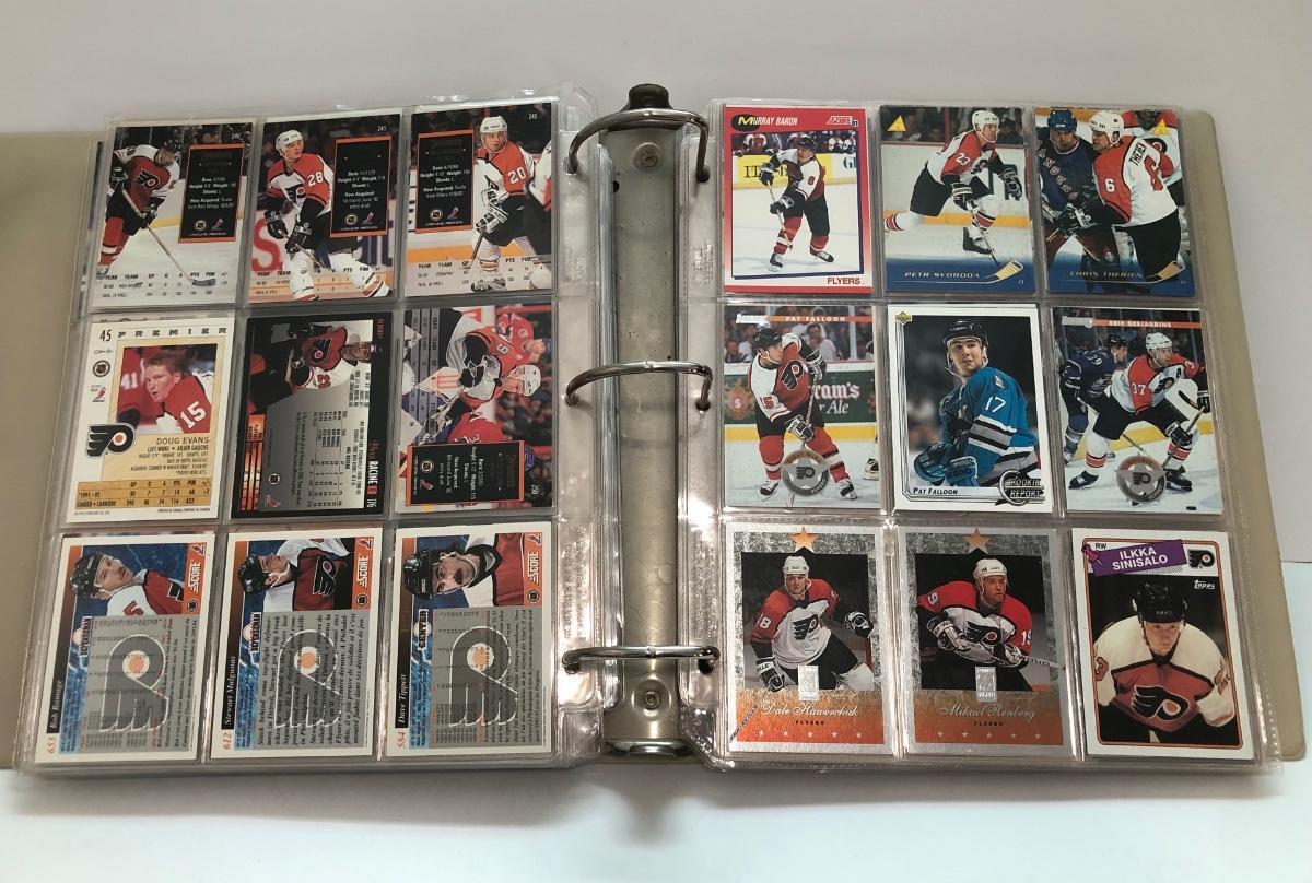 LOT 204U: Signed Philadelphia Flyer's Hockey Pucks (Tim Kerr & Ric MacLeish), Flyers Stanley Cup Glasses & Binder full of Hockey Trading Cards