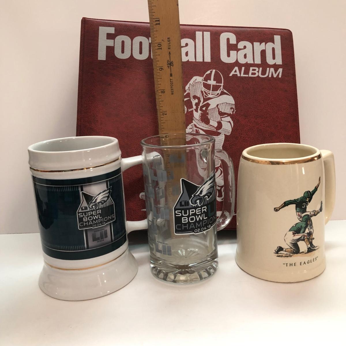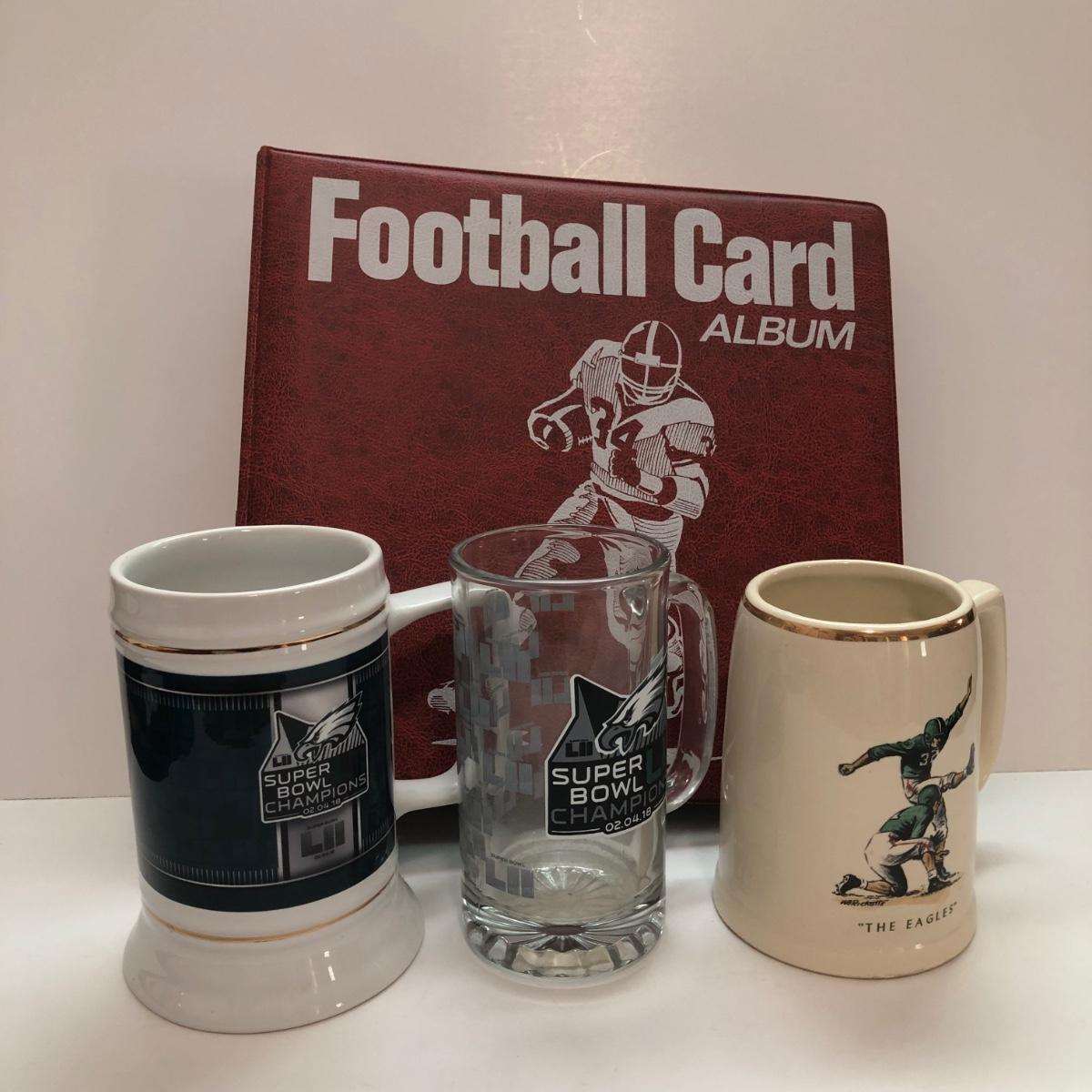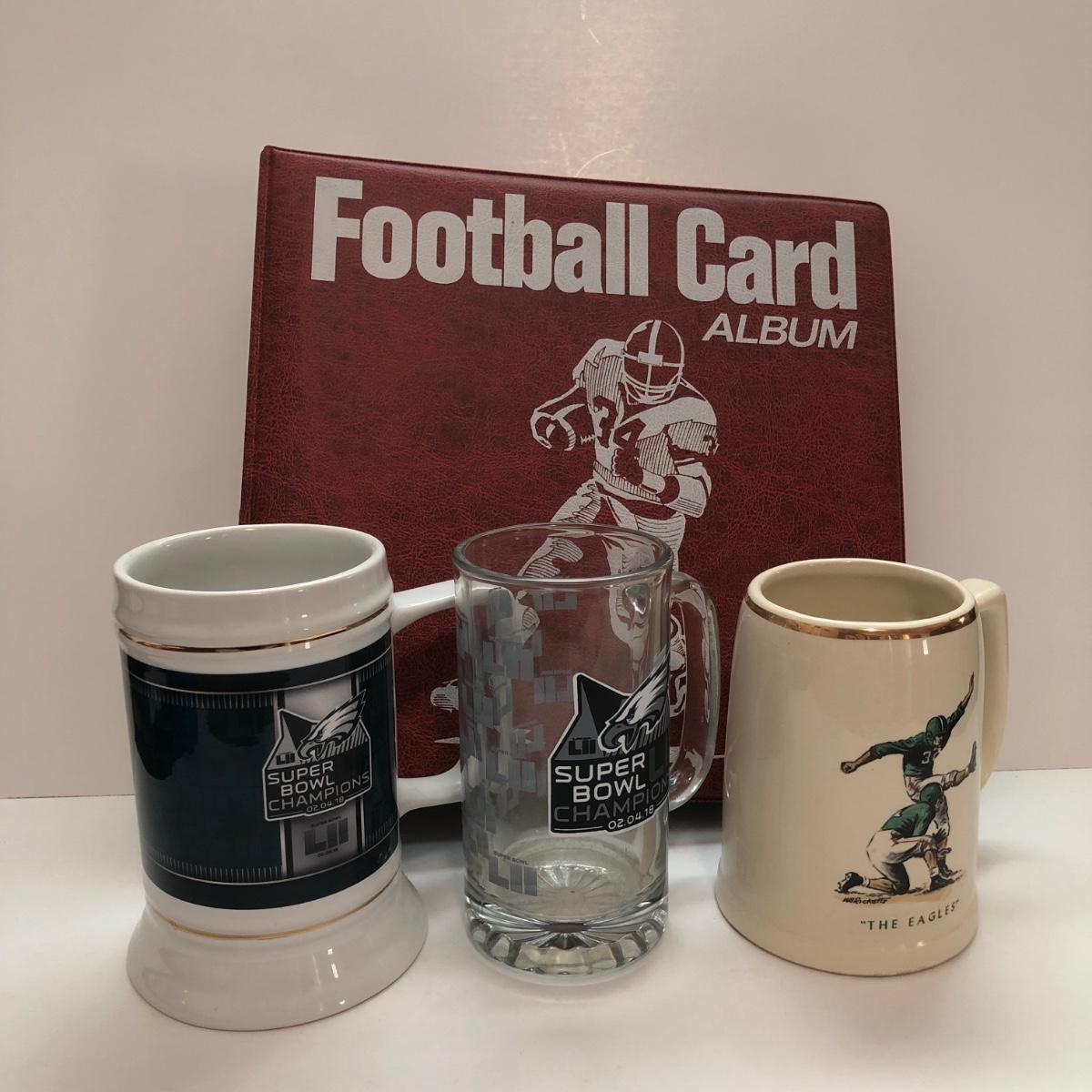 LOT 206U: Binder full of Football Trading Cards, 2018 Philadelphia Eagles Superbowl Champions Mugs & Vintage Ceramarte Delano Studios Eagles Mug