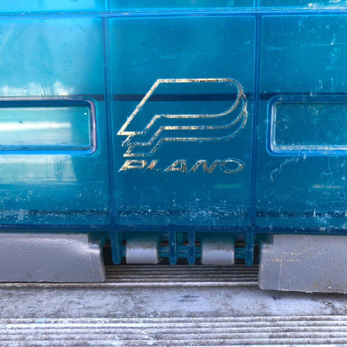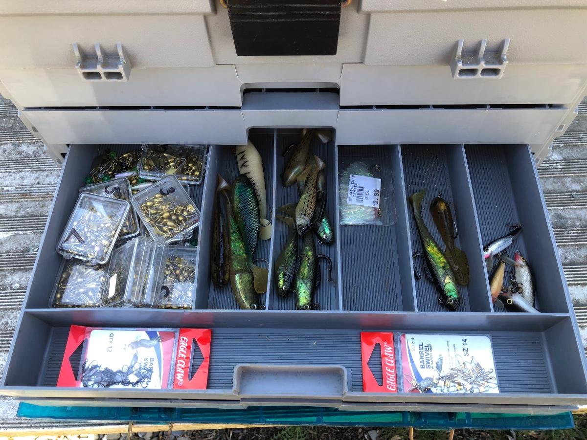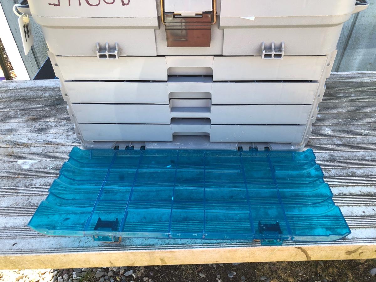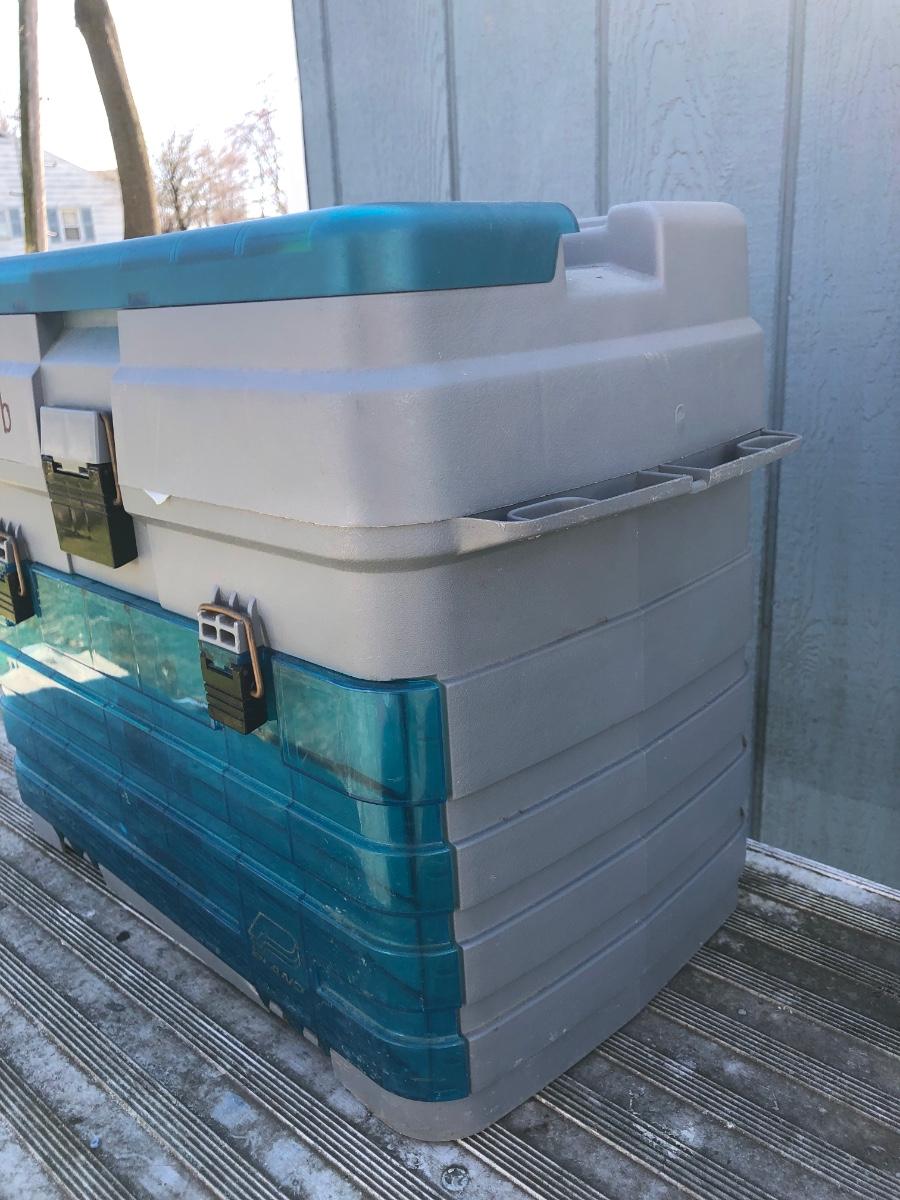 LOT 219S: Piano Guide Series Blue & Gray Tacklebox full of Freshwater Fishing Gear / Supplies