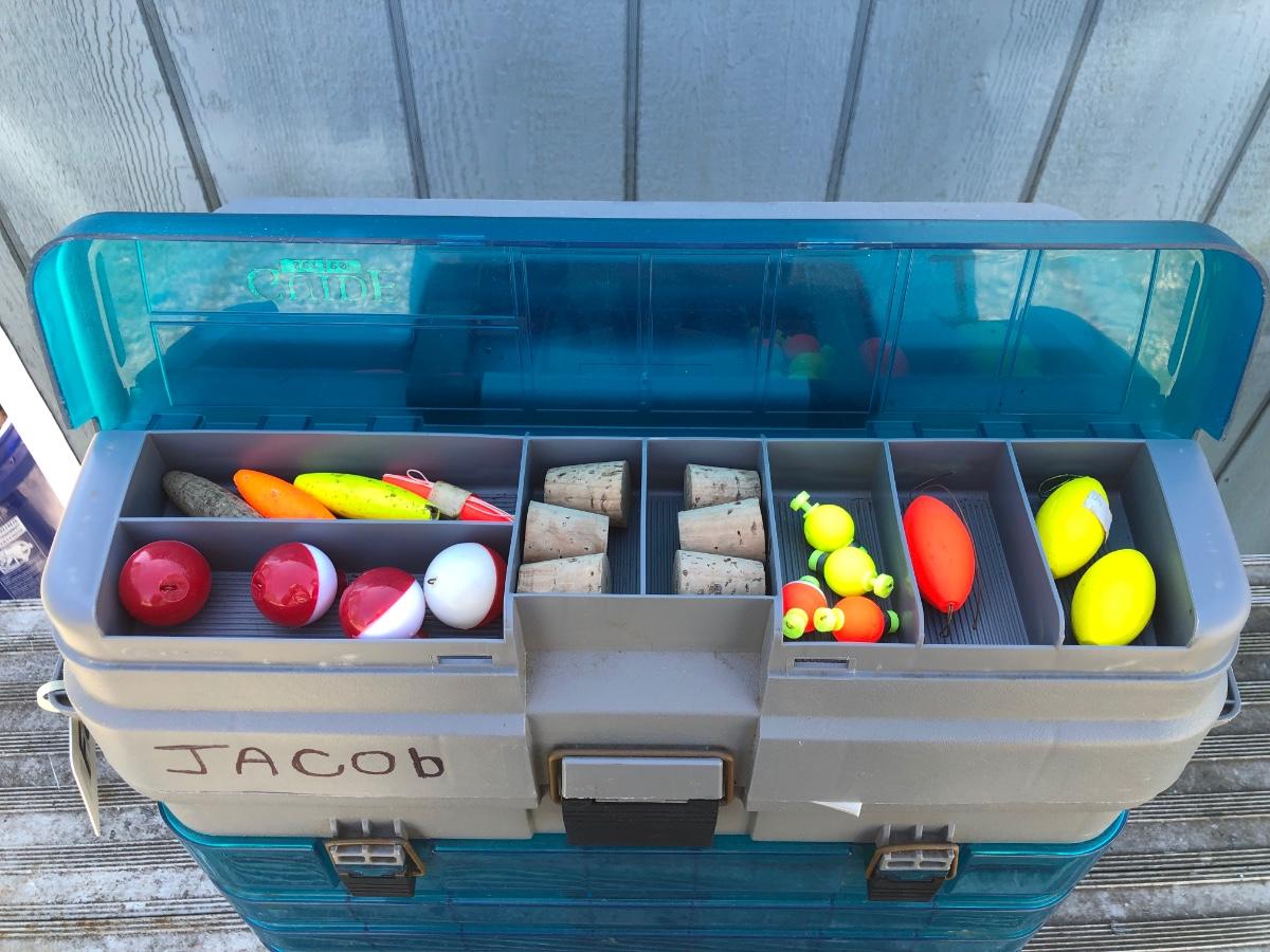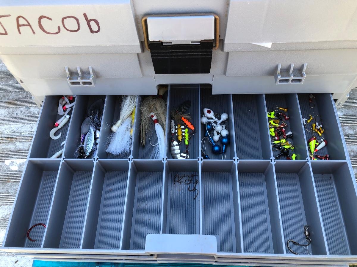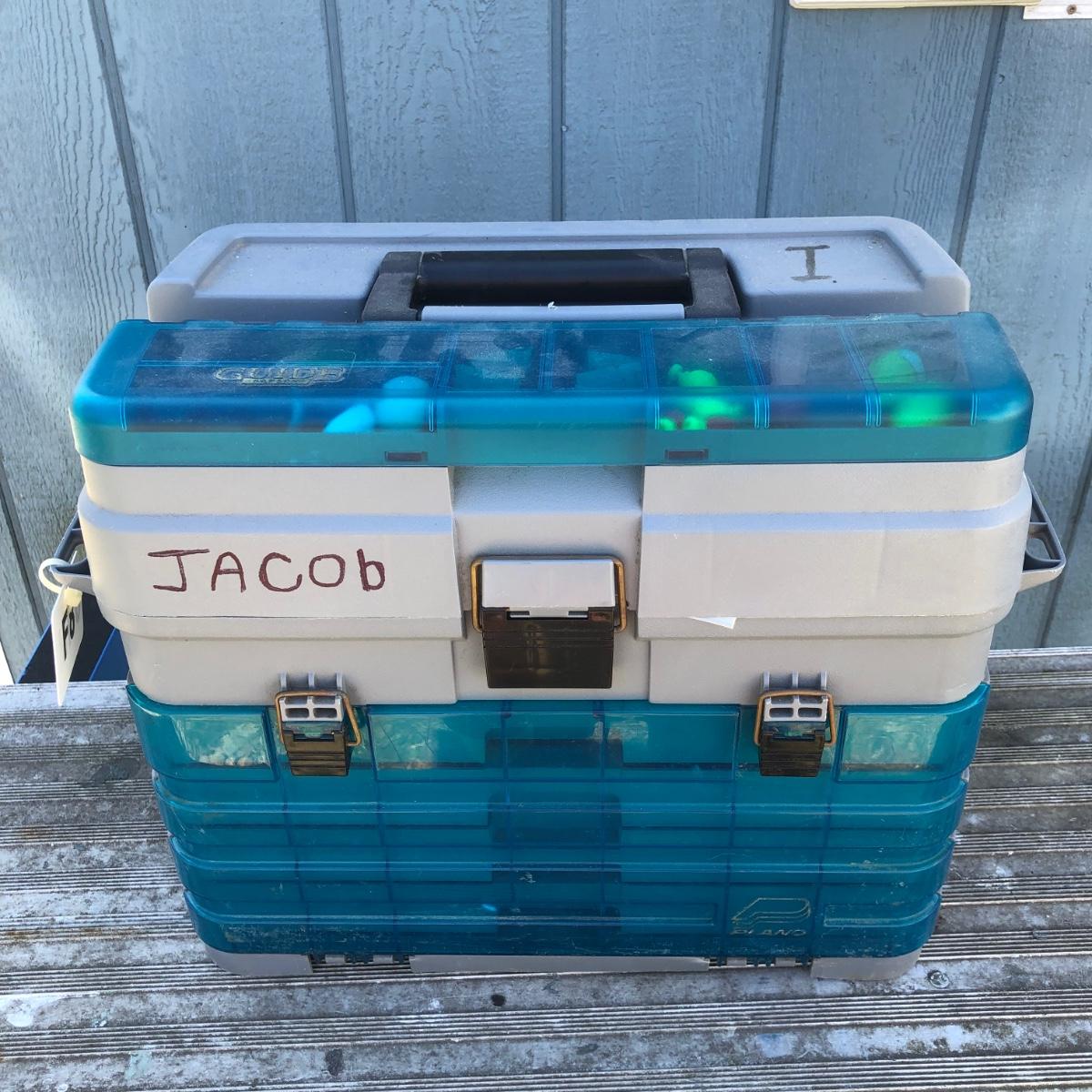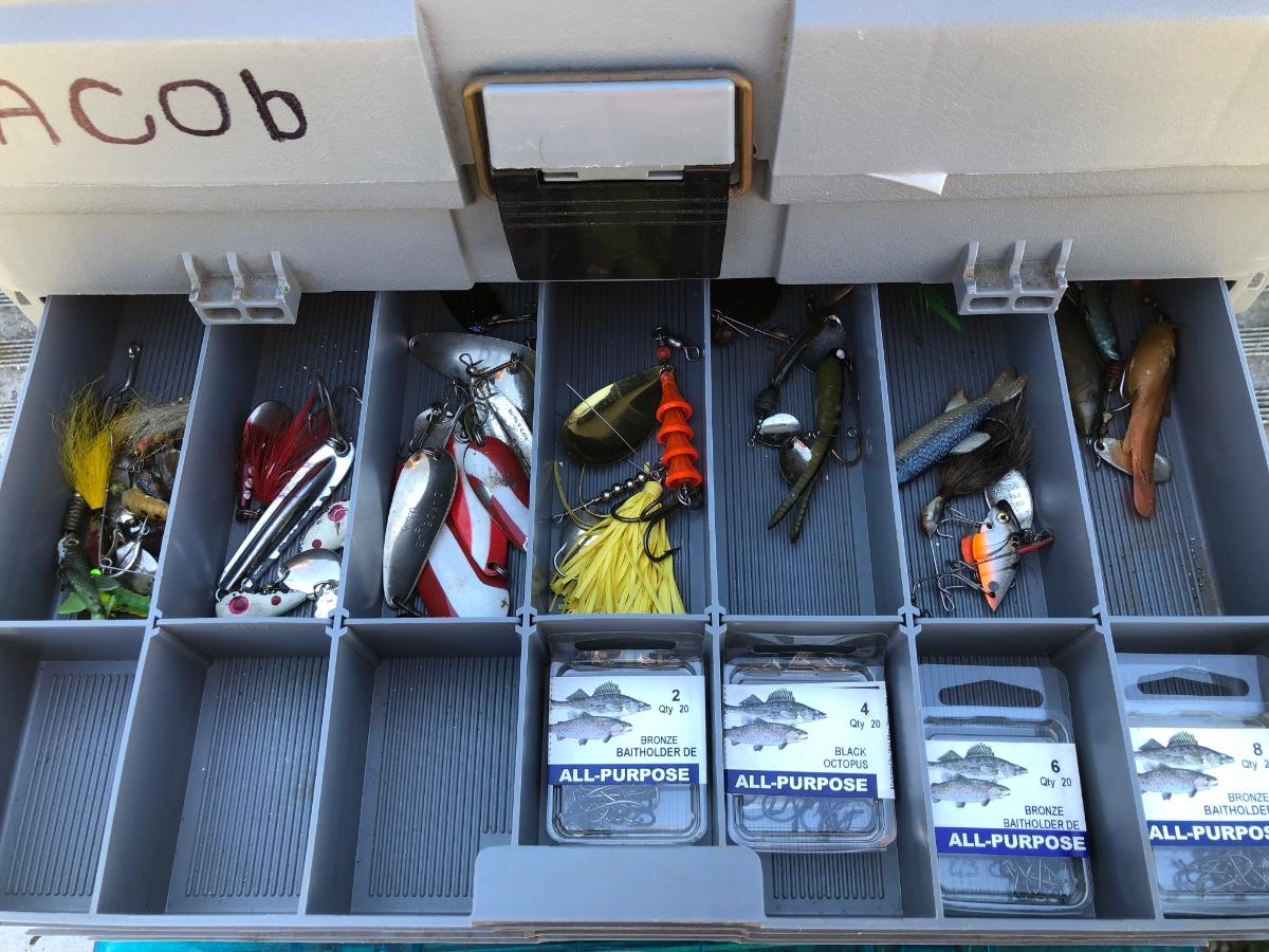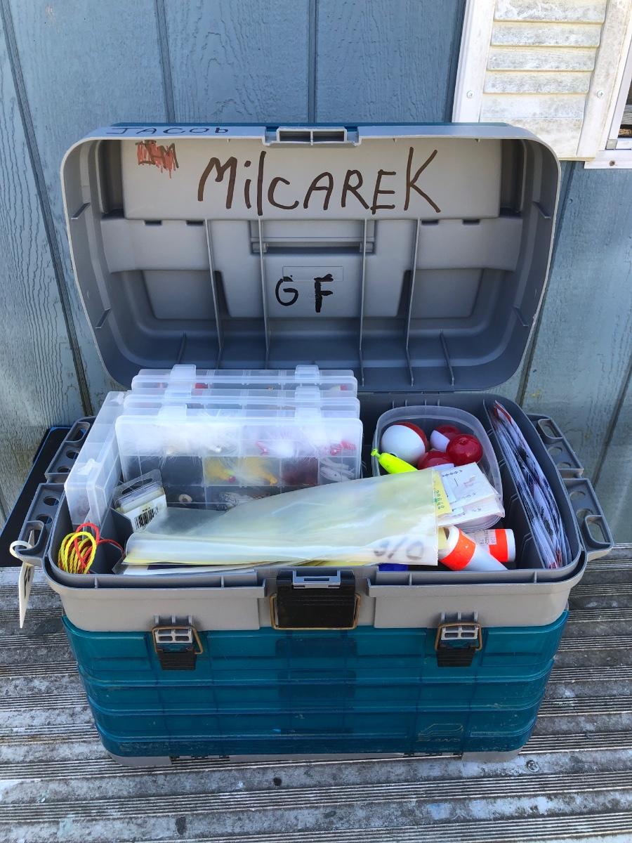 LOT 219S: Piano Guide Series Blue & Gray Tacklebox full of Freshwater Fishing Gear / Supplies