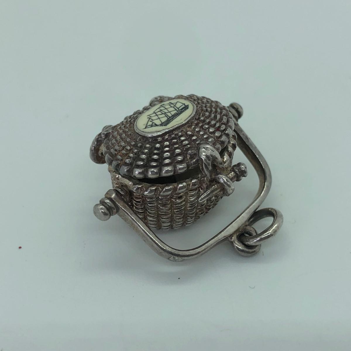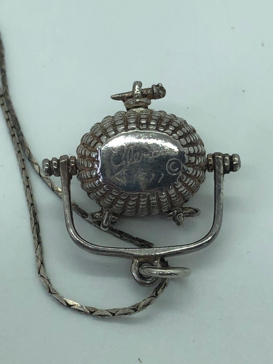 Vintage 1977 Glenaan Sterling silver Nantucket lighthouse Basket Pendant. Pendant The top of miniature lighthouse basket shows a scrimshaw ship. The bottom is signed Glenaan 1977. In great condition. Italian chain weighs 1.90g and pendant weighs 8.56g.
