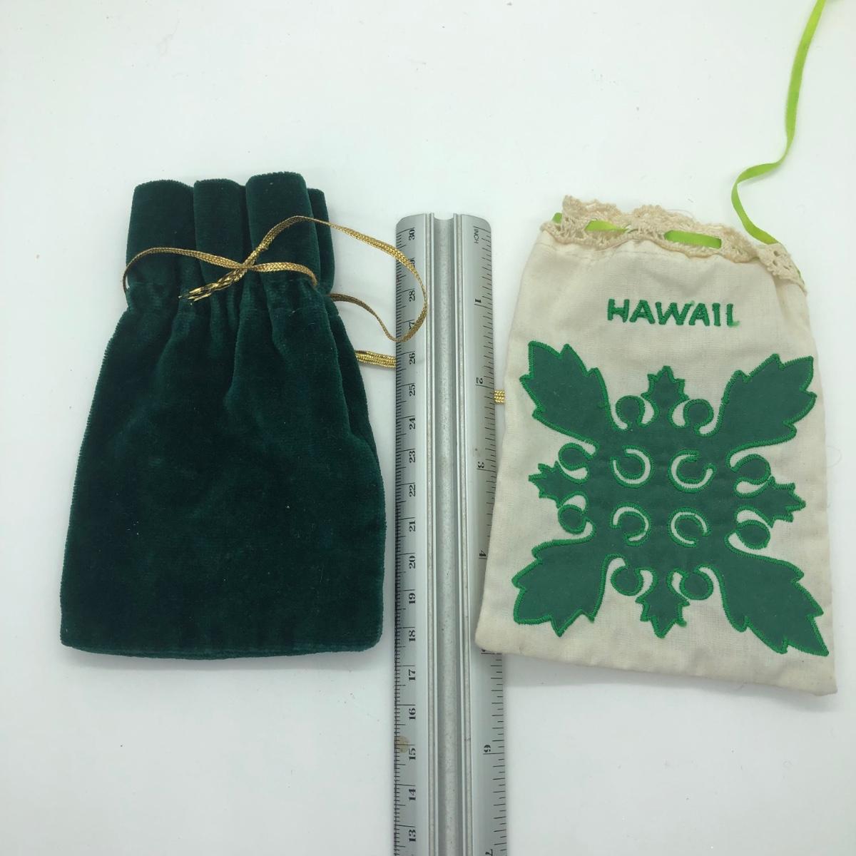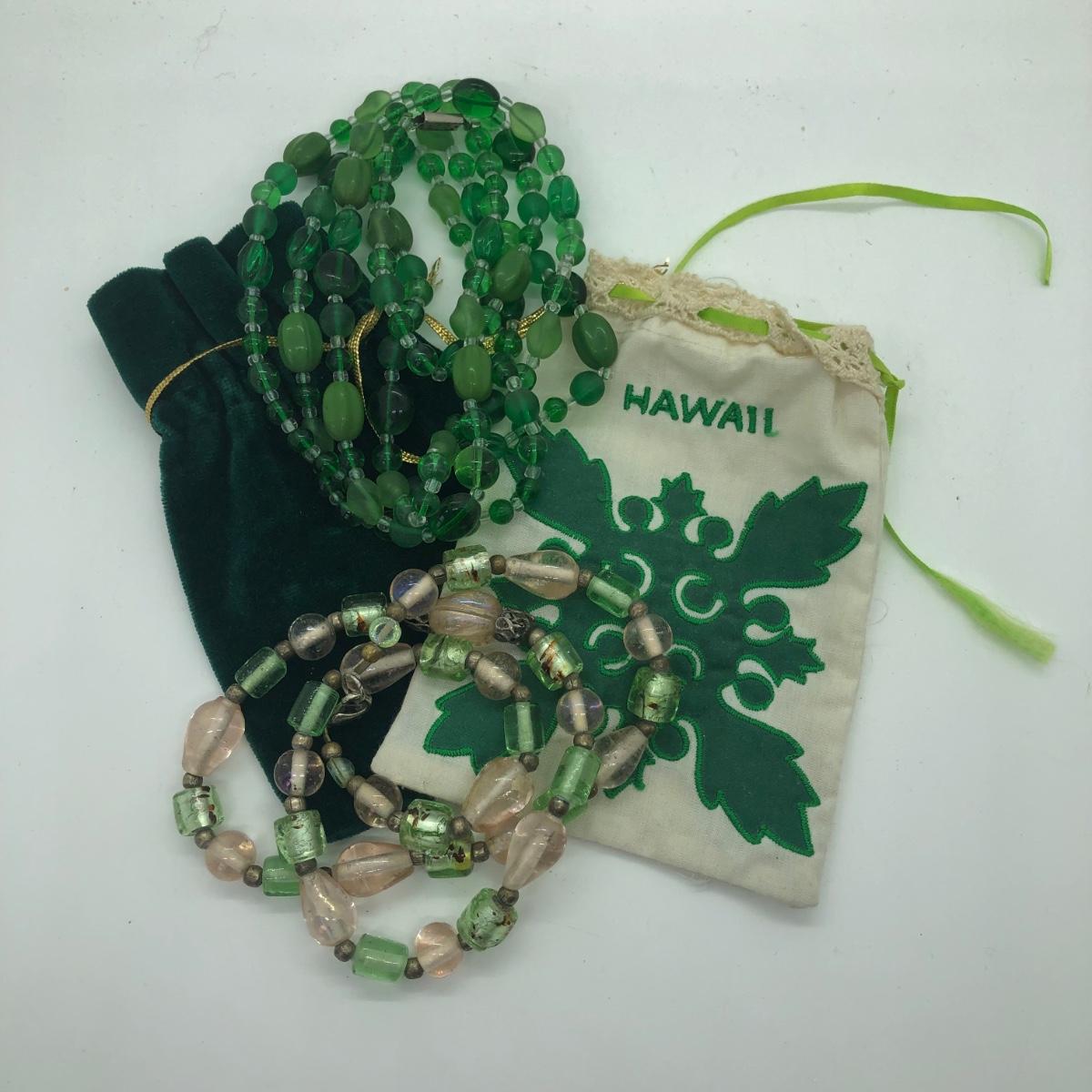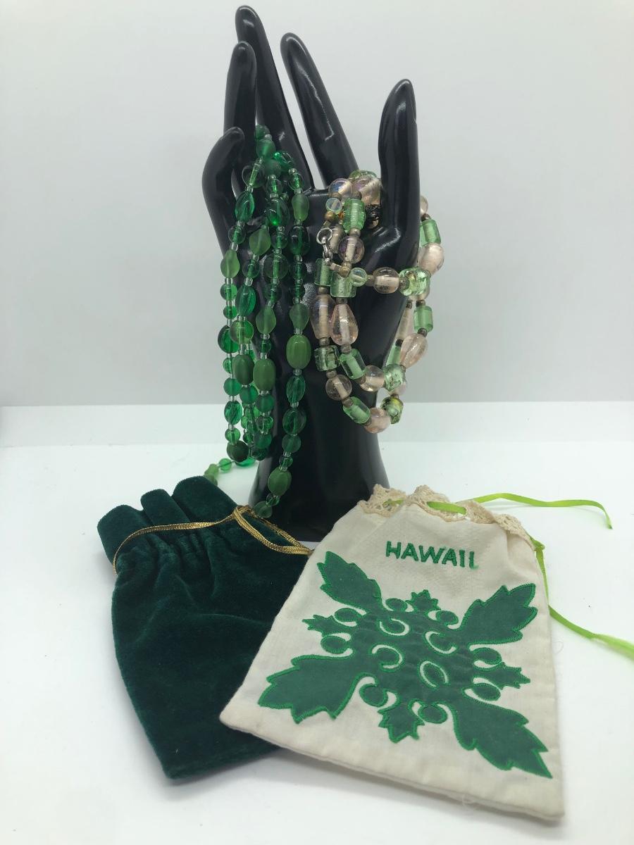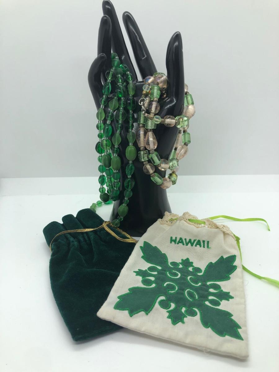 LOT 27J: Green Collection - Beaded Necklaces w/ Vintage Hawaii & Velvet Jewelry Pouches