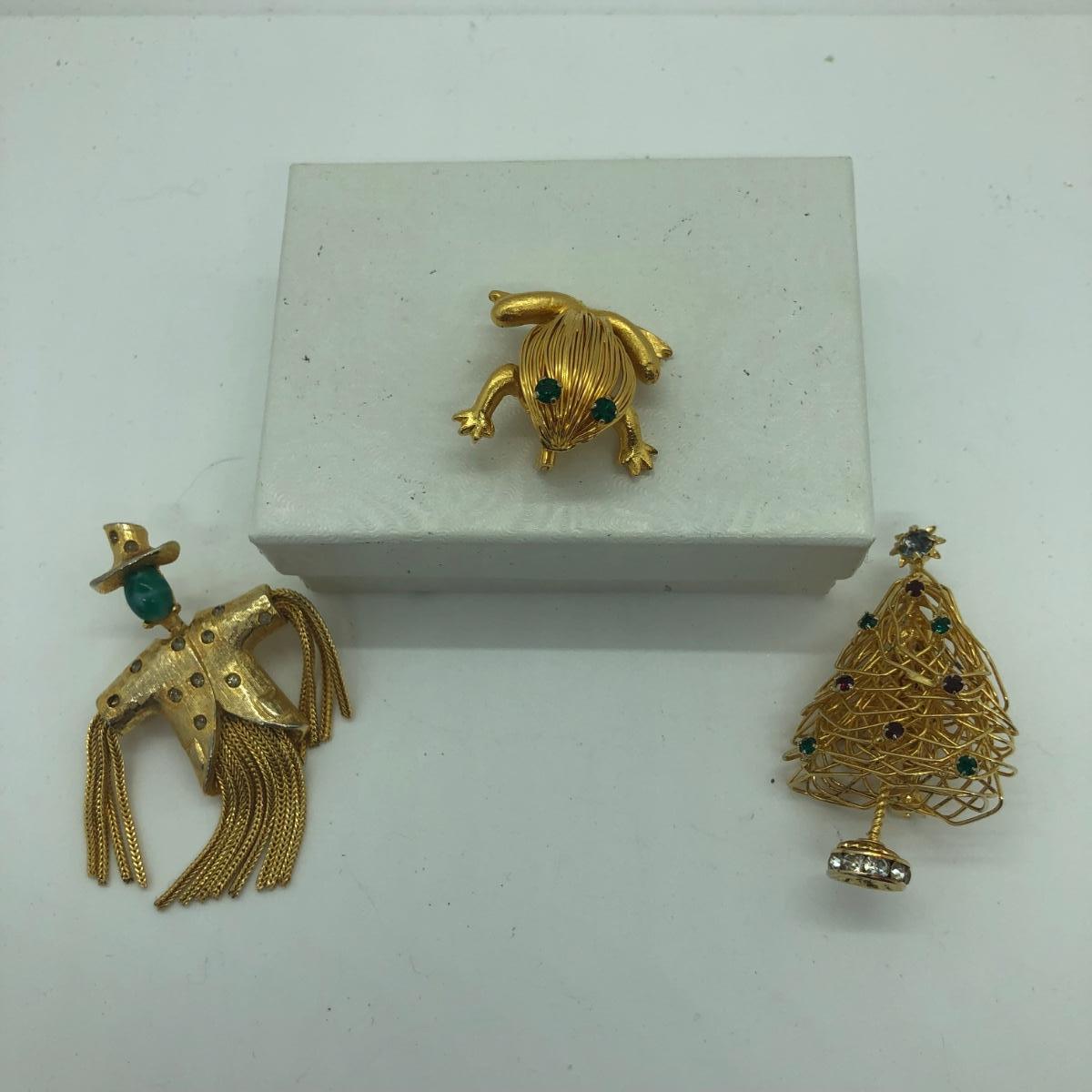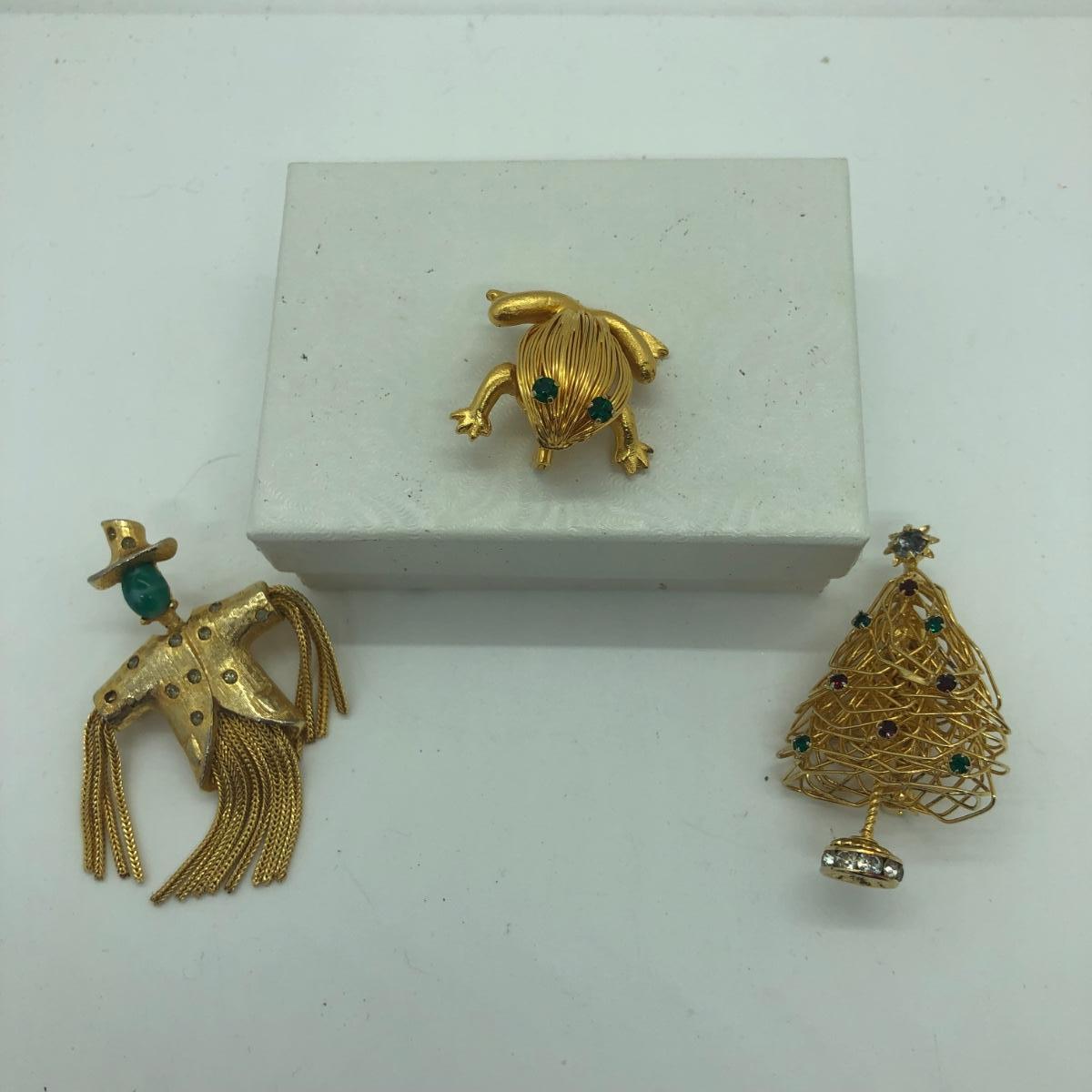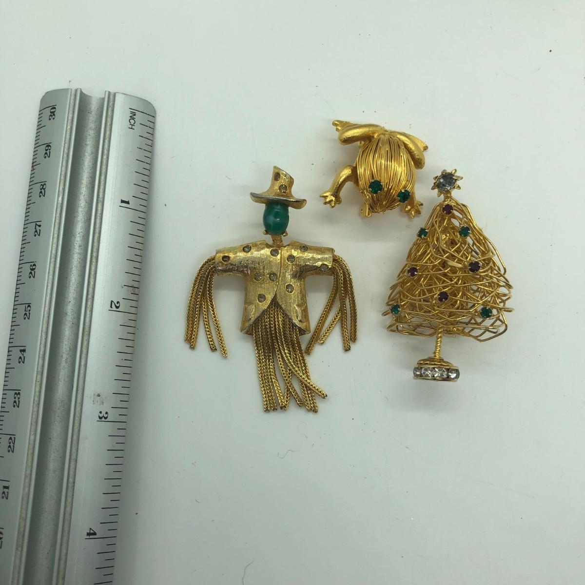 LOT 29J: Unique Gold Tone Brooches - Frog, Scarecrow & Christmas Tree