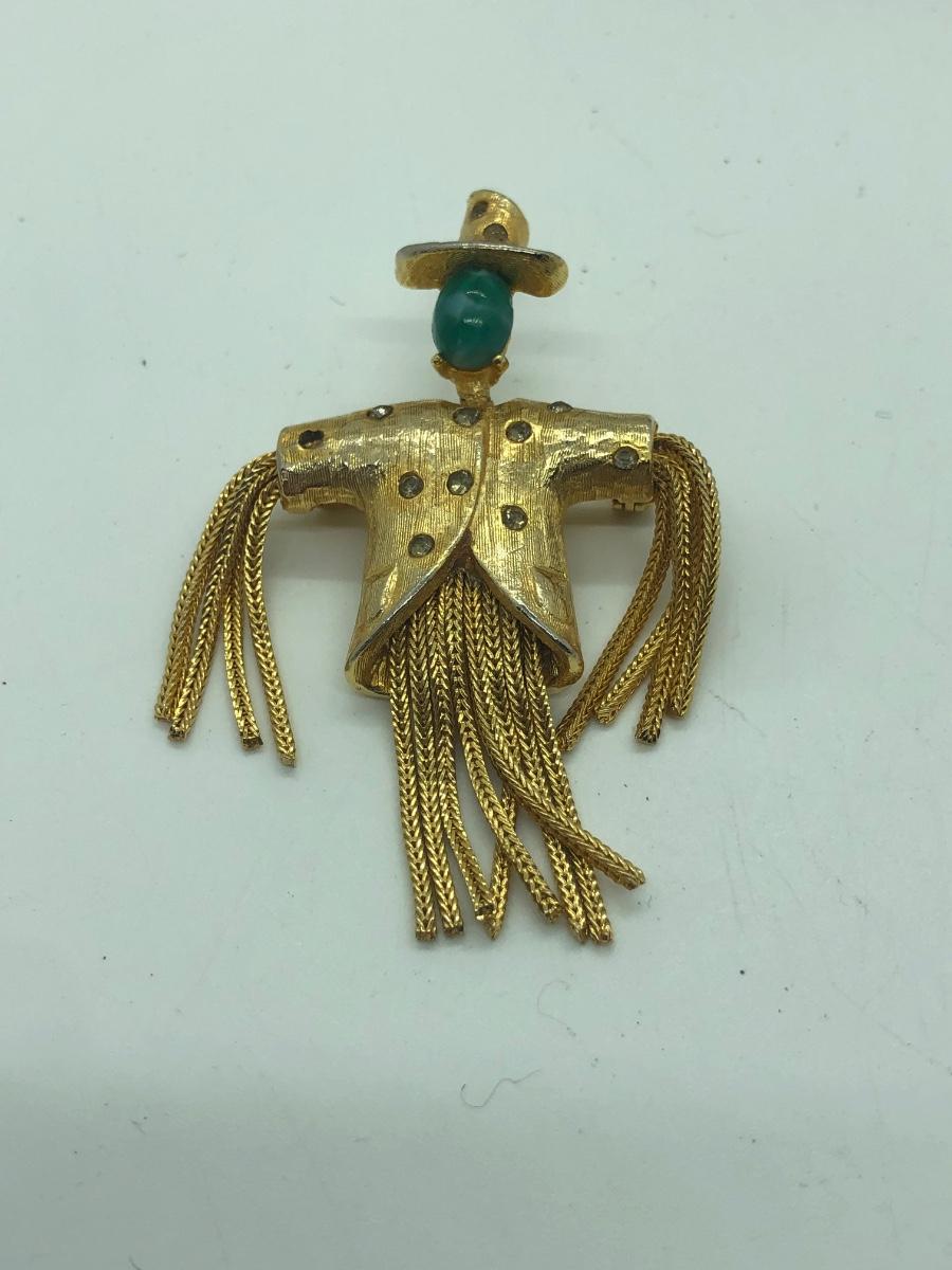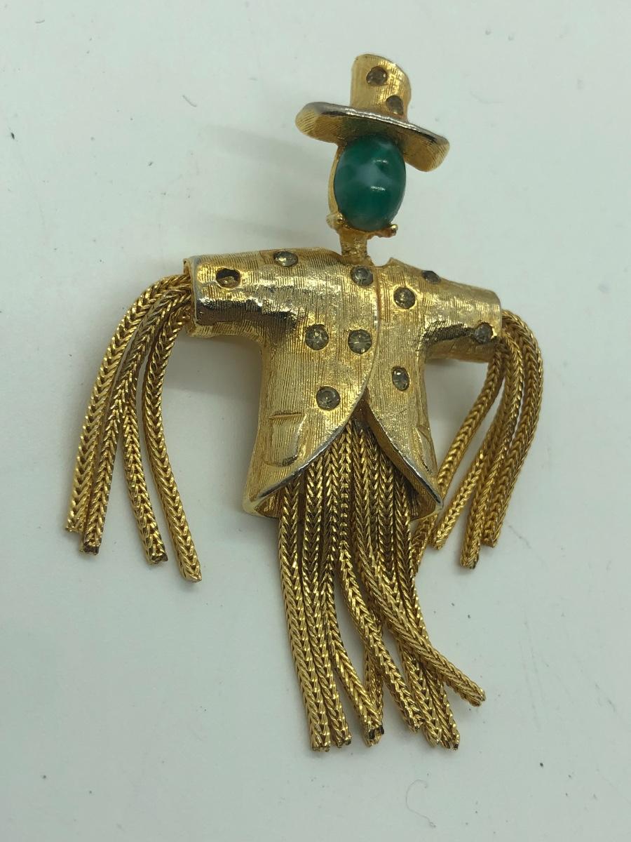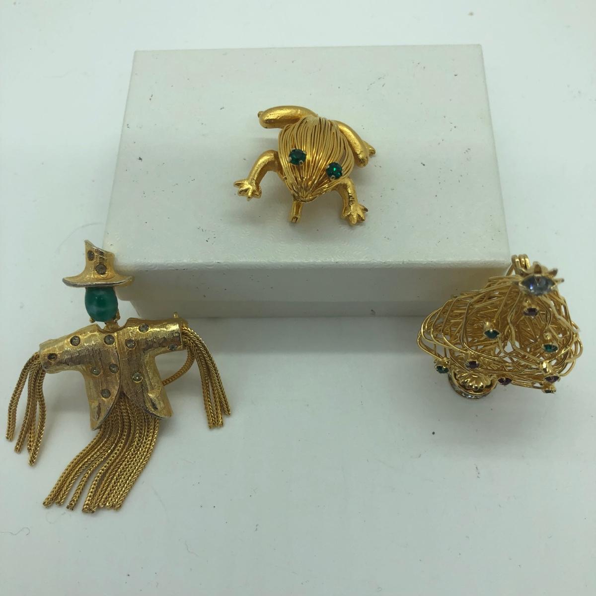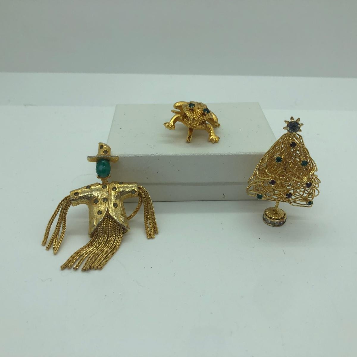 LOT 29J: Unique Gold Tone Brooches - Frog, Scarecrow & Christmas Tree