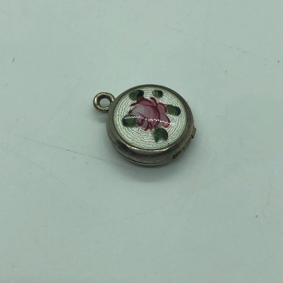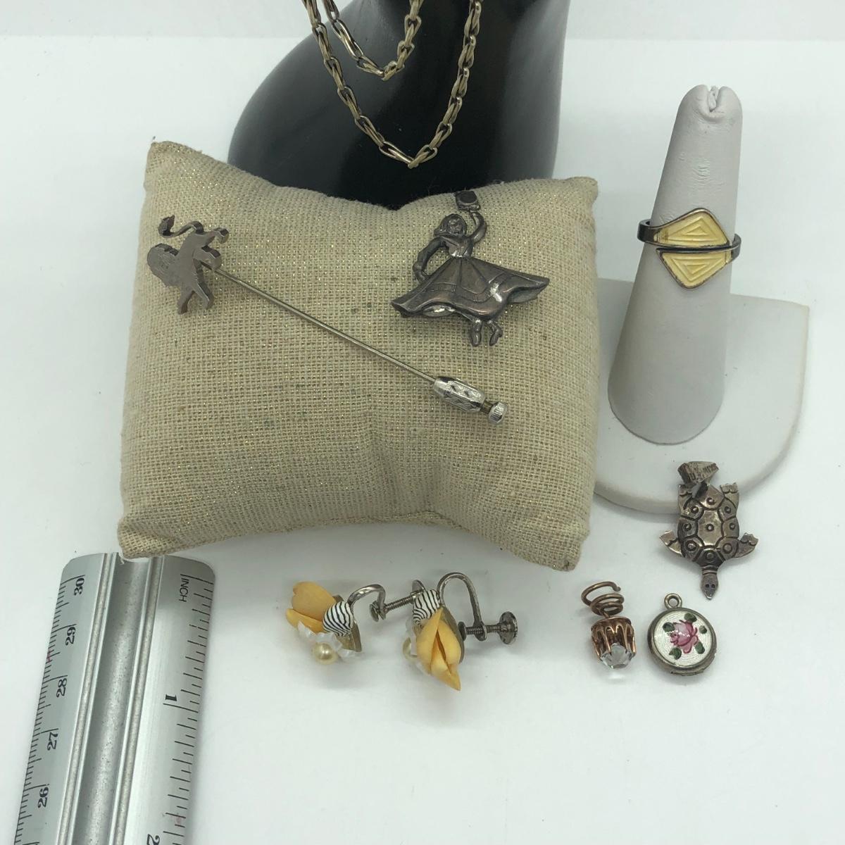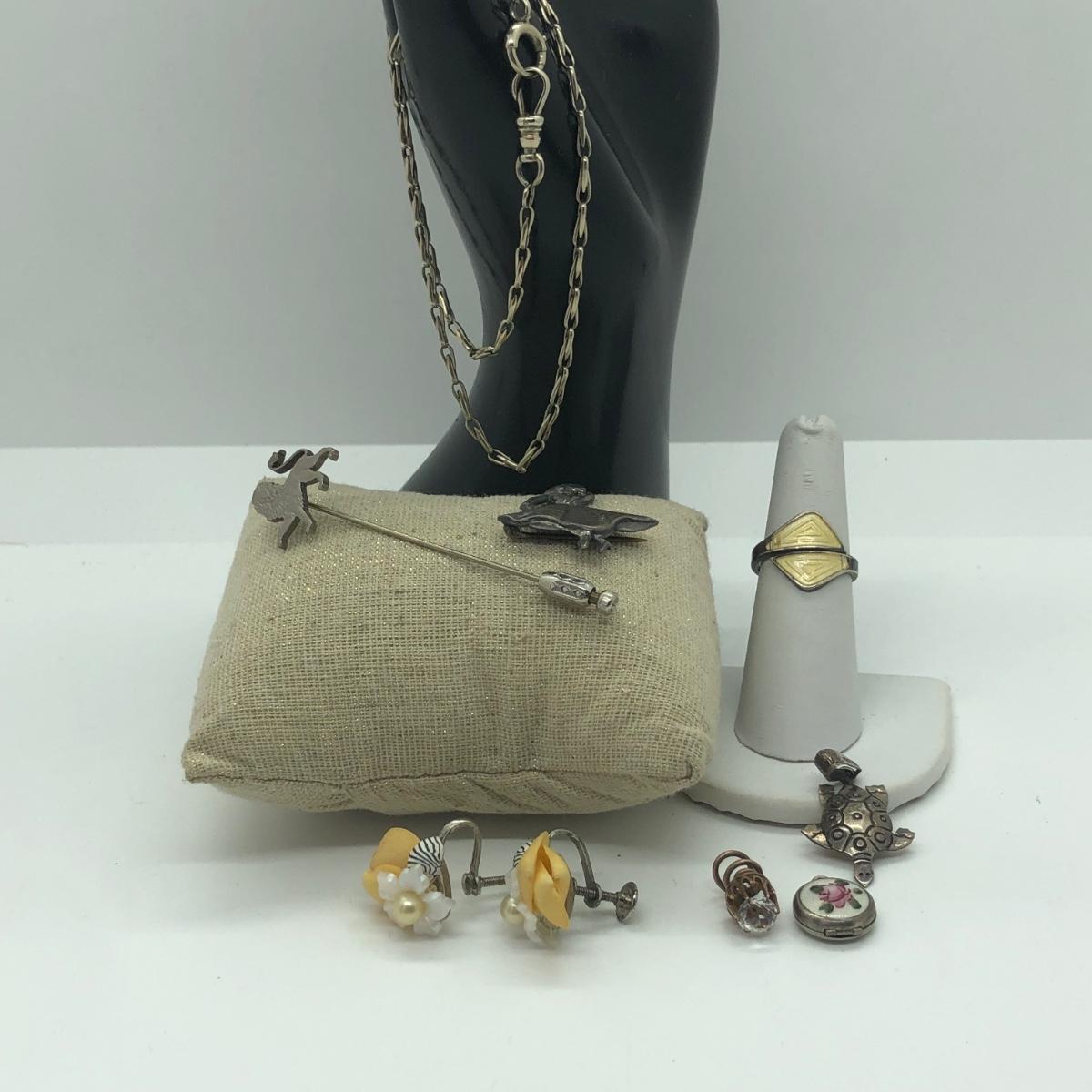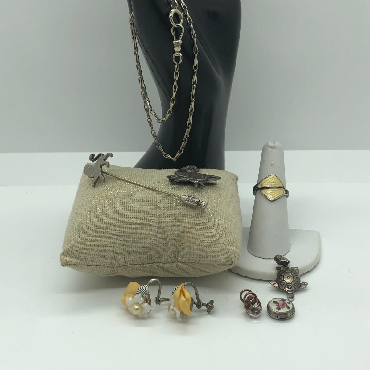 LOT 33J: Antique / Vintage Jewelry Collection - Norway Silver & Enamel Ring (Size 6.5), Sterling Mexico Turtle Pendant, Mini Enamel Rose Locket, Crystal Hair Accent, 15" Watch Chain & More